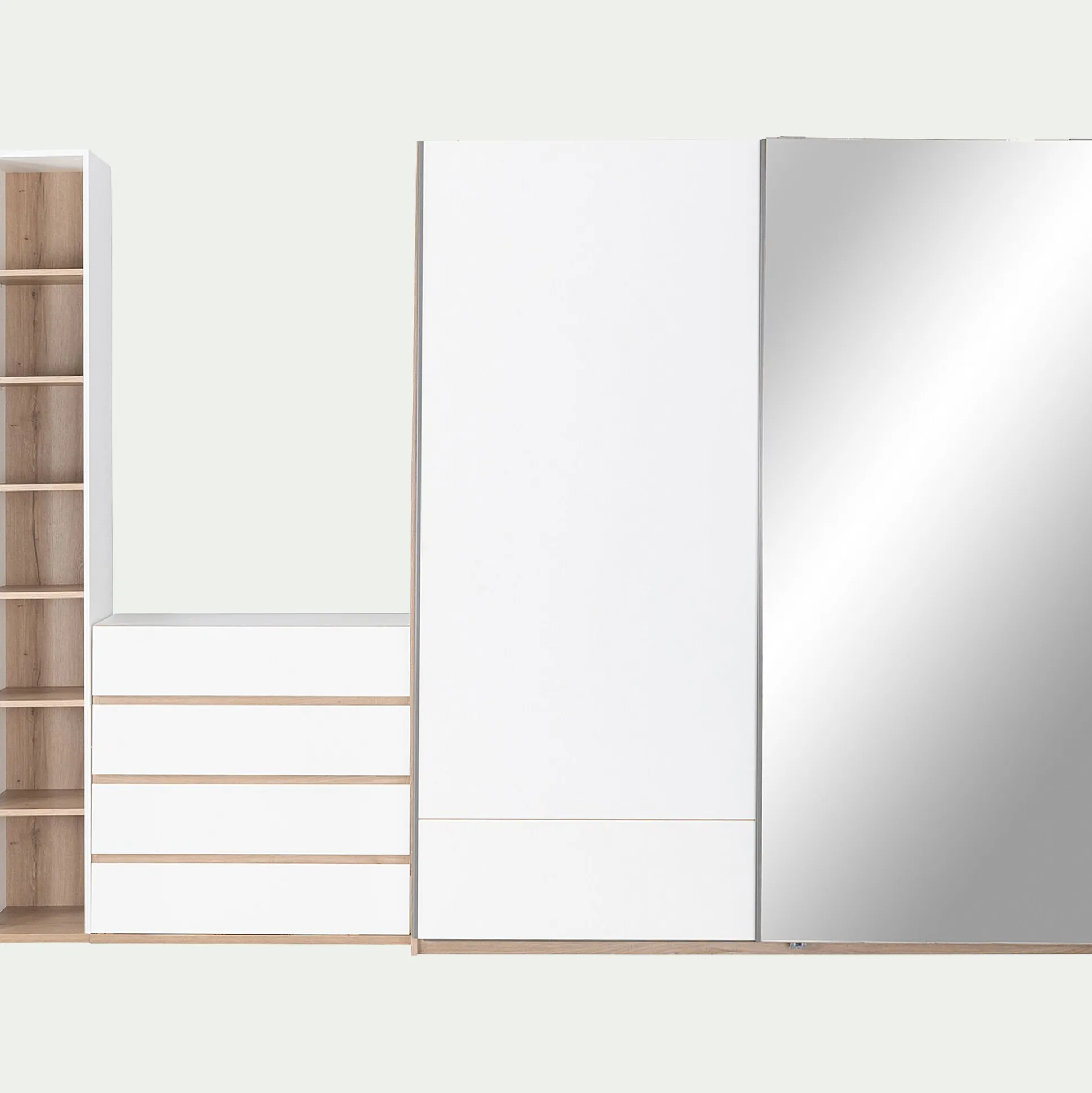 Ici, découvrez un dressing avec deux portes coulissantes, de couleur blanche. Ce meuble vous offre de beaux volumes pour y ranger vos affaires. Vous pouvez choisir cette pièce seule ou associée à un des éléments de la gamme. Chaque module est indépendant, mais ils se complètent aussi parfaitement entre eux. Ce sont des produits de qualité qui vous sont proposés, avec une finition en mélanine et une impression effet bois au toucher. Résistants, ces meubles dureront dans le temps. Le montage de ces derniers est très aisé et se fait en vertical. Les coins des modules sont découpés afin de laisser passer les plinthes et que vous puissiez placer vos meubles contre le mur.