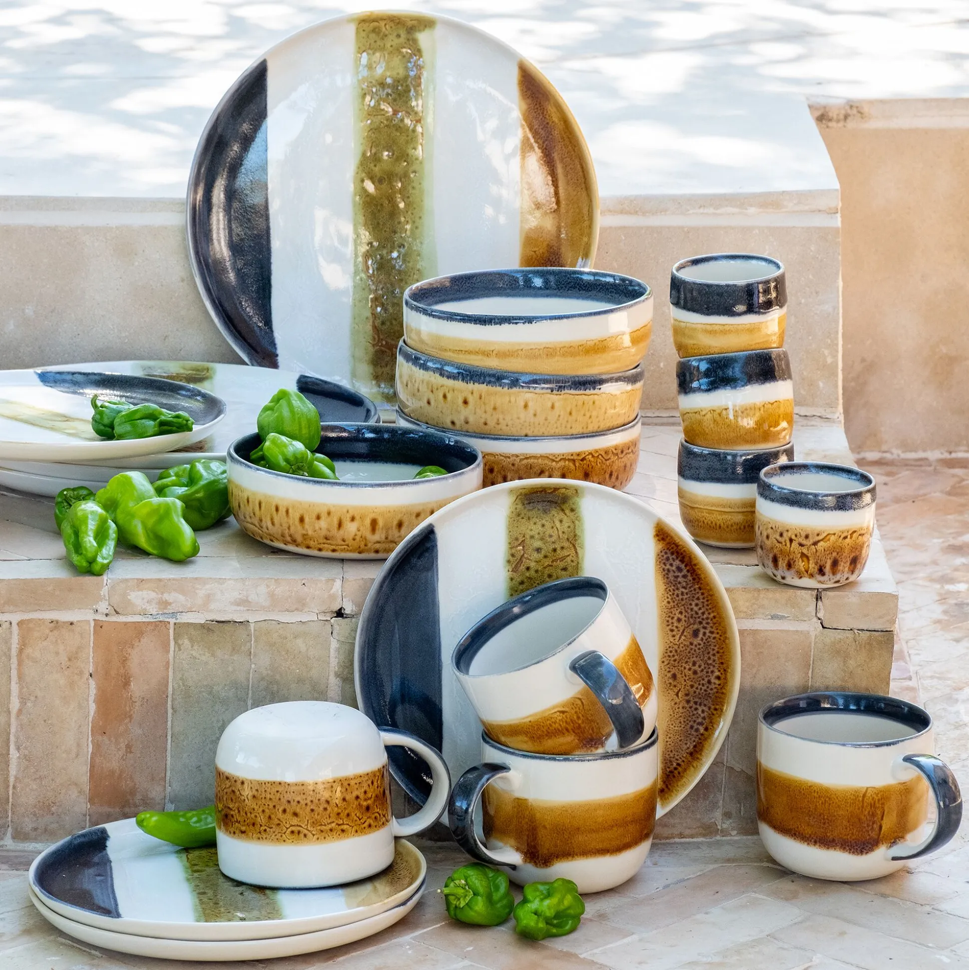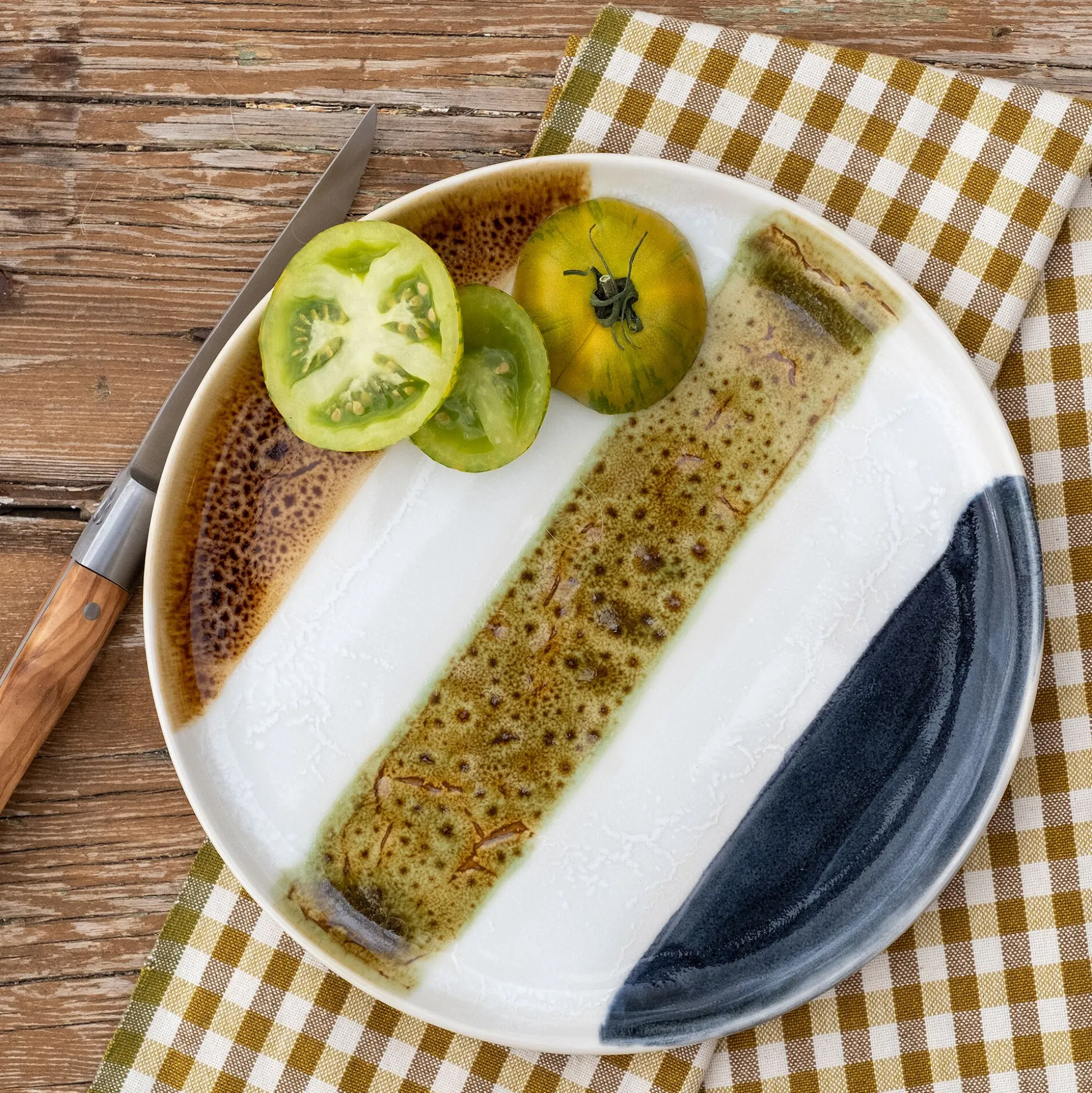 Apportez une note artistique à vos fins de repas avec cette assiette à dessert en grès, fabriquée au Portugal. Son design unique se distingue par un jeu de bandes colorées : brun moucheté, vert nuancé et noir profond; qui contraste avec un fond blanc lumineux. Idéale pour sublimer vos pâtisseries, fruits ou petites douceurs, elle mêle authenticité et modernité avec élégance. Chaque pièce est légèrement différente, soulignant son caractère singulier.