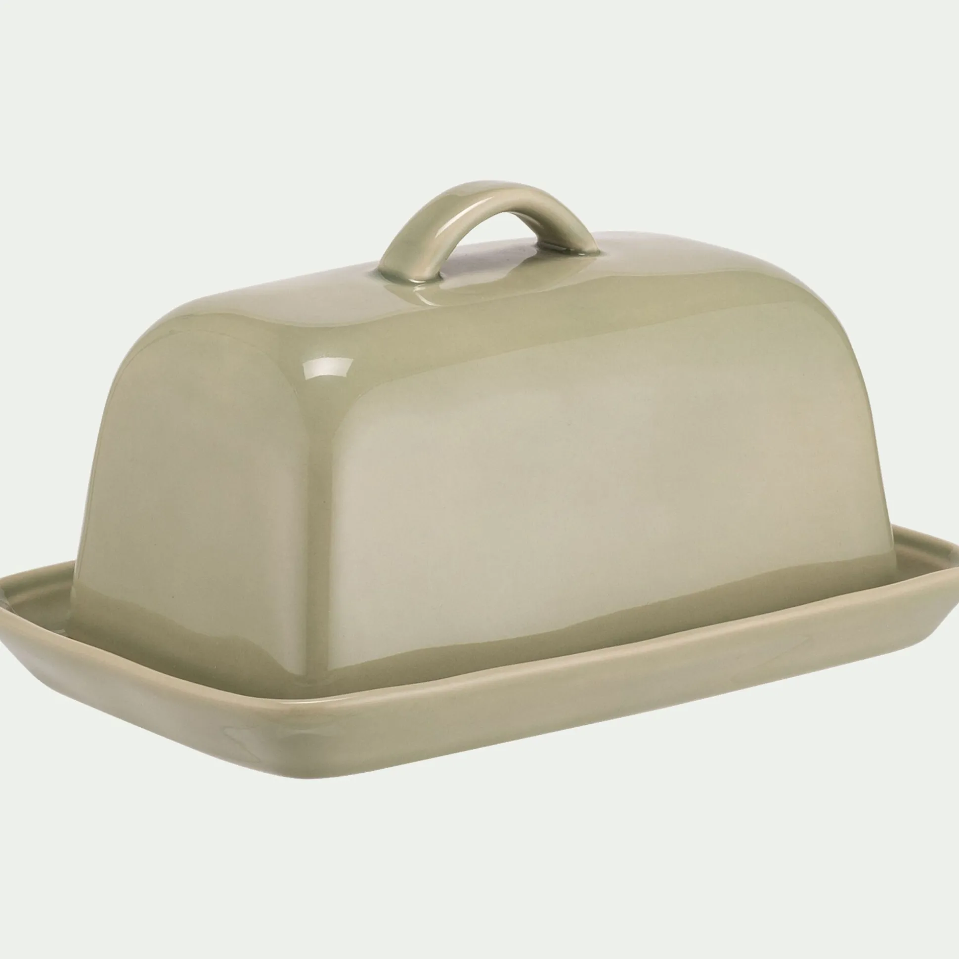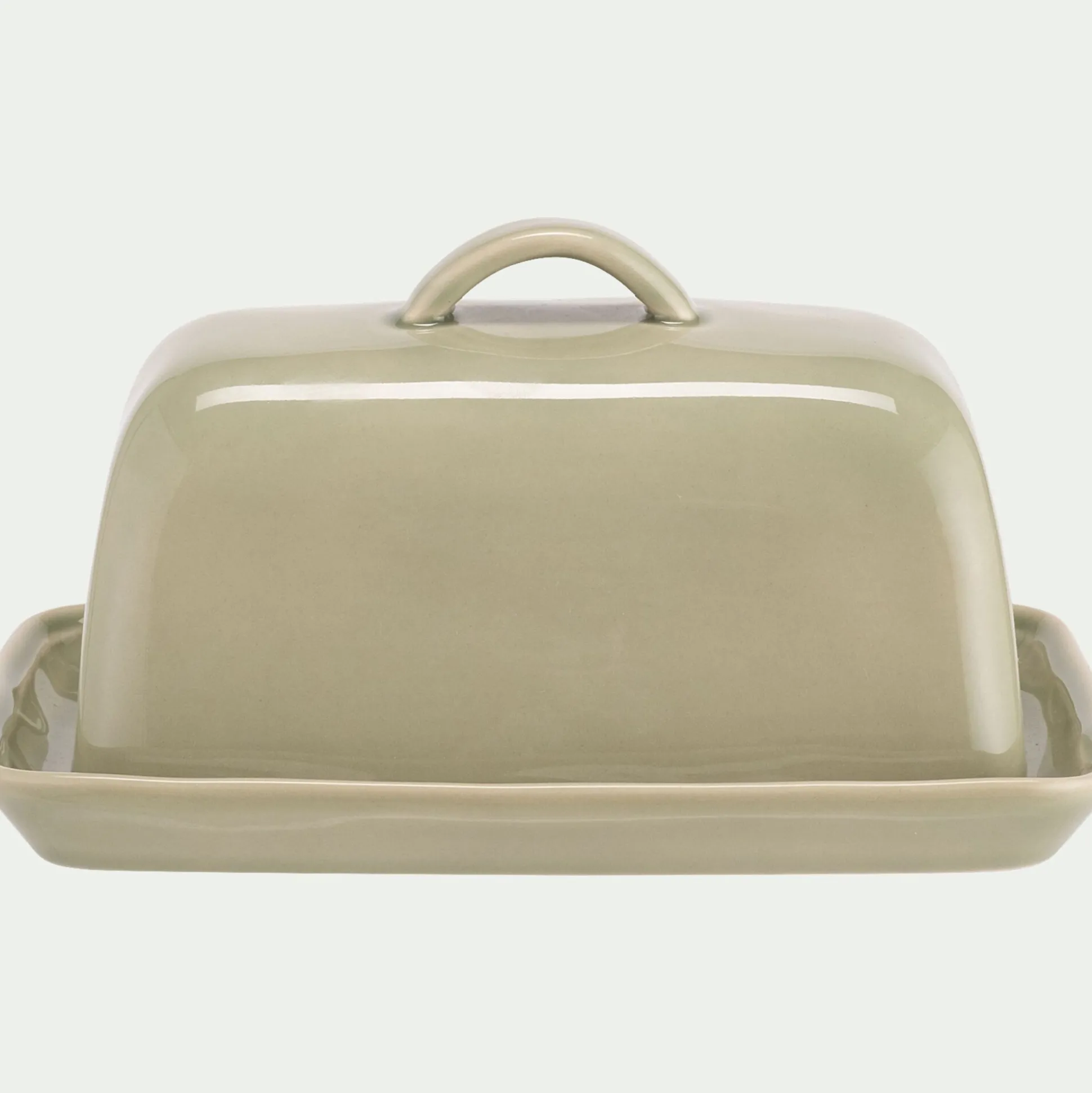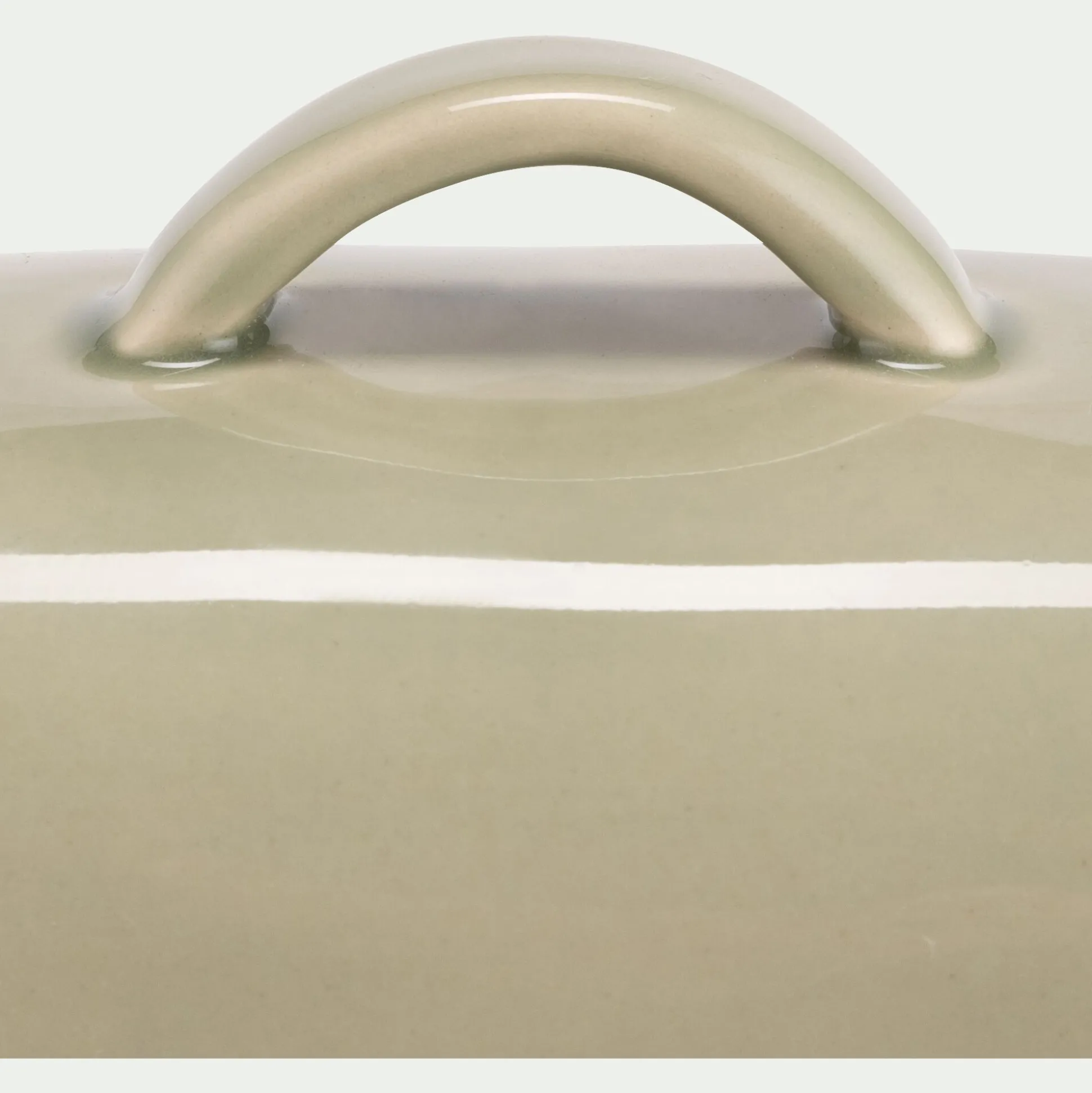 Fabriqué en grès, ce beurrier allie charme brut et praticité au quotidien. Il se compose d’une coupelle rectangulaire aux angles arrondis et d’un couvercle assorti, muni d’une petite anse pour une prise en main facile. Son design épuré protège le beurre tout en préservant ses saveurs. Habillé d’un coloris vert doux et lumineux, ce beurrier en grès apporte une touche fraîche et délicate à la table du petit-déjeuner comme aux repas du quotidien.