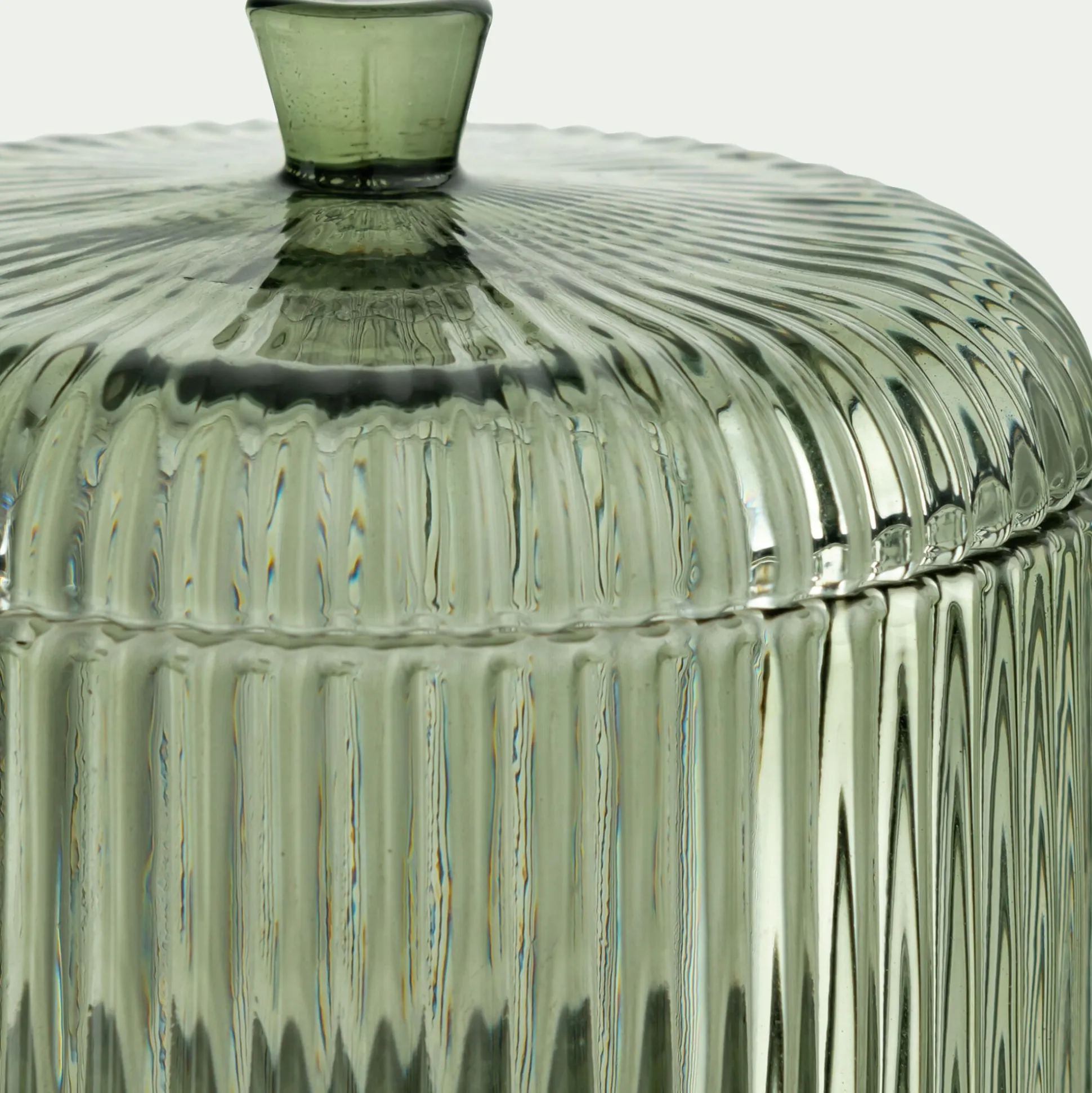Avec sa teinte verte et ses délicates nervures, cette boîte déco en verre allie fonctionnalité et élégance. Son couvercle assorti permet de dissimuler bijoux, cotons ou petits objets du quotidien, tout en protégeant son contenu. D’un diamètre de 10 cm, elle trouve facilement sa place sur une étagère, une coiffeuse ou dans une salle de bain. Un objet déco qui capte la lumière et apporte une touche raffinée et légèrement vintage à la décoration.