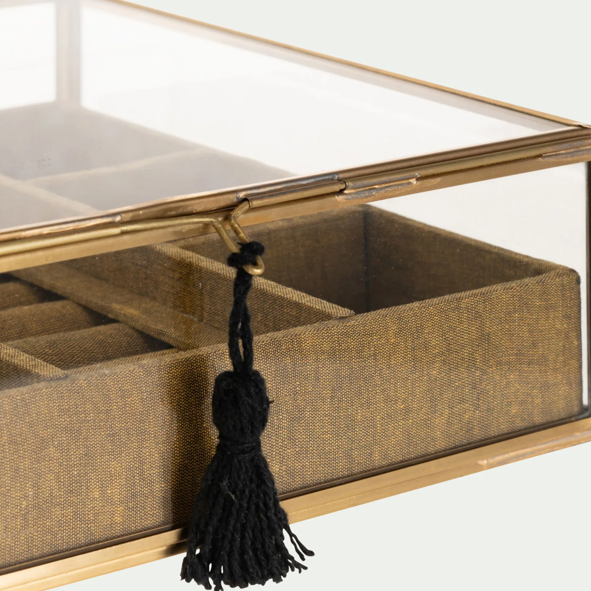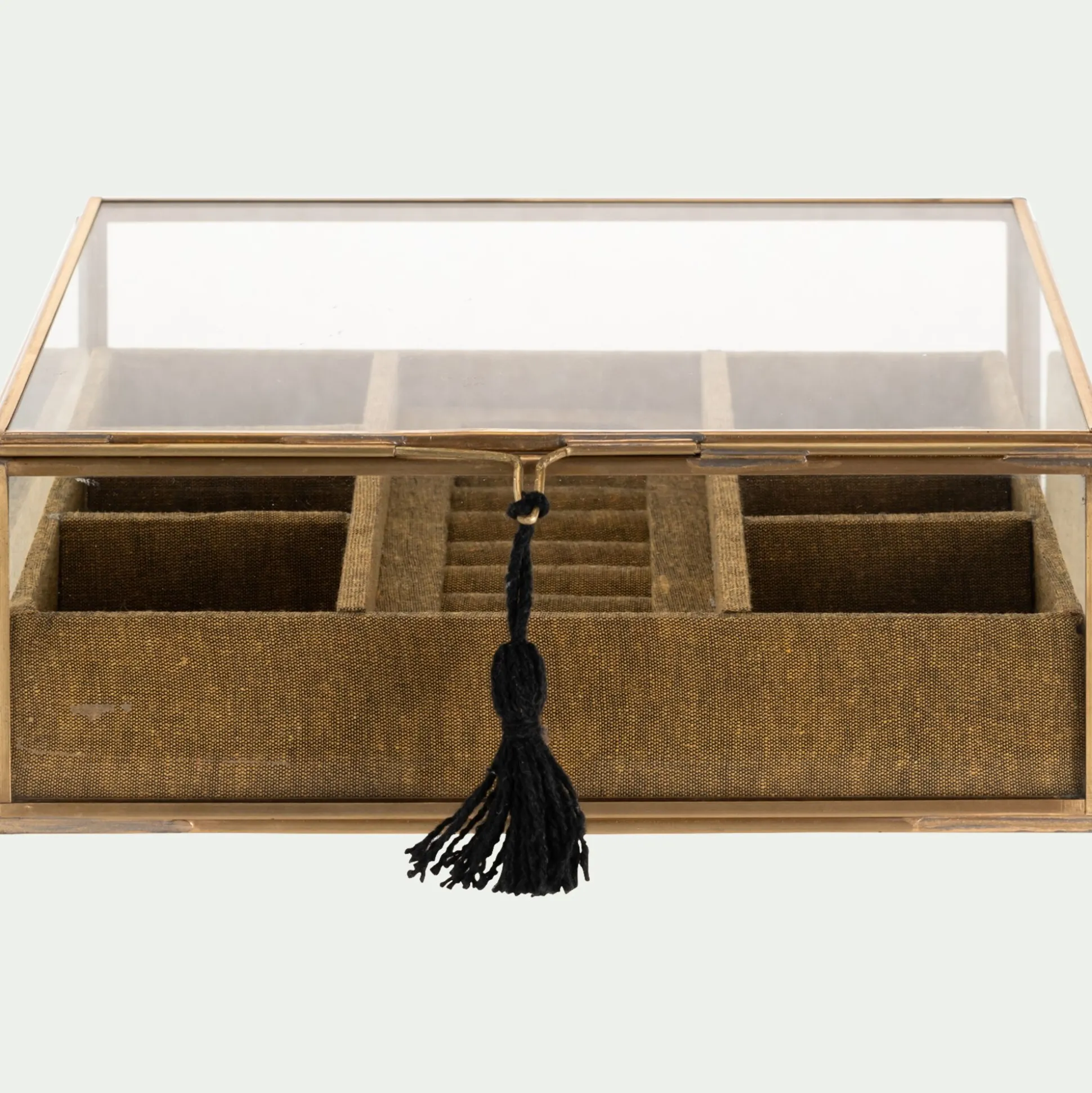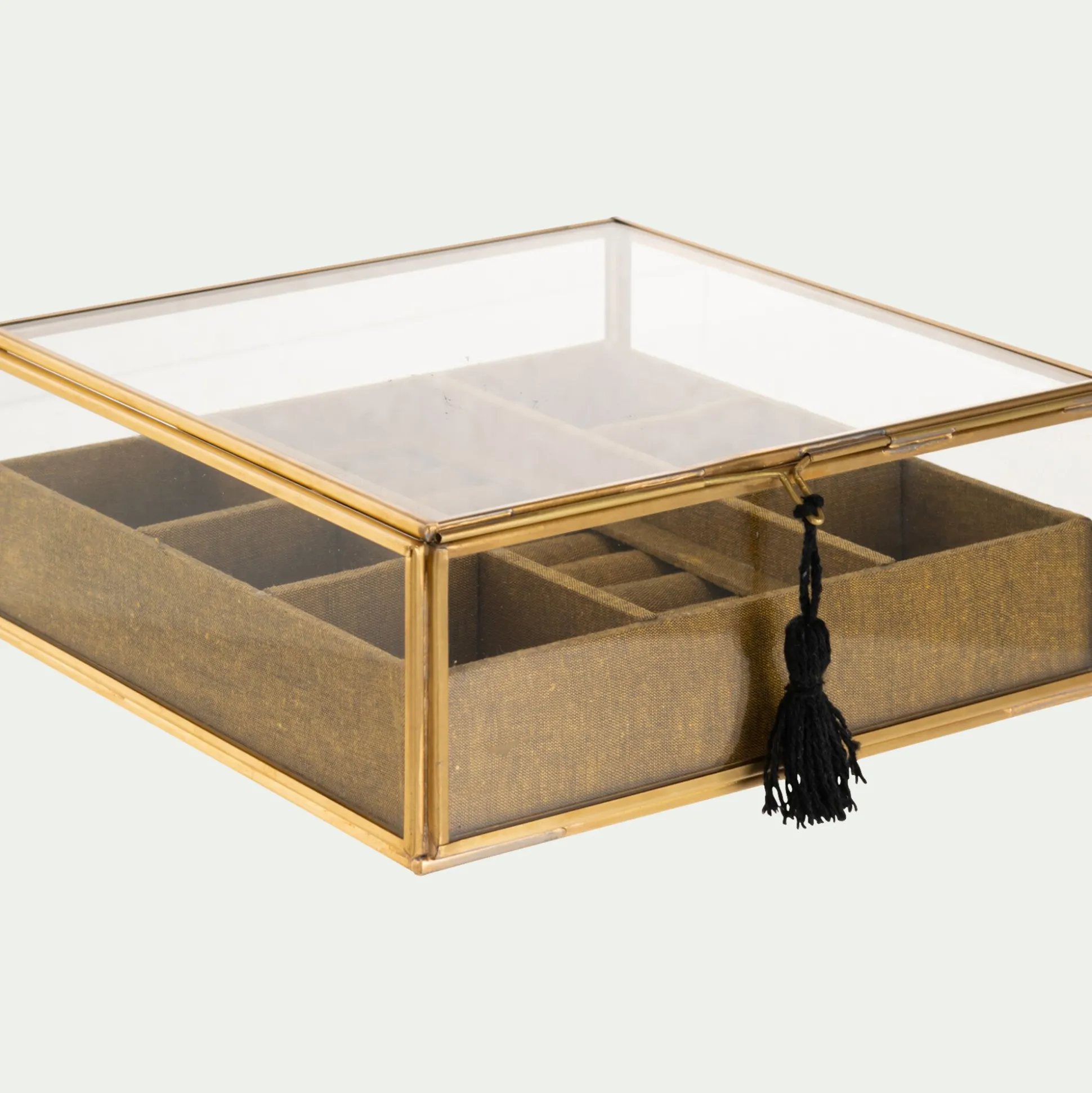 Cette jolie boite carrée est idéale pour y déposer vos bijoux afin qu’ils soient toujours rangés. Organizer votre chambre et ne perdez plus aucun de vos bijoux préférés grâce à ses petits rangements. Elle est composée de plusieurs compartiments qui vous permettent de classer vos bagues, colliers, bracelets et boucles d’oreilles. En laiton et en verre, elle donne un style raffiné à votre décoration. Posée sur votre table de nuit ou encore sur votre coiffeuse, elle apporte du cachet à vos meubles en rehaussant les designs les plus simples. Ce rangement de 21×21 cm est à la fois pratique et esthétique et donnera du charme à votre pièce.