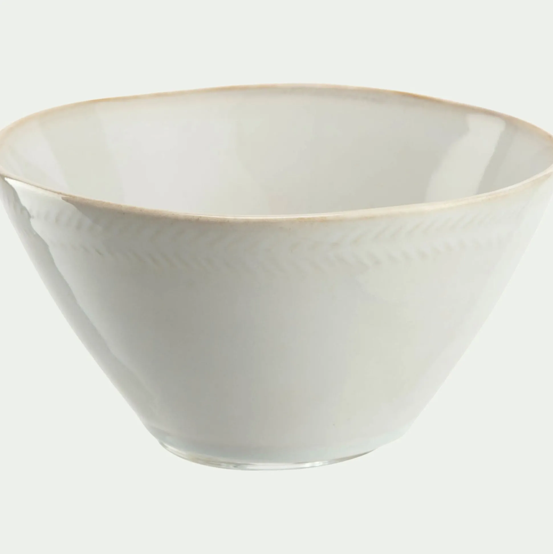 Sublimez vos moments gourmands, du petit-déjeuner à l’apéritif, avec ce bol en grès au style raffiné. Son design épuré, orné d’un liseré discret et d’un motif beige sur un fond blanc ventoux, met en valeur vos yaourts fruités, vos olives savoureuses et toutes vos préparations. Explorez notre gamme en grès pour une table pleine d’harmonie, à toute heure.
