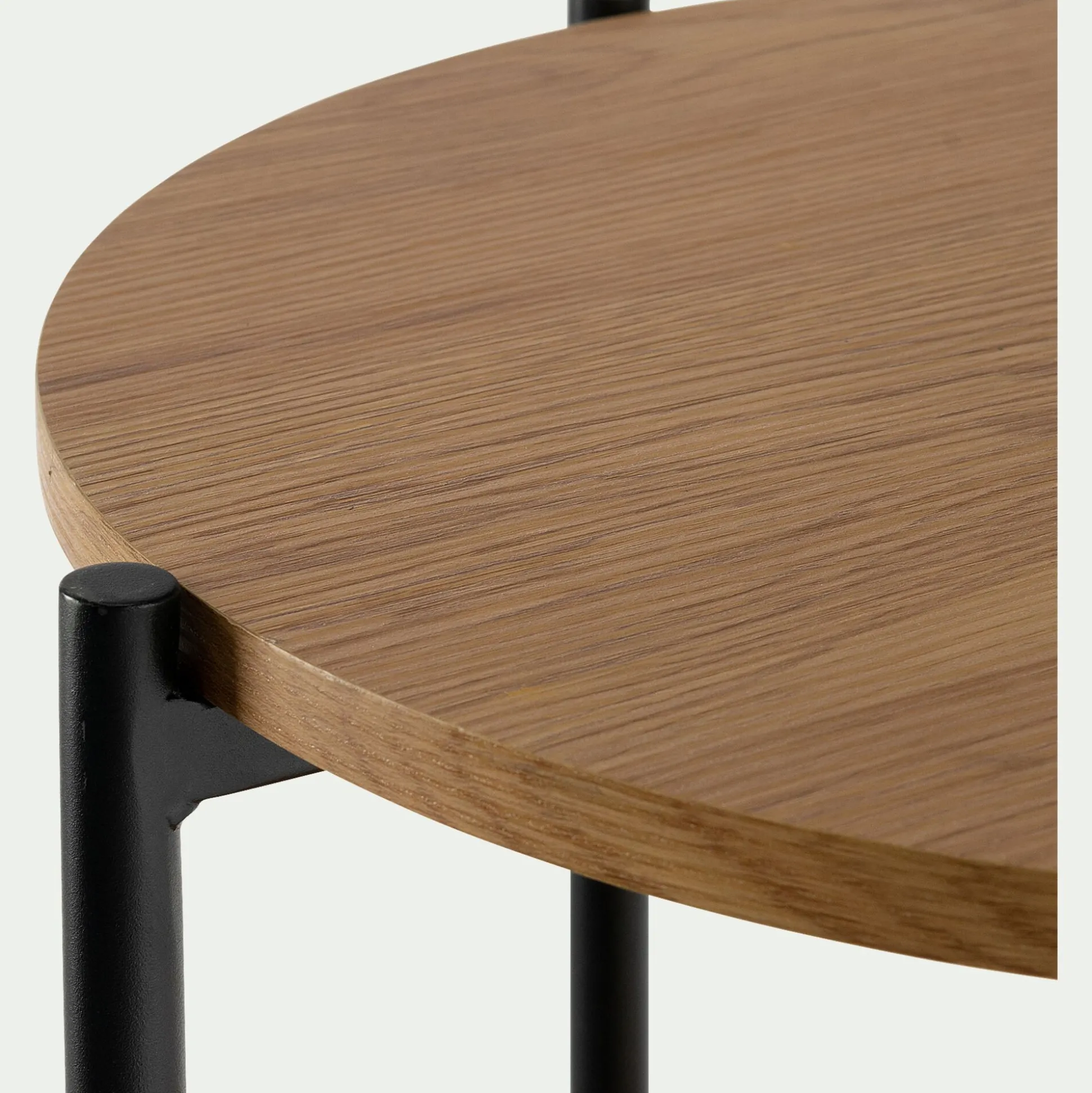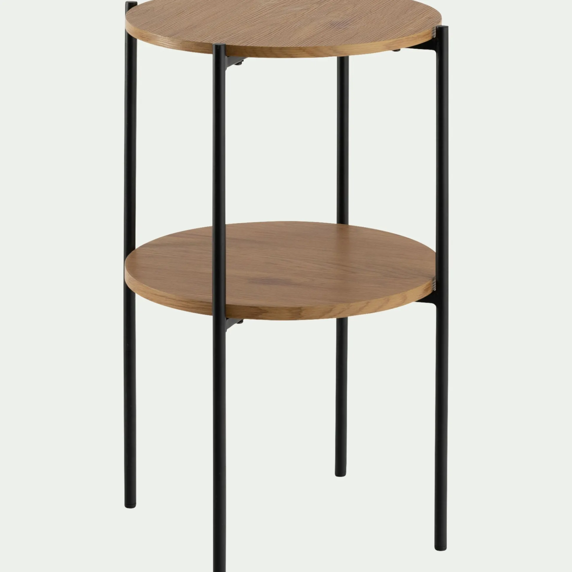 Ce bout de canapé fixe présente deux niveaux de plateau. Ainsi, vous pouvez y ranger aussi bien vos télécommandes et magazines que de la décoration, comme un vase, une plante ou une bougie. Espace de rangement, présentoir, table de chevet… Ce bout de canapé en bois prend la fonction que vous lui donnez. L’imitation chêne s’associe au métal pour un look industriel, très tendance. Ce bout de canapé rond est un excellent basique autour duquel façonner votre style.