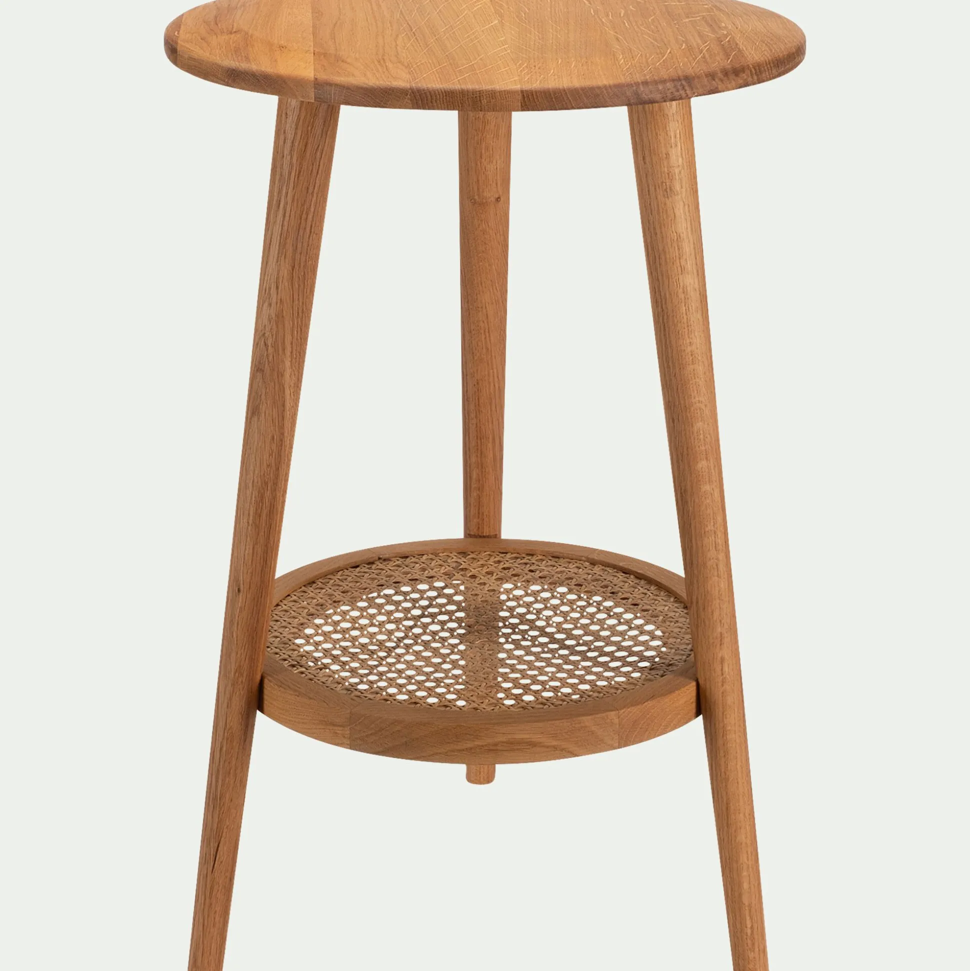 Placée au bout du canapé, cette petite table ronde vous sert de table d’appoint pour garder à portée de main vos télécommandes et autres objets du quotidien. Confectionné dans des matériaux nobles, ce bout de canapé présente un plateau supérieur en chêne massif et un plateau inférieur en cannage. Le mélange des styles donne vie à un meuble élégant, d’inspiration naturelle. Ce bout de canapé en bois massif peut être complété d’une lampe ou d’une plante verte, objets déco qui révèleront toute la beauté des finitions.