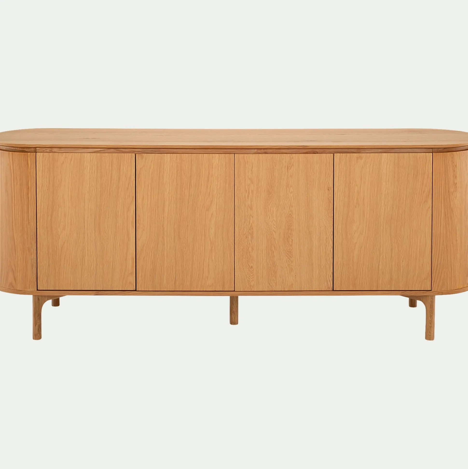 Découvrez ce magnifique buffet en bois au design intemporel, idéal pour sublimer votre intérieur. Ce buffet bas, avec sa forme ovale et ses angles arrondis, ajoute une touche de douceur et de sérénité à votre espace de vie. À la fois esthétique et fonctionnel, il est doté de quatre portes battantes et de deux étagères intérieures, offrant un espace de rangement généreux et bien organisé.
