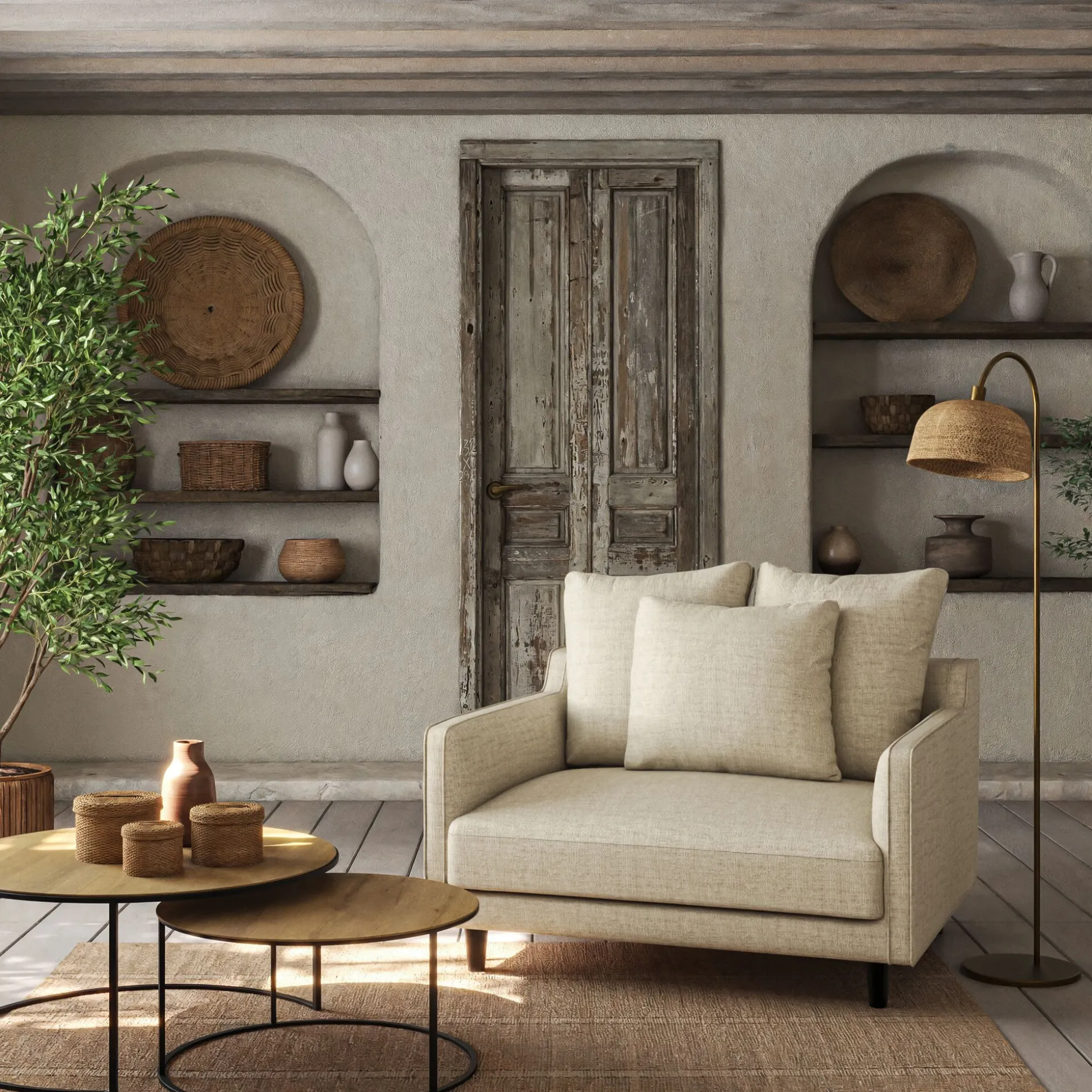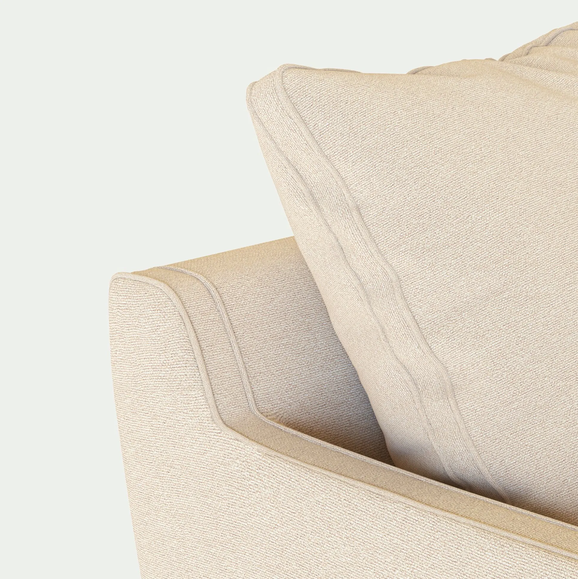 Assise et dossier : Assise en mousse polyuréthane densité 30kg/m3 et couette en fibre polyester. Coussins dossier garnissage plumes d’oies et fibres polyester, 2 coussins de 60x60cm, 1 coussin de 50x50cm.