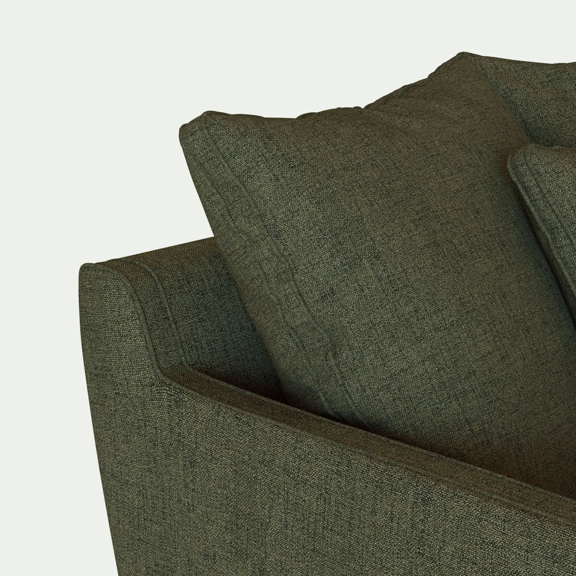 Assise et dossier : Assise en mousse polyuréthane densité 30kg/m3 et couette en fibre polyester. Coussins dossier garnissage plumes d’oies et fibres polyester, 3 coussins de 60x60cm, 2 coussins de 50x50cm.