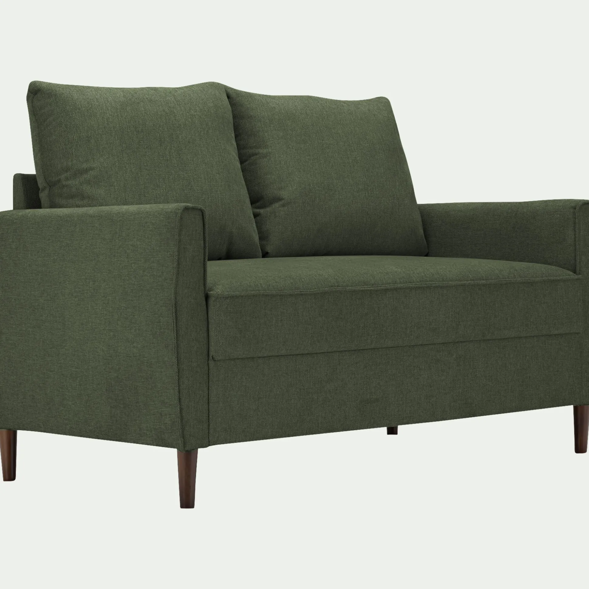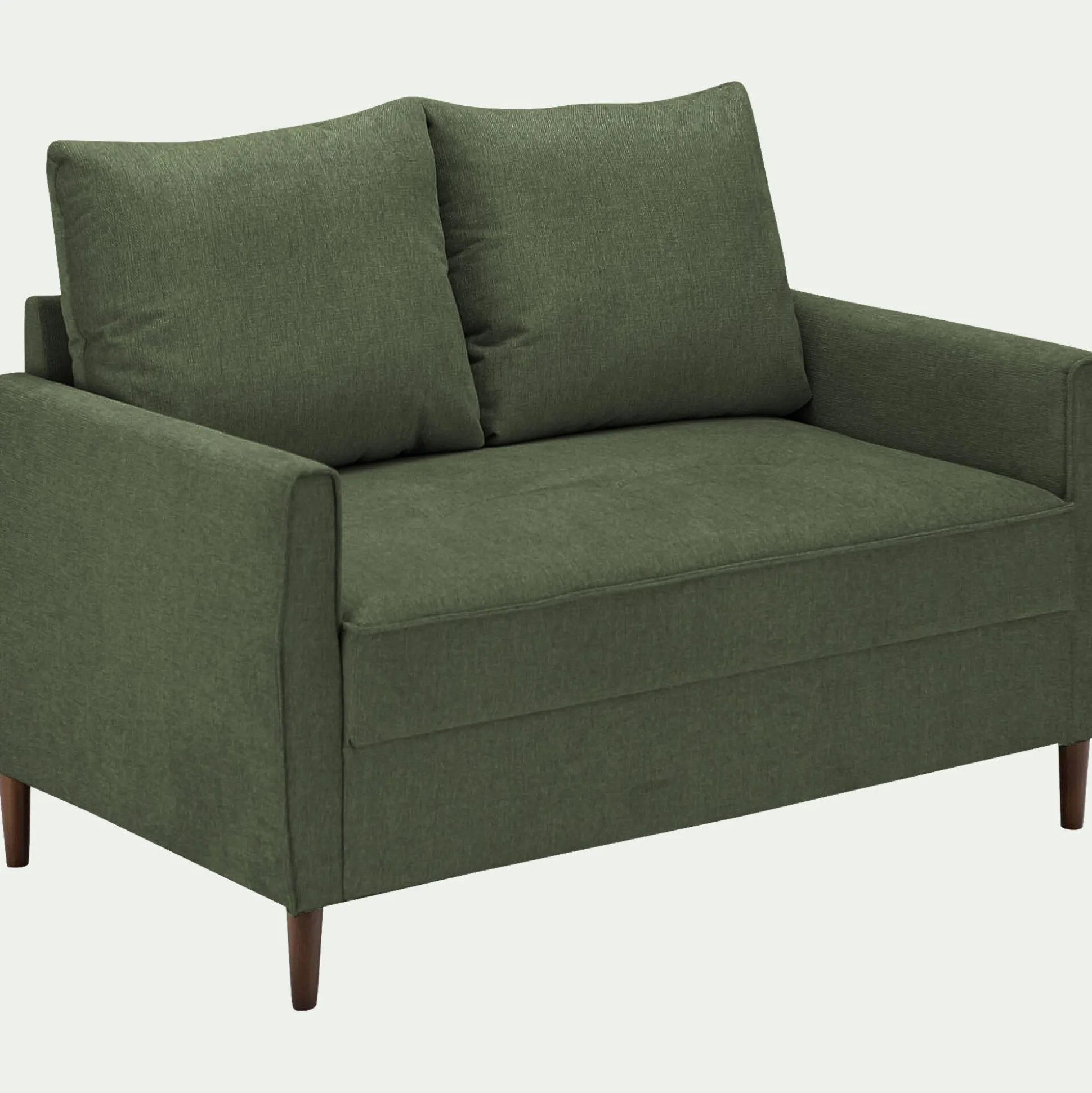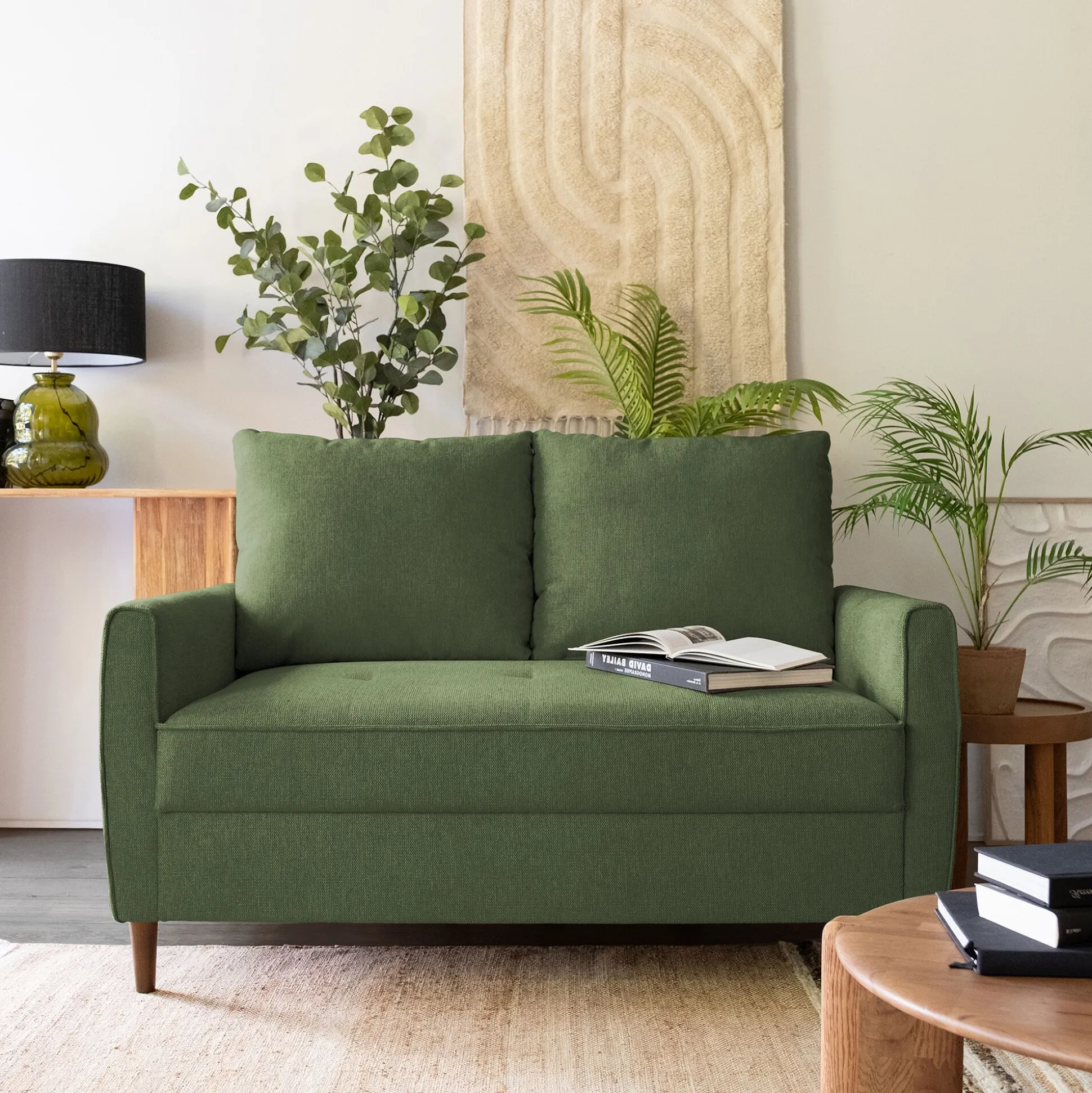 Pensé pour s’adapter à chaque intérieur, ce canapé 2 places permet de vous détendre sans prendre une grande place dans la pièce, il se place selon les envies et l’agencement de votre intérieur. Sa structure en bois accueille une assise en mousse généreuse, complétée par trois coussins de dos qui offrent un soutien optimal aux lombaires et aux épaules. Son revêtement en tissu vert, à la fois profond et naturel, habille ce canapé d’une élégance intemporelle. Il repose sur des pieds en bois de hêtre qui renforcent son allure chaleureuse et naturelle. Compact avec ces 132 cm de long, ce canapé 2 places fabriqué en Roumanie est idéal pour conjuguer style et confort au quotidien, même dans un petit salon.