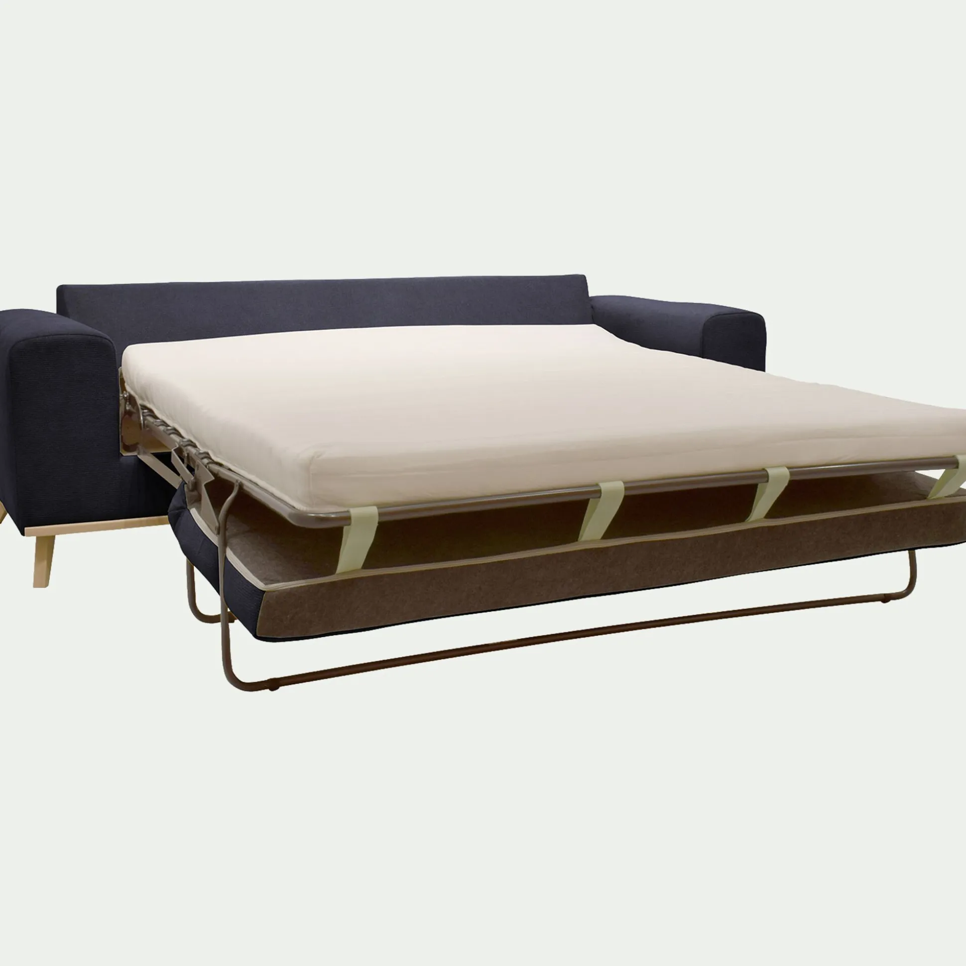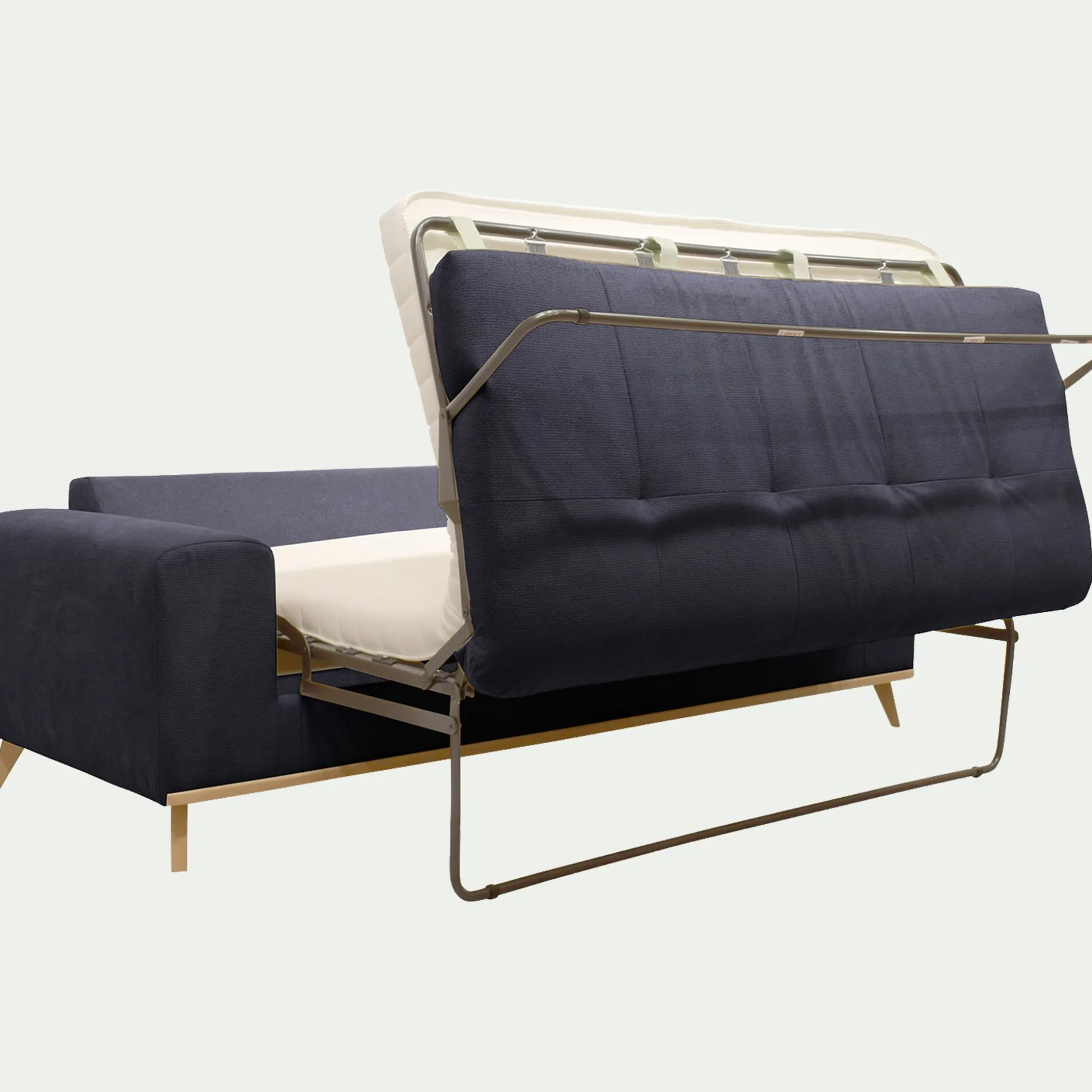 Le canapé 3 places convertible Capia allie confort, style et praticité. Ce canapé est revêtu du tissu Crown dans notre coloris bleu calabrun, unique et apaisant. De jour, ce canapé droit offre une assise spacieuse pour 3 personnes. Le soir venu, il se déplie en quelques secondes grâce à son système express et révèle un couchage de 140×188 cm. Son matelas intégré de 10 cm d’épaisseur est parfait pour un usage occasionnel, par exemple pour recevoir famille ou amis pour la nuit. Son tissage Oeko-tex apporte douceur et résistance, parfait pour une utilisation quotidienne. Son design repose sur une structure en pin massif et des pieds en hêtre massif, gage de solidité et de durabilité. Les coussins de dos déhoussables facilitent l’entretien. Une fabrication française qui conjugue esthétique et fonctionnalité.