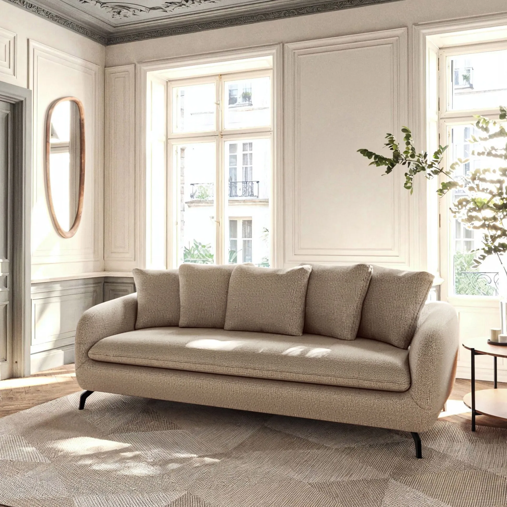 Un joli canapé 3 places convertible en tissu pour profiter agréablement de votre salon. Un look contemporain et accueillant, sublimé par un piétement original en acier noir. Vous apprécierez la forme du dossier et des accoudoirs qui vous offrent un maintien optimal de votre dos pour un confort d’assise exceptionnel. De plus, ce canapé se déplie pour vous offrir un lit d’appoint qui vous permettra d’accueillir vos invités. Un canapé fabriqué en France, dans des ateliers proches de la ville de Bourge, qui incarne l’excellence du savoir-faire français. Un coloris beige roucas qui apporte une note citadine et raffinée à votre décoration de salon.