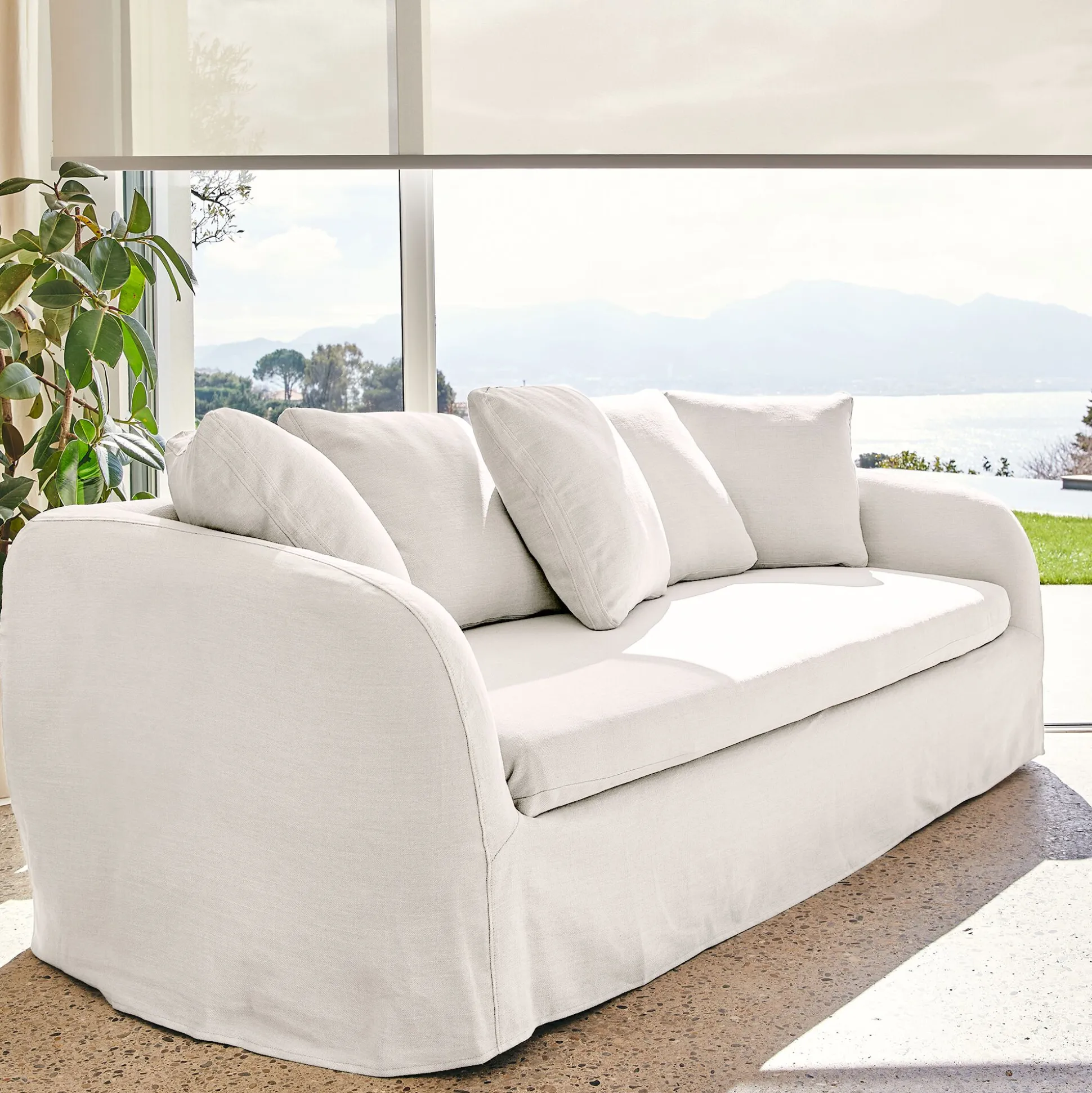 Le canapé Marcel est une ode à la ville de Marseille et à son patrimoine. Son nom fait écho à la provence en rendant hommage à sa culture. Conçu pour 3 personnes, ce canapé au design singulier donne de l’allure à votre salon tout en offrant une grande assise. Ses multiples coussins font de lui un canapé plus douiller et chaleureux. Son tissu en lin, son design en rondeur et sa jupe lui donnent une élégance incontestable. Le lin, un tissu naturel symbole de pureté et de confort, vous offre une douceur qui vous bercera au fil des saisons. Extrêmement résistant et réputé pour ses qualités thermorégulatrices, il vous permettra de vous lover au mieux tout au long des saisons et pendant plusieurs années. En lin blanc, ce canapé noble est un éloge à la Méditerranée.