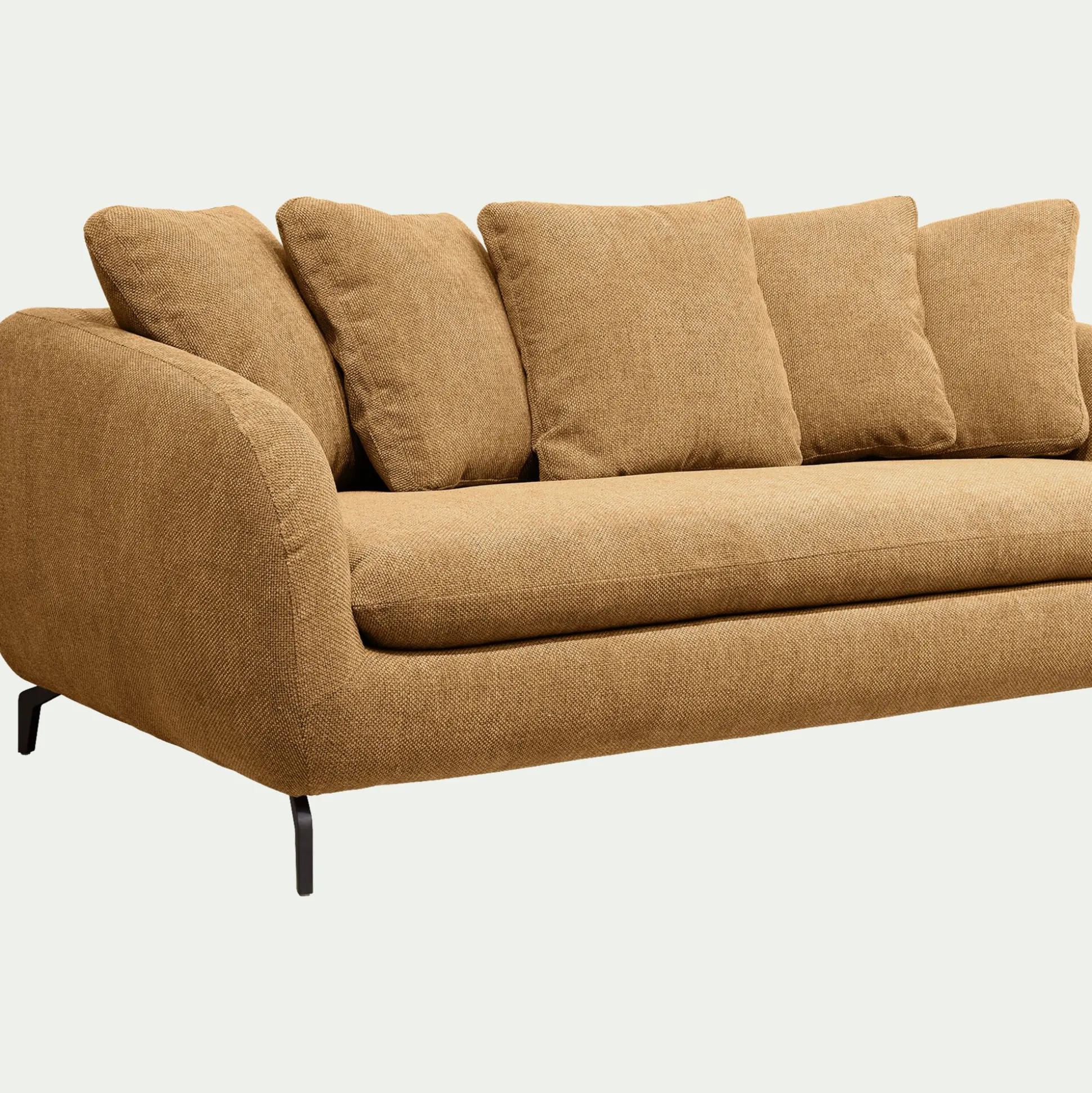 Un joli canapé 3 places fixe en tissu pour profiter agréablement de votre salon. Un look contemporain et accueillant, sublimé par un piétement original en acier noir. Vous apprécierez la forme du dossier et des accoudoirs qui vous offrent un maintien optimal de votre dos pour un confort d’assise exceptionnel. Un canapé fabriqué en France, dans des ateliers proches de la ville de Bourge, qui incarne l’excellence du savoir-faire français. Un coloris bronze qui apporte une note lumineuse et chaleureuse à votre décoration de salon.