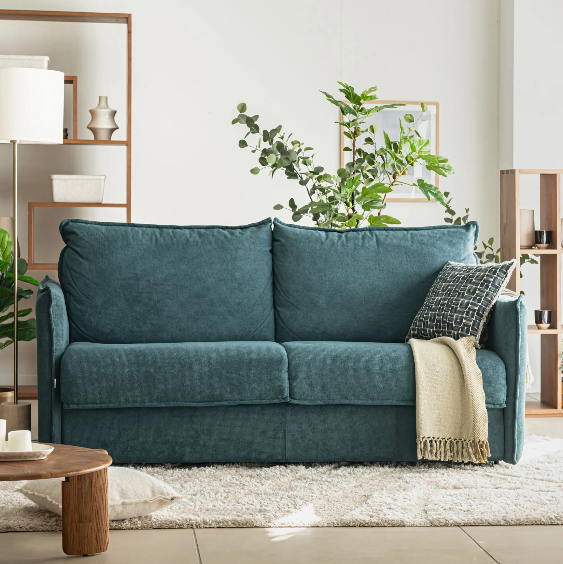 Le canapé Moya offre un soutien optimal adapté à chaque partie du corps. Ce canapé 4 places convertible à la fabrication italienne, confectionné à partir du savoir faire local, vous permet de vous détendre dans une pièce hautement qualitative. Le soir, dépliez votre canapé et transformez-le en un lit au couchage 160×195 cm d’une densité de 35kg/m3 qui vous permettra d’accueillir famille et amis. Très confortable, ce canapé peut servir de couchage quotidien. Son mécanisme métallique vous permet de le déplier en quelques secondes sans enlever ses coussins. Ce canapé en tissu, avec sa couleur bleue et son liseré décoratif, apportera de l’élégance à votre salon.