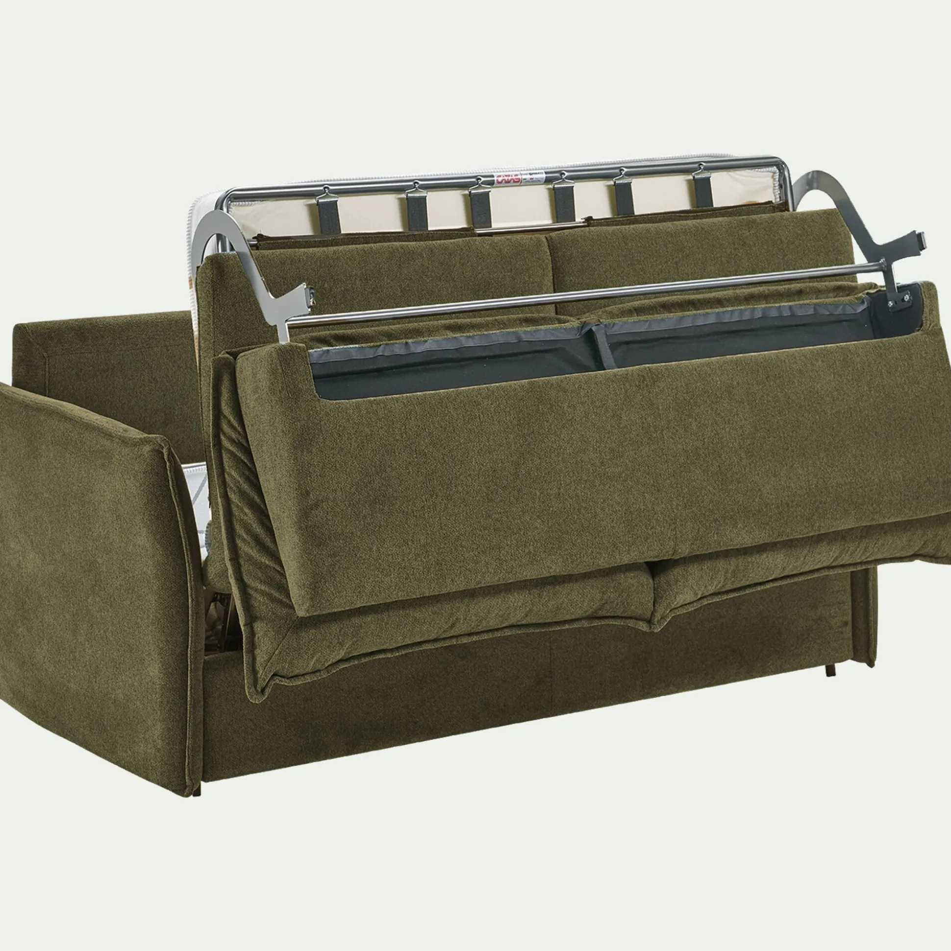 Le canapé Moya offre un soutien optimal adapté à chaque partie du corps. Ce canapé 4 places convertible à la fabrication italienne, confectionné à partir du savoir faire local, vous permet de vous détendre dans une pièce hautement qualitative. Le soir, dépliez votre canapé et transformez-le en un lit au couchage 160×195 cm d’une densité de 35kg/m3 qui vous permettra d’accueillir famille et amis. Très confortable, ce canapé peut servir de couchage quotidien. Son mécanisme métallique vous permet de le déplier en quelques secondes sans enlever ses coussins. Ce canapé en tissu, avec sa couleur vert cèdre et son liseré décoratif, apportera de l’élégance à votre salon.