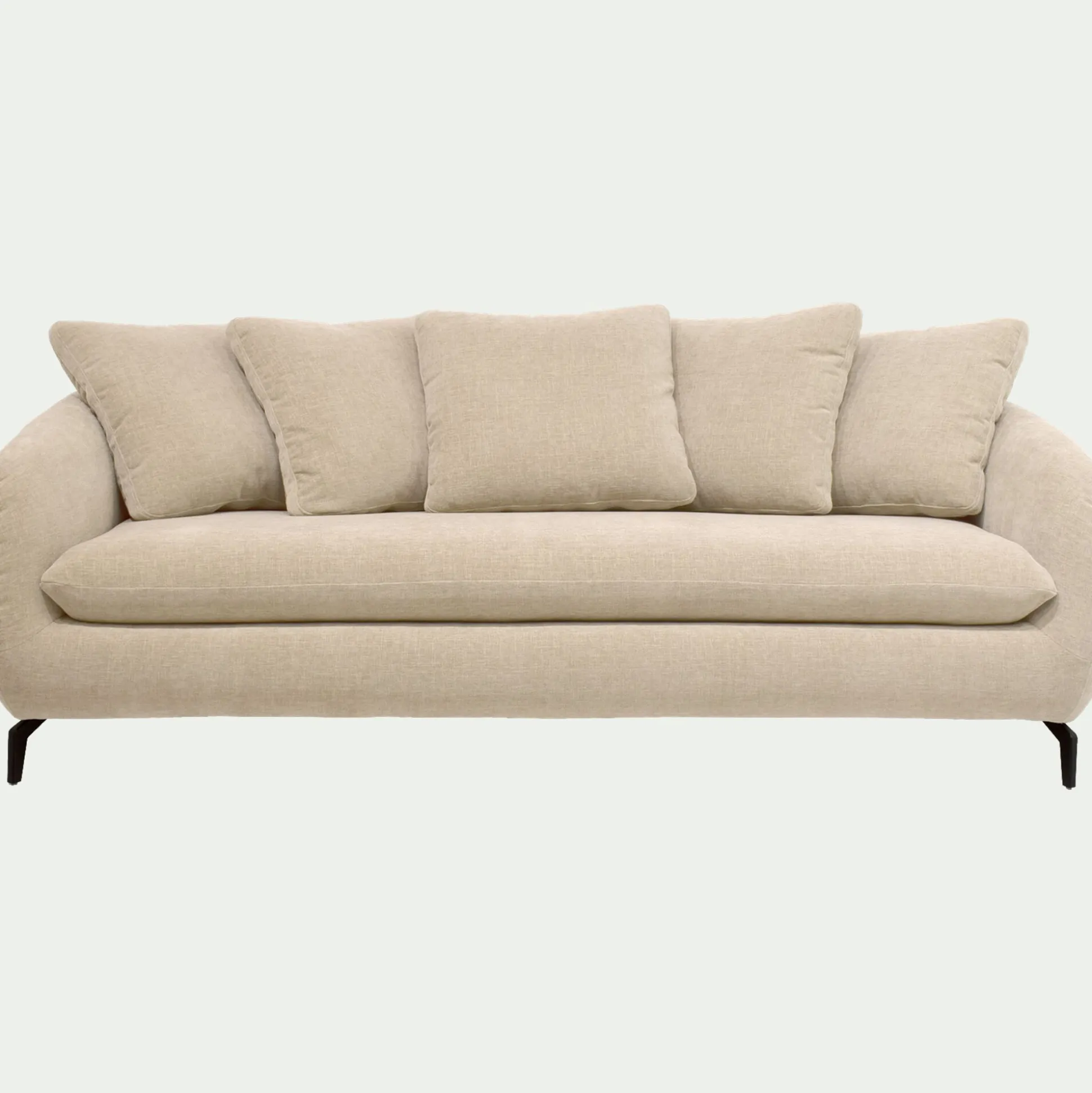 Un joli canapé 4 places convertible en tissu pour profiter agréablement de votre salon. Un look contemporain et accueillant, sublimé par un piétement original en acier noir. Vous apprécierez la forme du dossier et des accoudoirs qui vous offrent un maintien optimal de votre dos pour un confort d’assise exceptionnel. Un canapé fabriqué en France, dans des ateliers proches de la ville de Bourges, qui incarne l’excellence du savoir-faire français. Un coloris blanc écru qui apporte une note citadine et raffinée à votre décoration de salon.