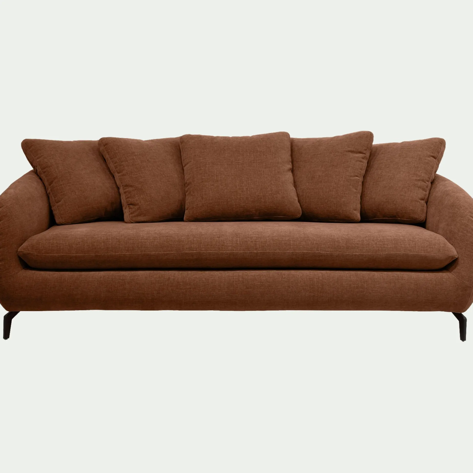 Un joli canapé convertible en tissu pour profiter agréablement de votre salon. Un look contemporain et accueillant, sublimé par un piétement original en acier noir. Vous apprécierez la forme du dossier et des accoudoirs qui vous offrent un maintien optimal de votre dos pour un confort d’assise exceptionnel. Un canapé fabriqué en France, dans des ateliers proches de la ville de Bourges, qui incarne l’excellence du savoir-faire français. Un coloris brun rustrel qui apporte une note citadine et raffinée à votre décoration de salon.