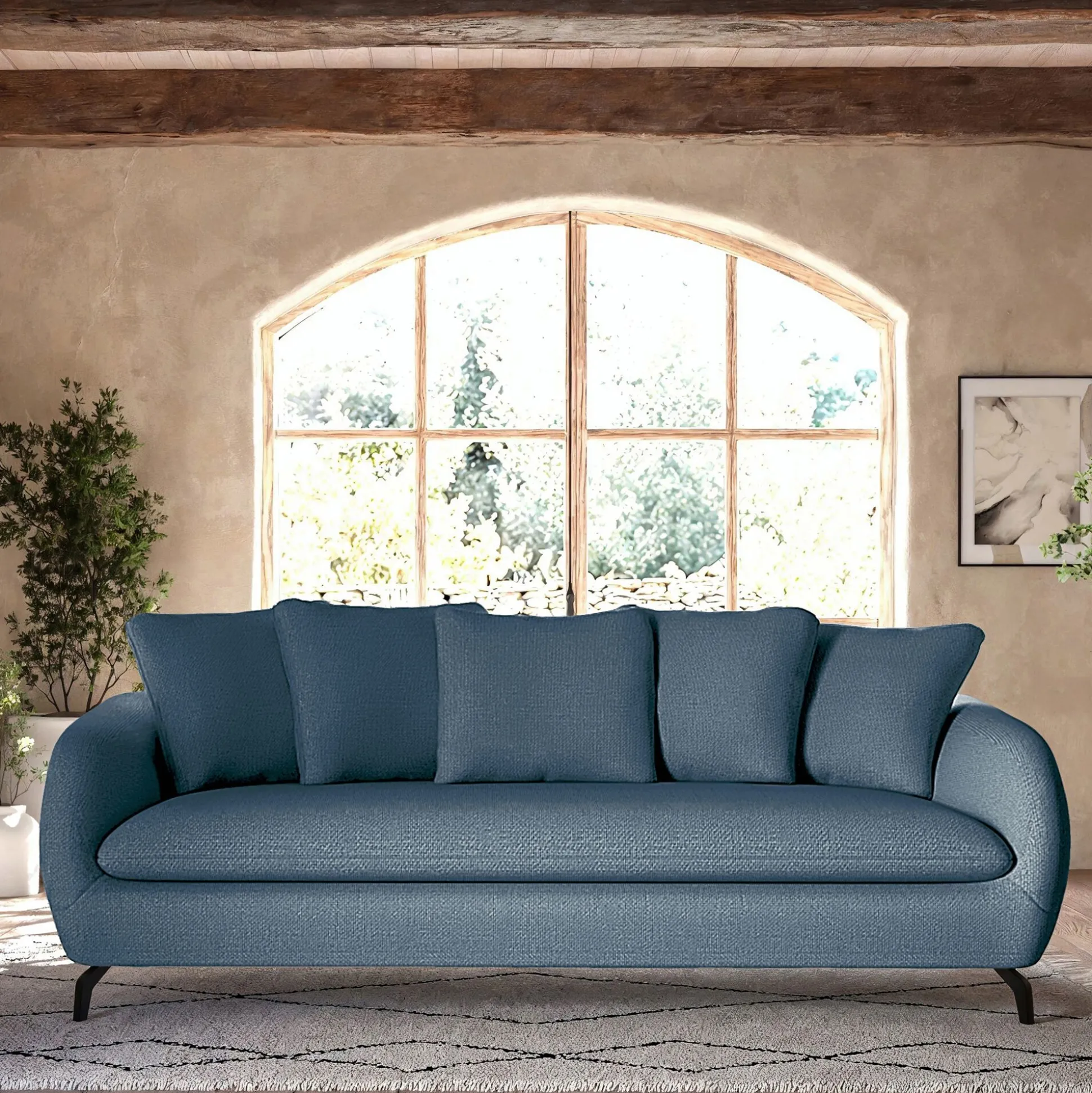 Un joli canapé fixe en tissu pour profiter agréablement de votre salon. Un look contemporain et accueillant, sublimé par un piétement original en acier noir. Vous apprécierez la forme du dossier et des accoudoirs qui vous offrent un maintien optimal de votre dos pour un confort d’assise exceptionnel. Un canapé fabriqué en France, dans des ateliers proches de la ville de Bourge, qui incarne l’excellence du savoir-faire français. Un coloris bleu qui apporte une note lumineuse et chaleureuse à votre décoration de salon.