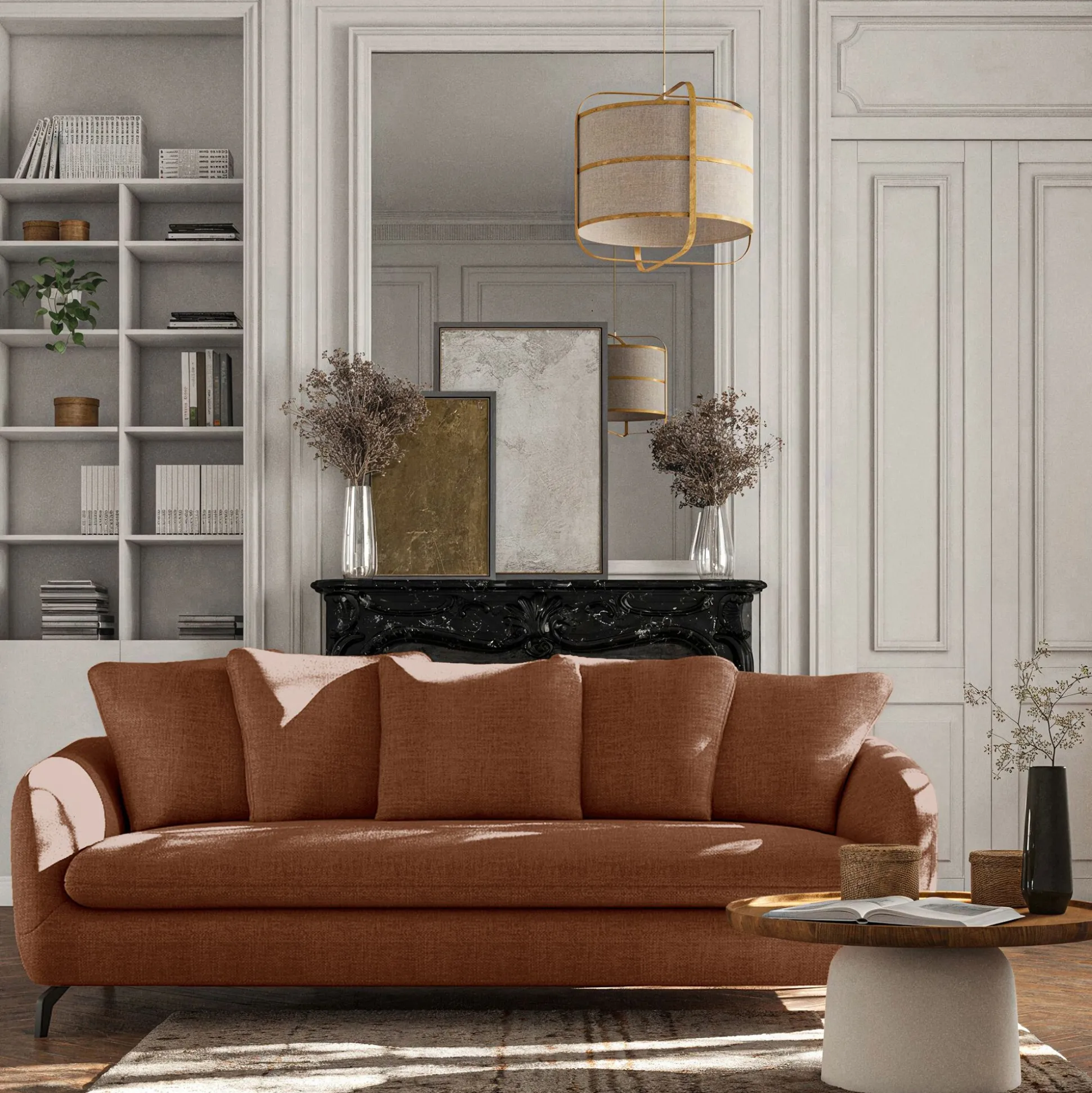 Un joli canapé fixe en tissu pour profiter agréablement de votre salon. Un look contemporain et accueillant, sublimé par un piétement original en acier noir. Vous apprécierez la forme du dossier et des accoudoirs qui vous offrent un maintien optimal de votre dos pour un confort d’assise exceptionnel. Un canapé fabriqué en France, dans des ateliers proches de la ville de Bourge, qui incarne l’excellence du savoir-faire français. Un coloris brun rustrel qui apporte une note lumineuse et chaleureuse à votre décoration de salon.