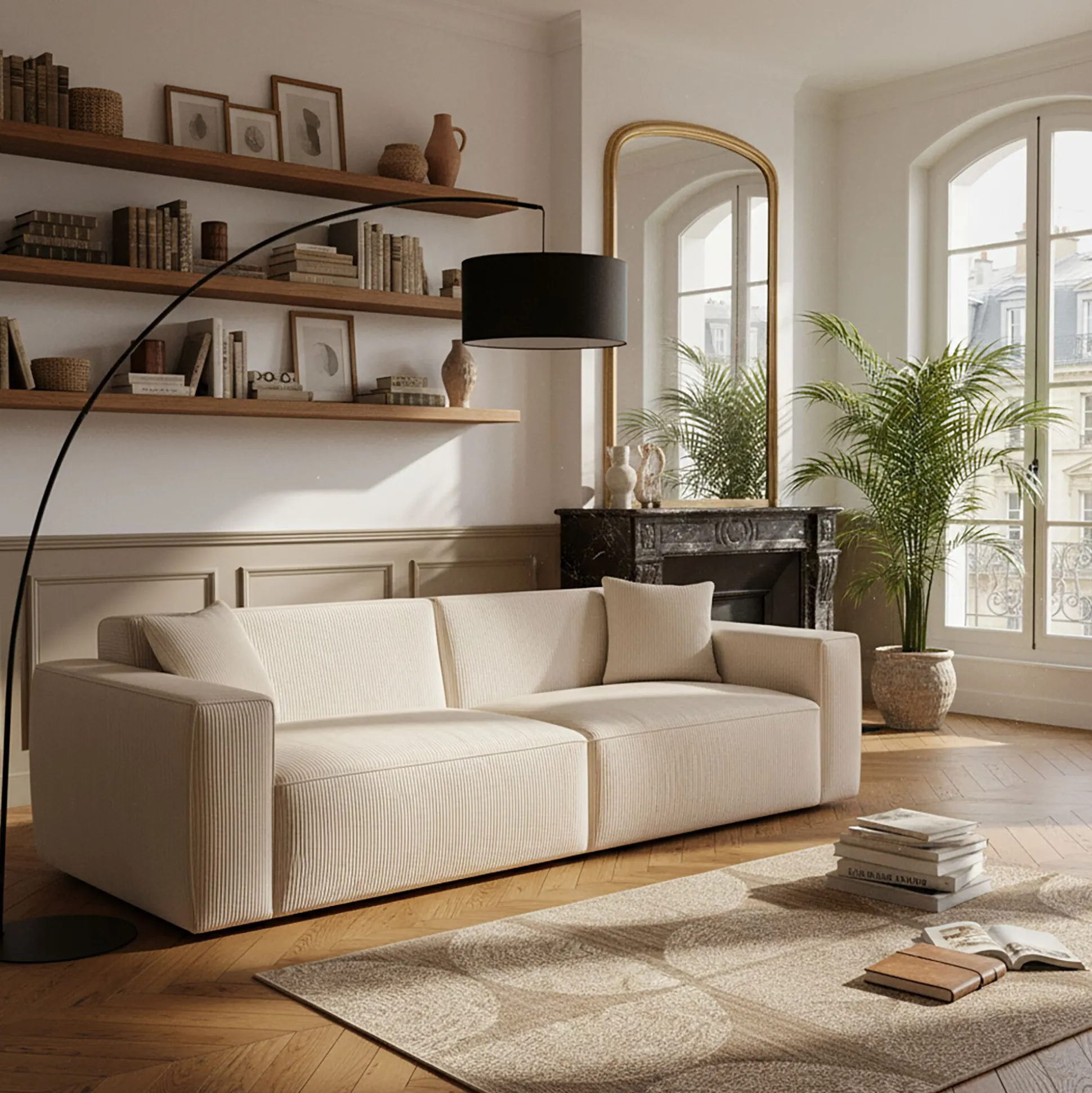 Avec son design épuré et son élégance naturelle, ce canapé droit 4 places s’impose comme une pièce centrale du salon. Son revêtement en velours côtelé beige illumine la décoration et s’harmonise avec tous les styles d’intérieur, du contemporain au plus classique. Conçu en Ukraine, il allie qualité et confort grâce à sa structure en pin massif et son assise dotée de ressorts Nosag, réputés pour leur durabilité et leur souplesse. Son assise généreuse et son dossier accueillant créent un espace cosy, parfait pour des instants de détente ou des moments de convivialité. Idéal pour aménager un salon chaleureux et moderne, ce canapé fixe séduit par son allure sobre et intemporelle, permise grâce à la qualité du tissu azores.