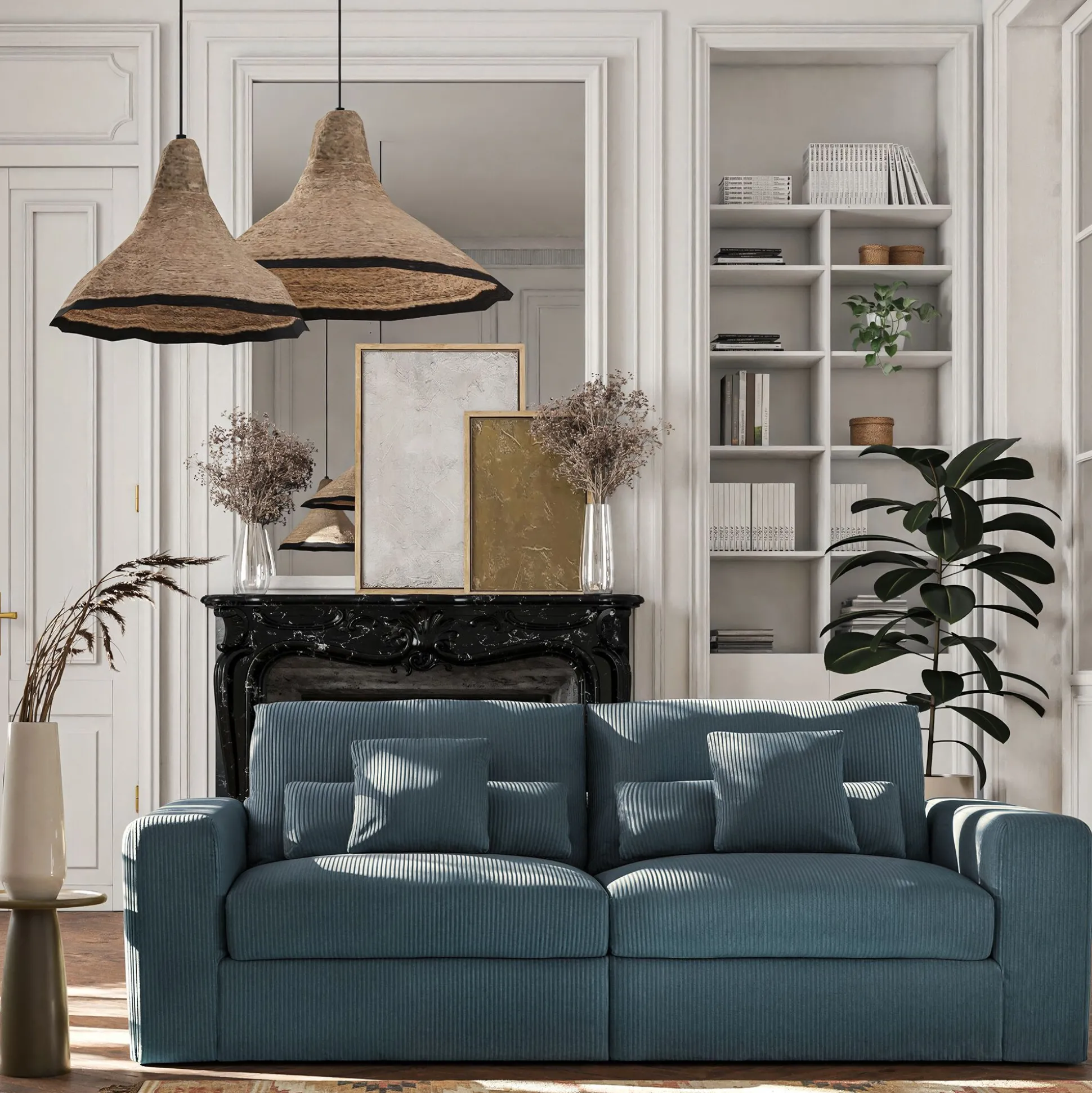 Le canapé Piuma est idéal pour se prélasser dans votre salon. Avec ses grandes assises, ce canapé d’angle droit en velours côtelé vous offre un confort exceptionnel. Il vous permet de vous détendre au coeur de coussins moelleux dans un nuage de douceur renforcé par son tissu délicat. Vous pourrez ainsi recevoir famille et amis lors d’un moment apaisant. Ce canapé fixe 5 places de couleur bleu apporte également une touche design moderne et élégante à votre salon. Son velours côtelé donne un côté cocooning qui vous permet de transformer votre pièce en un espace chaleureux.