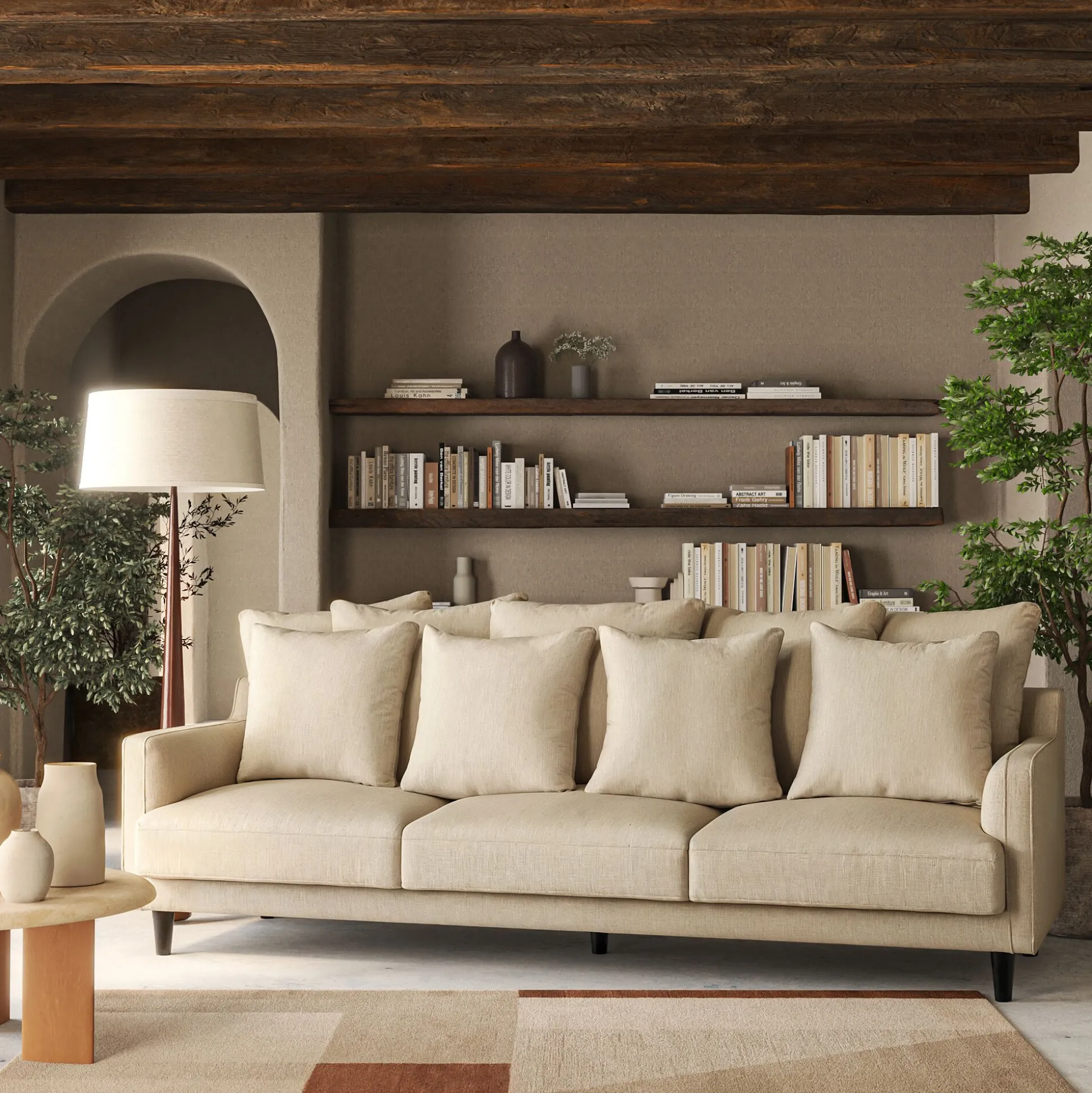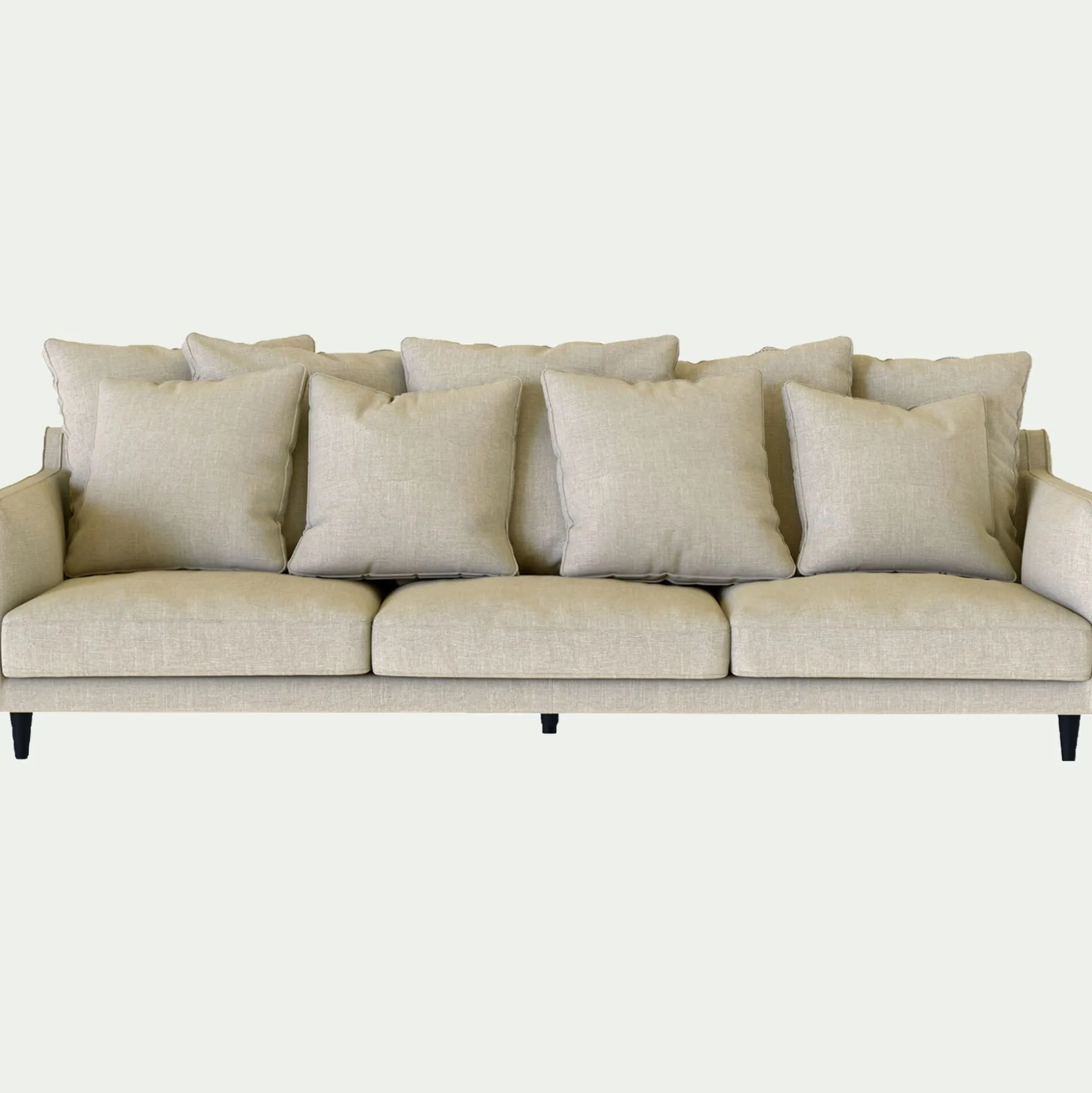 Fabriqué à la main par des passionnés italiens avec une tradition ancestrale dans le domaine du siège et de la tapisserie, ce canapé saura séduire les amateurs de déco. LENITA est une remarquable réinterprétation moderne d’un canapé, inspiré de l’époque somptueuse du Second Empire. Ce canapé fixe de 6 places en tissu mixte, avec sa couleur beige Alpilles, est une façon idéale de décorer son salon d’une pièce raffinée. Installez-vous confortablement dans ce canapé moelleux, garni de plumes d’oies et venez vous détendre pour des moments de pur bien-être. Sa ligne, ses courbes, la préciosité de la matière veloutée inspirent le raffinement. Les multiples coussins repositionnables vous donneront le juste confort à tout moment de la journée. Son assise profonde et généreuse invite à la paresse. Il sera incontestablement la pièce qui vous fera passer de très bons moments cocooning.