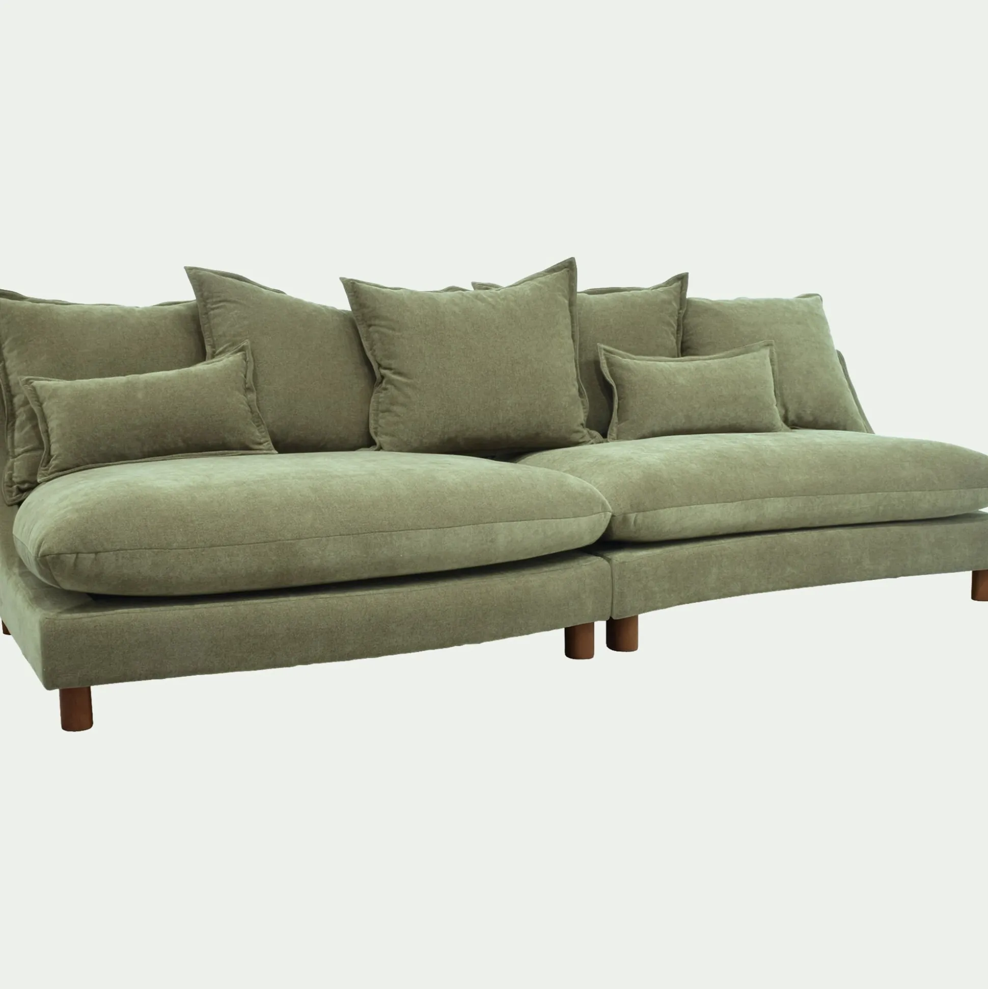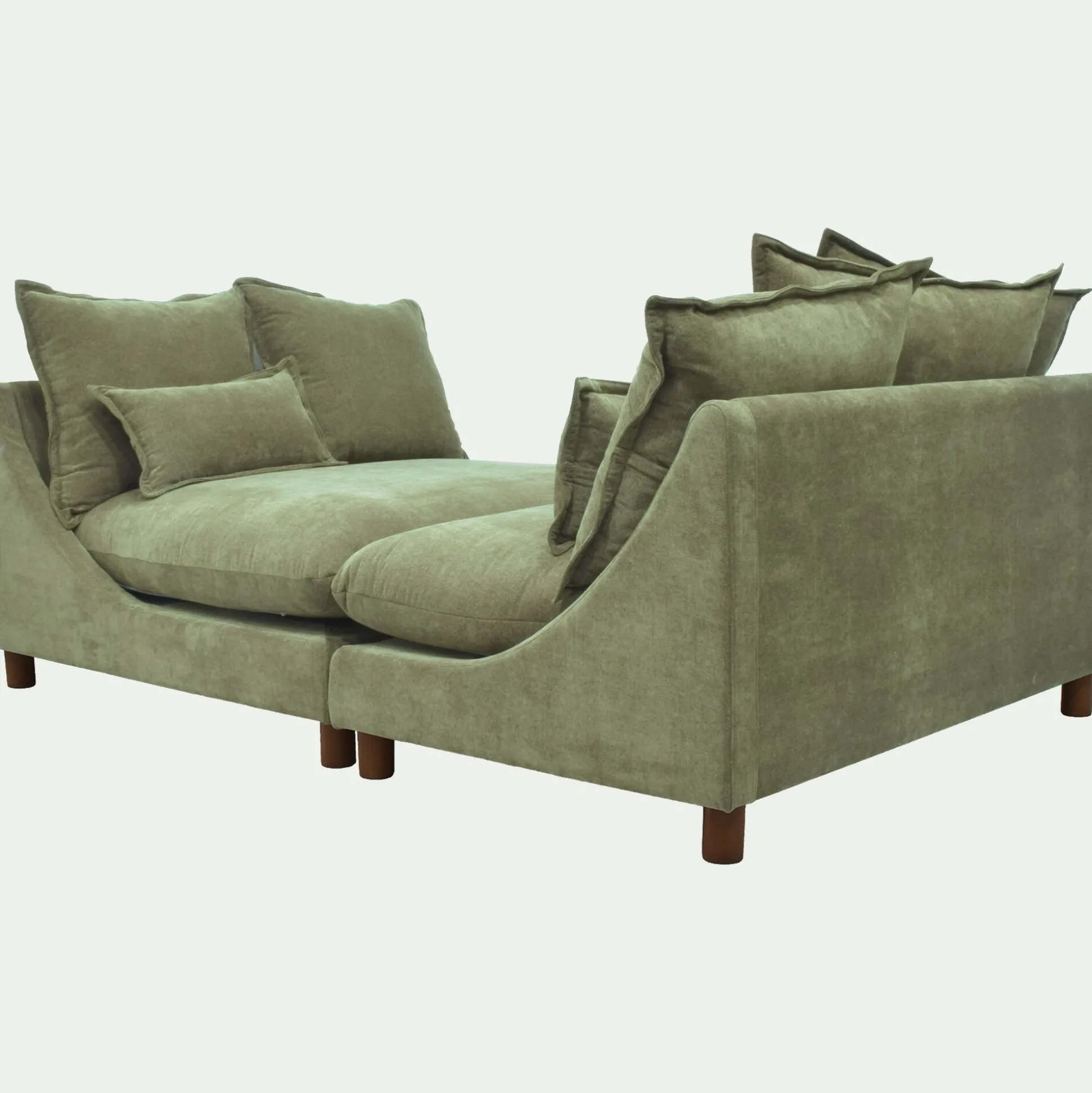 Ce grand canapé modulable séduit par ses lignes généreuses et son design singulier, entre modernité et confort. Entièrement convertible, il se compose de deux modules que l’on peut rapprocher pour former un couchage d’appoint, idéal pour les moments de détente prolongés. Revêtu d’un tissu vert eucalyptus, il apporte une note de fraîcheur douce et naturelle à la pièce. Ses nombreux coussins renforcent l’esprit cocooning et invitent à s’y lover. Fabriqué en France, dans des ateliers situés près de Bourges, ce canapé reflète le savoir-faire d’artisans passionnés. Une pièce de caractère, conçue avec soin, qui incarne l’élégance à la française.