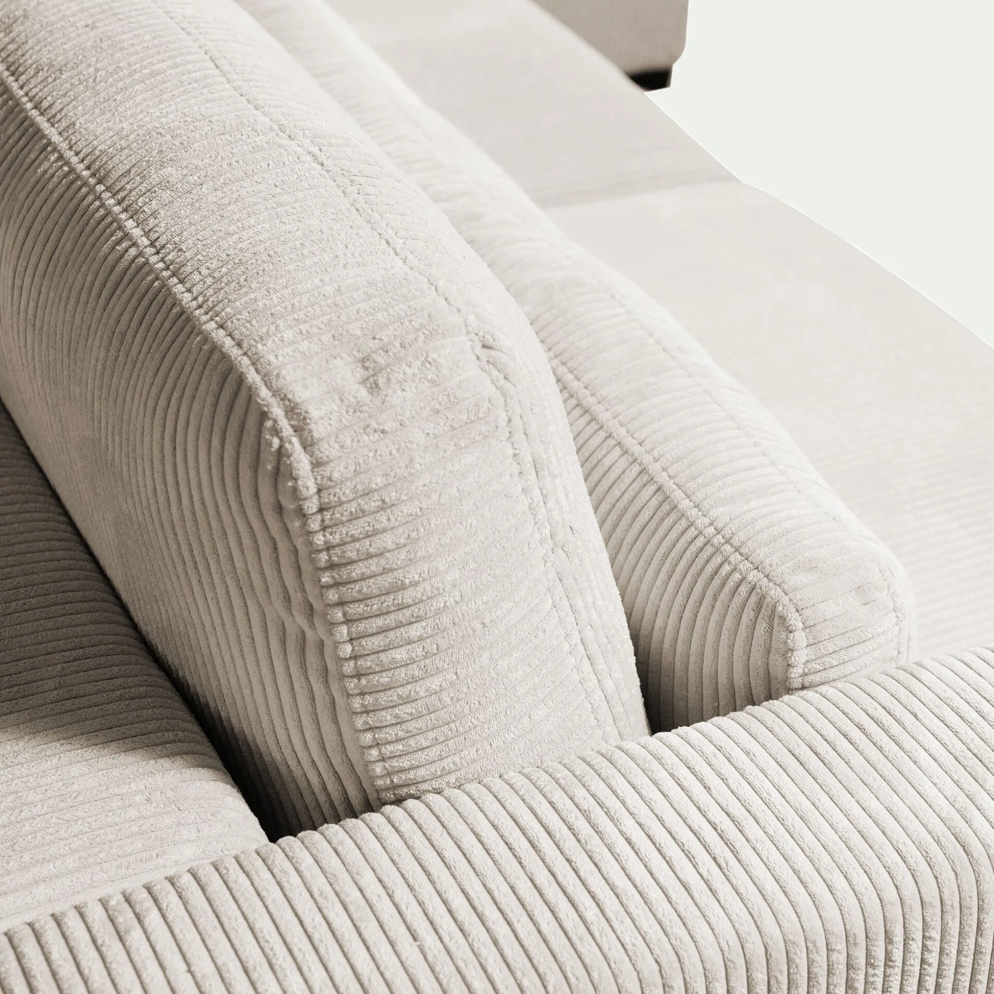 Spacieux et raffiné, le canapé d’angle Batis avec angle à gauche transforme le salon en un espace convivial et confortable. Sa chaise longue offre un espace idéal pour s’allonger et savourer un véritable instant de repos. En velours côtelé, il insuffle un vent de douceur et d’élégance dans le salon. Son coloris beige illumine la pièce et crée un espace où le bien-être règne. Conçu pour durer, ce canapé fixe repose sur une structure en bois massif, garantissant solidité et stabilité. Il s’impose comme l’élément central du séjour, invitant au partage et à la relaxation.
