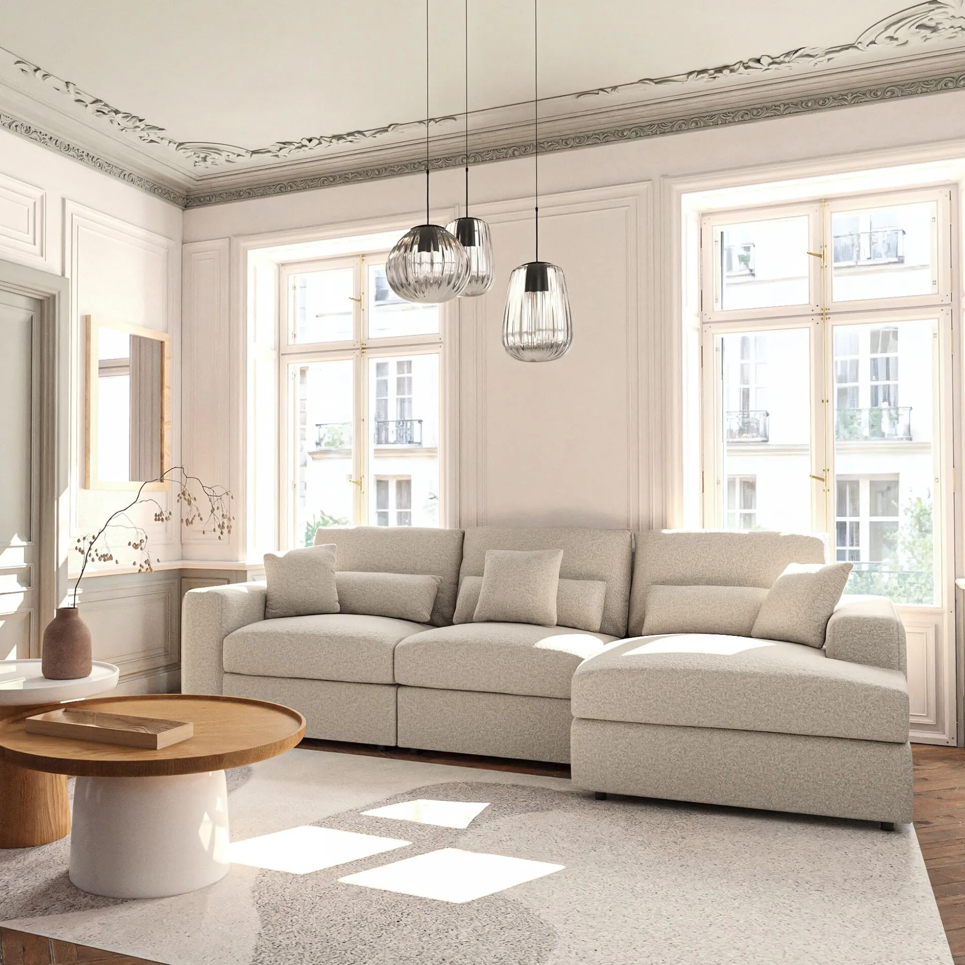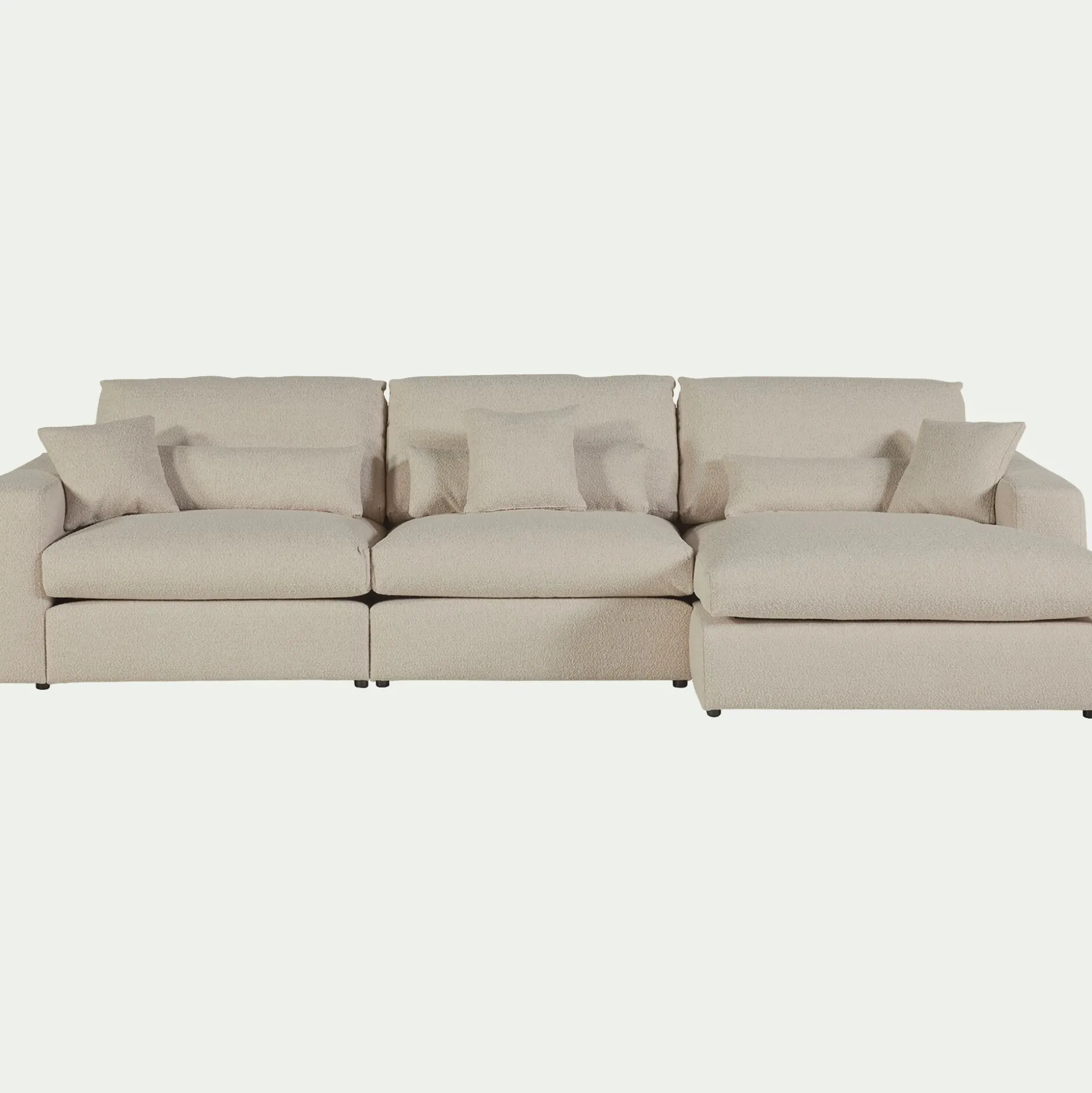 Le canapé Piuma est idéal pour se prélasser dans votre salon. Avec ses grandes assises, ce canapé d’angle droit en tissu bouclette vous offre un confort exceptionnel. Il vous permet de vous détendre au coeur de coussins moelleux dans un nuage de douceur renforcé par son tissu délicat. Vous pourrez ainsi recevoir famille et amis lors d’un moment apaisant. Ce canapé fixe de couleur blanche apporte également une touche design moderne et élégante à votre salon. Son tissu bouclette donne un côté cocooning qui vous permet de transformer votre pièce en un espace chaleureux.