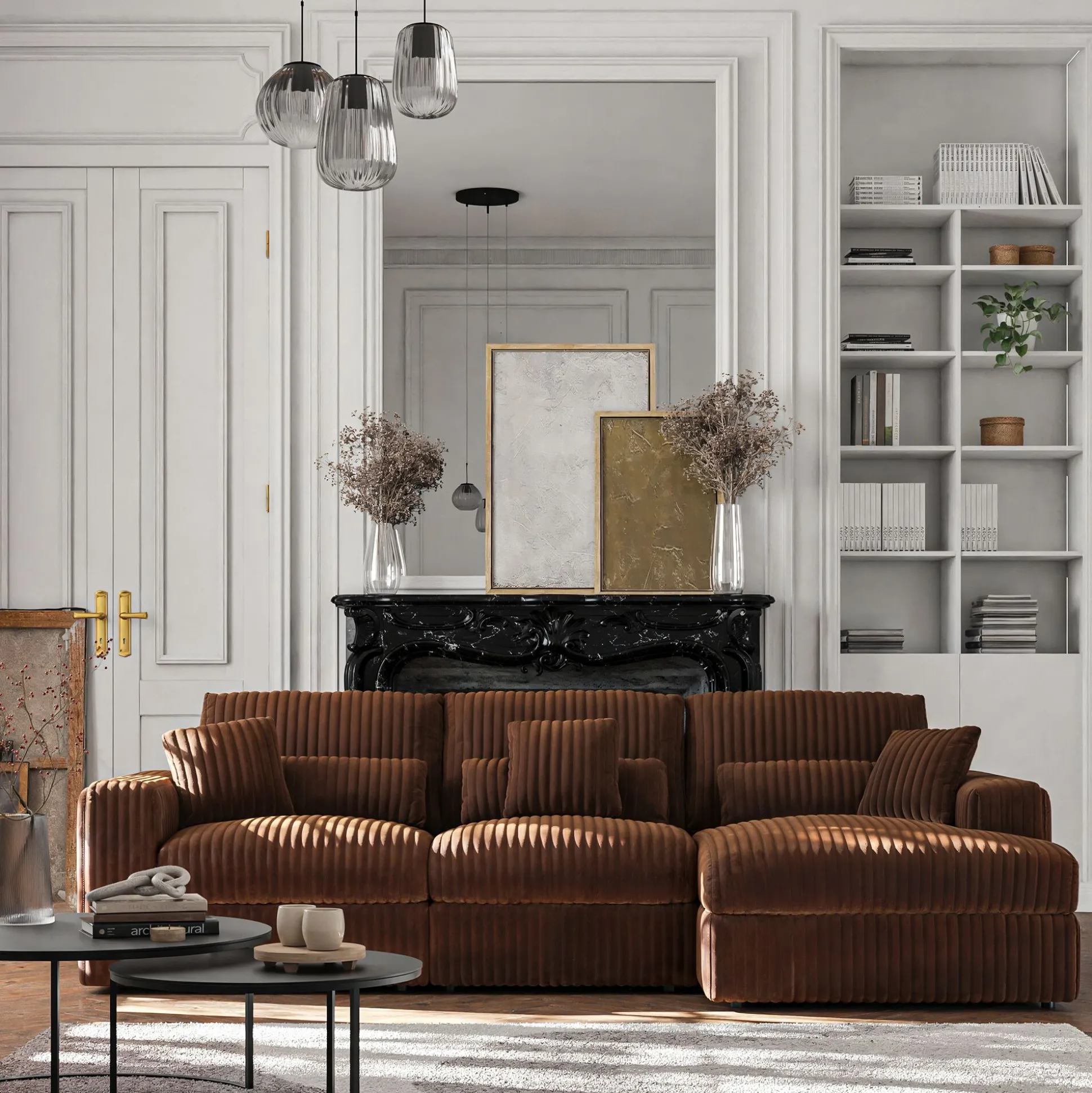 Avec son grand angle droit bien dessiné, ce canapé d’angle invite à la convivialité et au confort. Son revêtement en tissu côtelé, au toucher texturé et chaleureux, apporte du relief à l’espace tout en douceur. Habillé de notre coloris brun rustrel, chaleureux et cocooning, il s’intègre avec élégance dans tous les intérieurs. Ce canapé fixe propose une assise généreuse, un dossier enveloppant et des coussins déhoussables pour un entretien simplifié. Des coussins décoratifs complètent l’ensemble, ajoutant une note cosy à ce canapé pensé pour les moments de détente partagés.