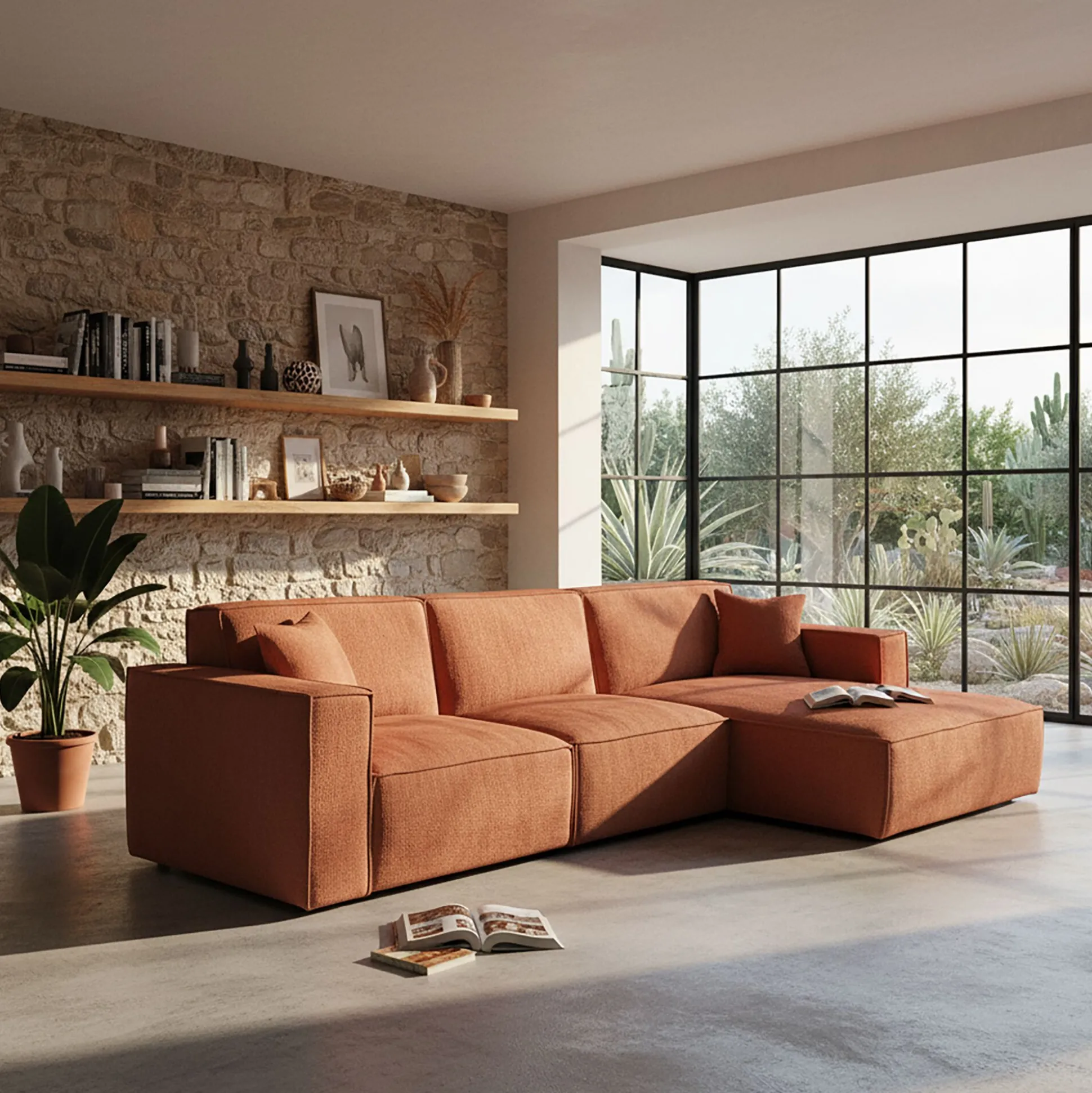 Le canapé d’angle Kubo avec méridienne à droite est pensé pour offrir un espace accueillant et chaleureux dans le salon. Revêtu du tissu genesis, à la fois doux et résistant, il allie confort et praticité au quotidien. Son coloris brun rustrel, chaleureux et intemporel, s’intègre facilement dans toutes les ambiances et habille le séjour d’une touche de douceur. Fixe et généreux, ce canapé se distingue par une silhouette contemporaine qui structure l’espace avec élégance. Fabriqué en Ukraine, il conjugue style et confort pour accompagner les instants de détente comme les moments partagés.