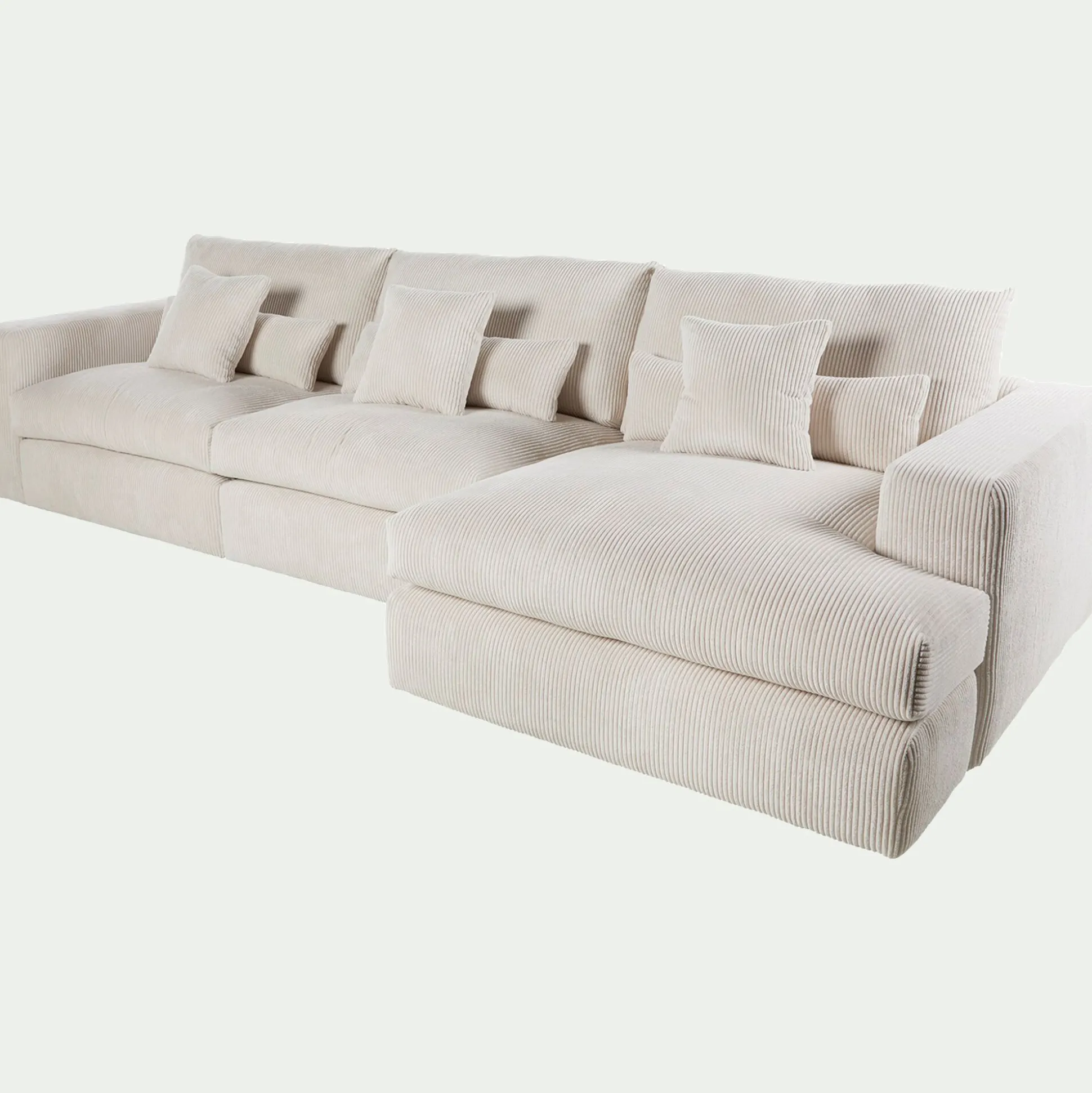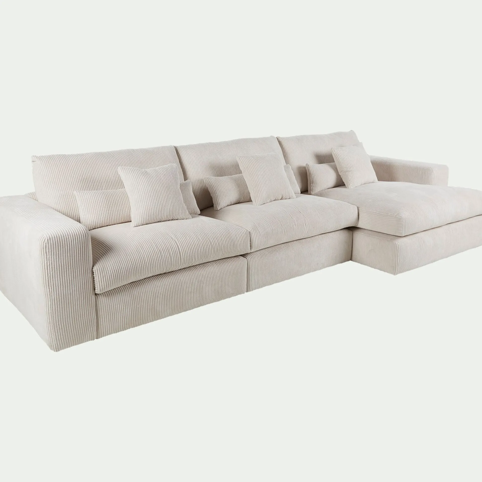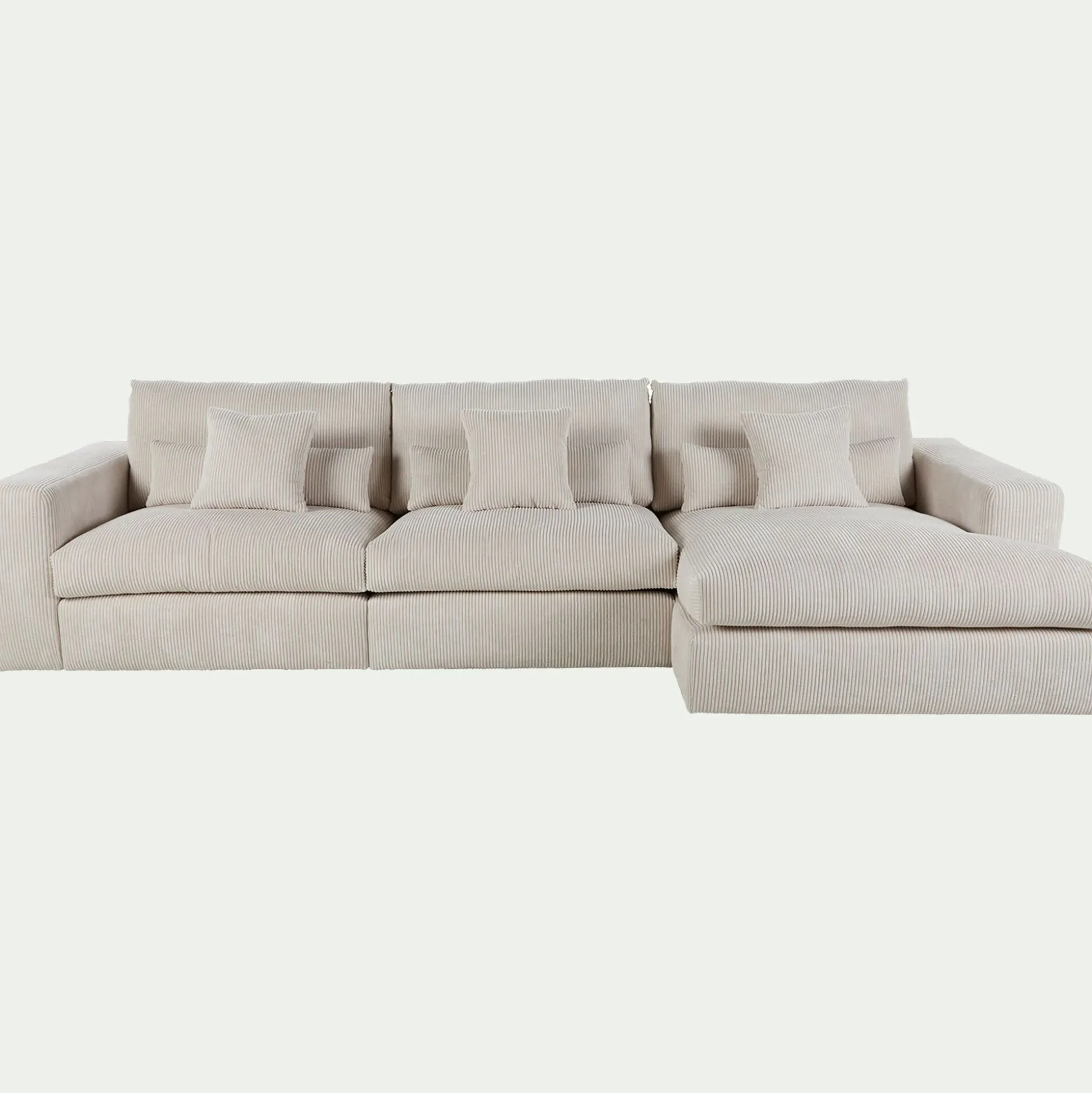 Le canapé Piuma est idéal pour se prélasser dans votre salon. Avec ses grandes assises, ce canapé d’angle droit en velours côtelé vous offre un confort exceptionnel. Il vous permet de vous détendre au coeur de coussins moelleux dans un nuage de douceur renforcé par son tissu délicat. Vous pourrez ainsi recevoir famille et amis lors d’un moment apaisant. Ce canapé fixe de couleur beige apporte également une touche design moderne et élégante à votre salon. Son velours côtelé donne un côté cocooning qui vous permet de transformer votre pièce en un espace chaleureux.