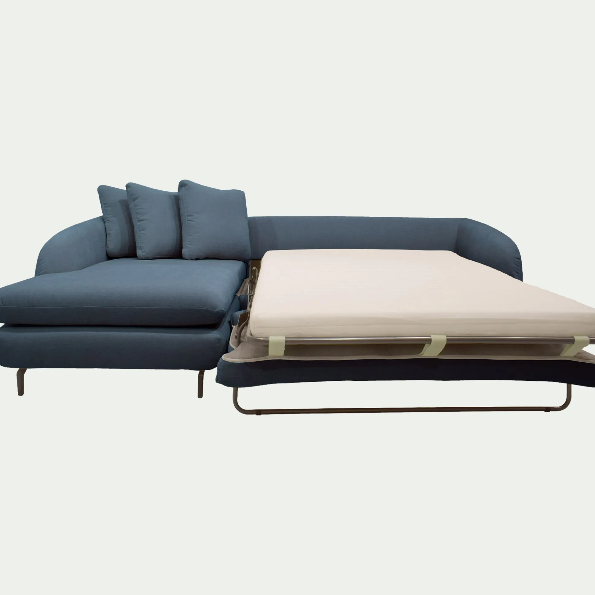 Un joli canapé d’angle gauche en tissu pour profiter agréablement de votre salon. Un look contemporain et accueillant, sublimé par un piétement original en acier noir. Vous apprécierez la forme du dossier et des accoudoirs qui vous offrent un maintien optimal de votre dos pour un confort d’assise exceptionnel. De plus, vous pourrez vous reposer sur son matelas et accueillir famille et amis grâce à sa fonction convertible. Un canapé fabriqué en France, dans des ateliers proches de la ville de Bourge, qui incarne l’excellence du savoir-faire français. Un coloris bleu qui apporte une note citadine et raffinée à votre décoration de salon.