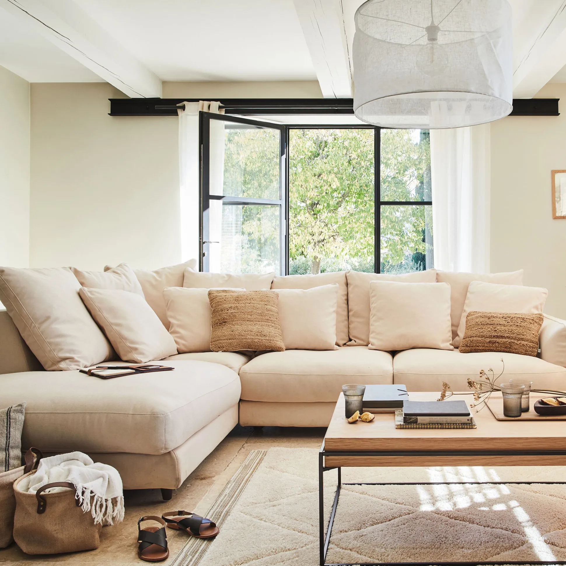 Assise et dossier : mousse polyuréthane densité de 30 kg/m3 et couette en fibre polyester. 7 coussins dossier 60×60: Plumes d’oie et fibre polyester. 4 coussins 50×50: Plumes d’oie et fibre polyester.
