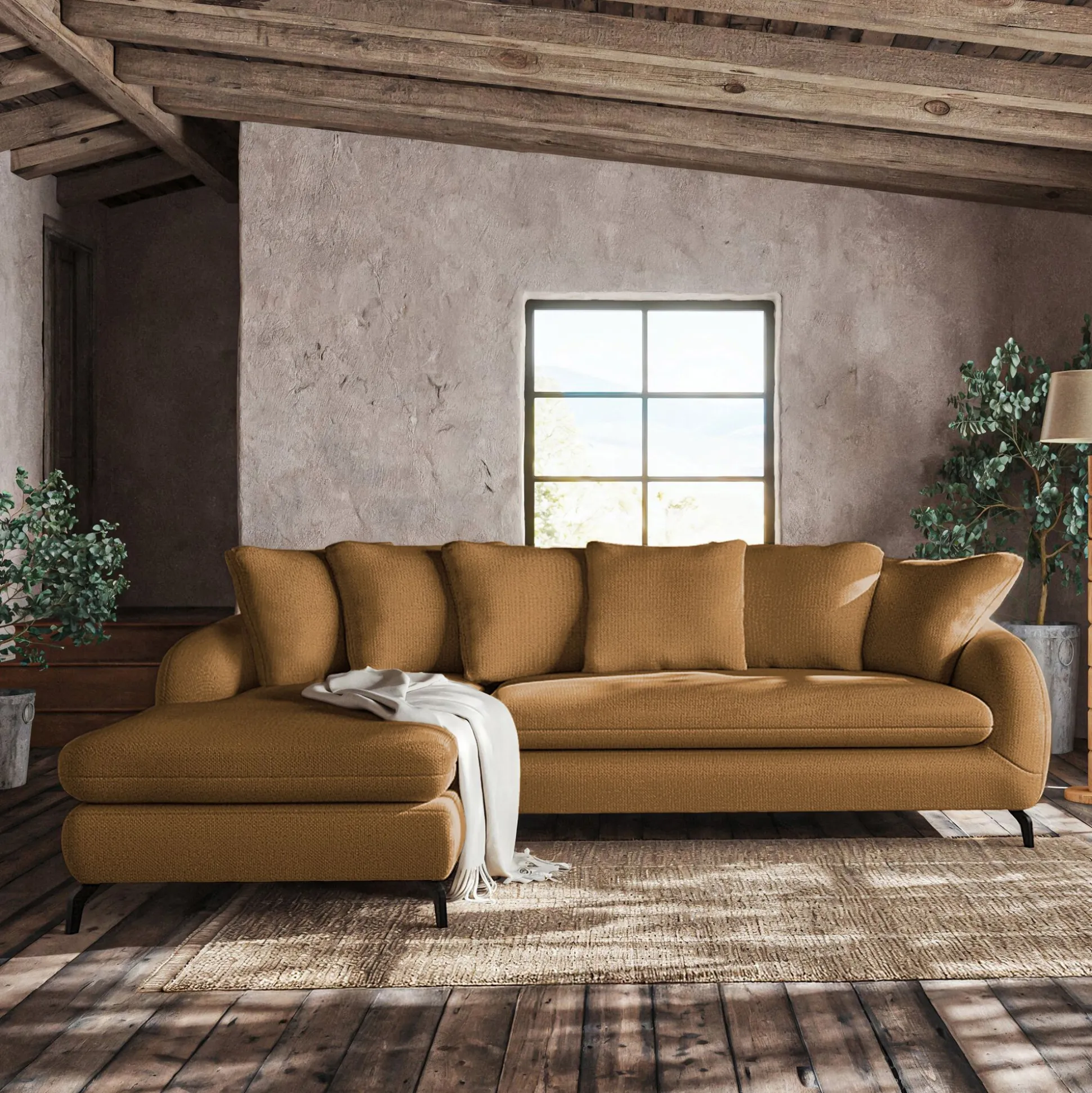 Un joli canapé d’angle gauche en tissu pour profiter agréablement de votre salon. Un look contemporain et accueillant, sublimé par un piétement original en acier noir. Vous apprécierez la forme du dossier et des accoudoirs qui vous offrent un maintien optimal de votre dos pour un confort d’assise exceptionnel. Un canapé fabriqué en France, dans des ateliers proches de la ville de Bourge, qui incarne l’excellence du savoir-faire français. Un coloris bronze qui apporte une note citadine et raffinée à votre décoration de salon.