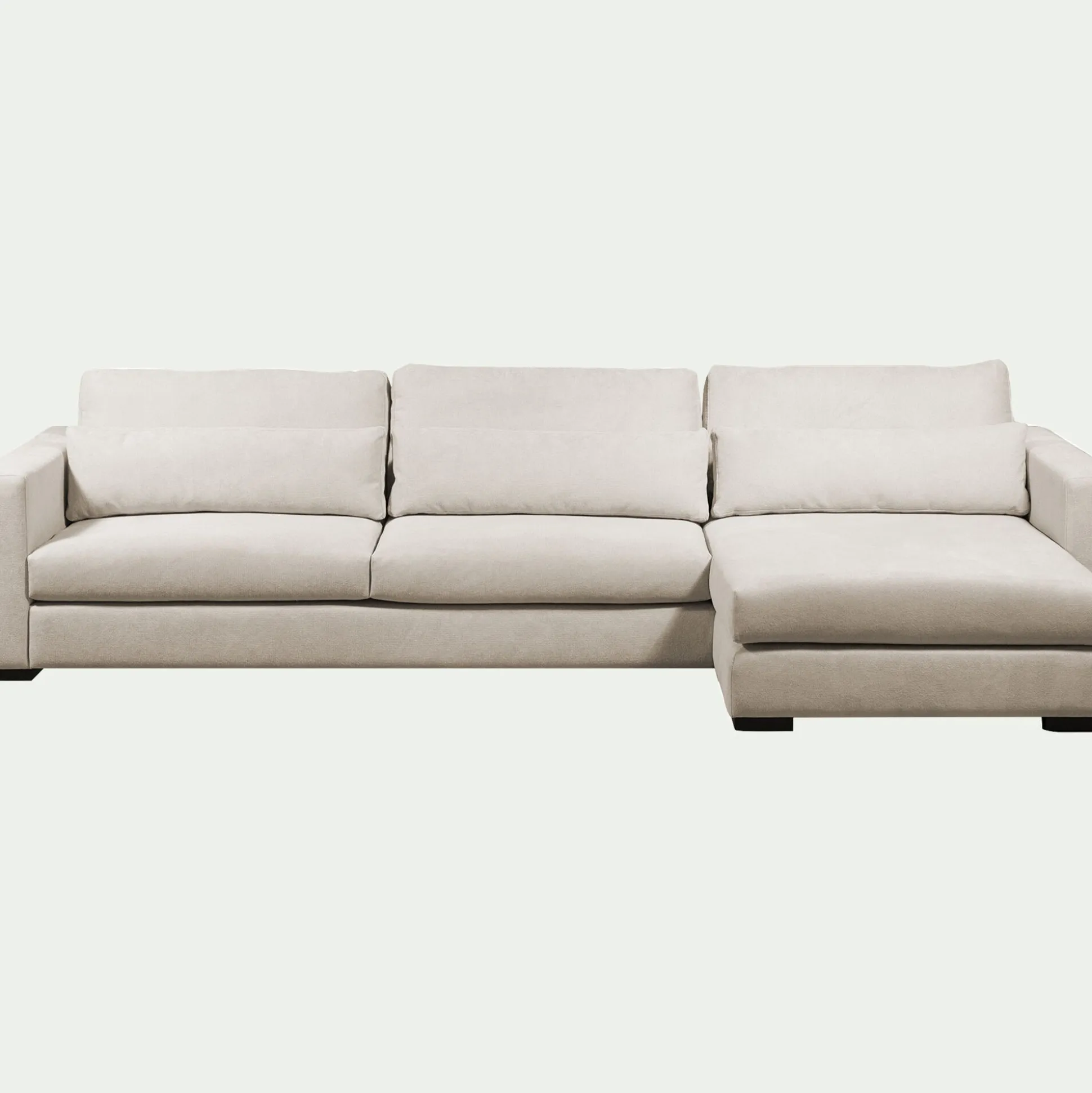 Ce canapé grand angle extrêmement confortable sera parfait pour vous relaxer. Fabriqué en Europe, il constitue le canapé fixe idéal pour recevoir vos convives grâce à ses 5 places assises. Son revêtement en tissu doux apportera une touche chaleureuse à l’ensemble de votre salon. Sa couleur beige roucas, ajoutera une touche de modernité à votre intérieur. Ce canapé angle droit sublimera votre salon.