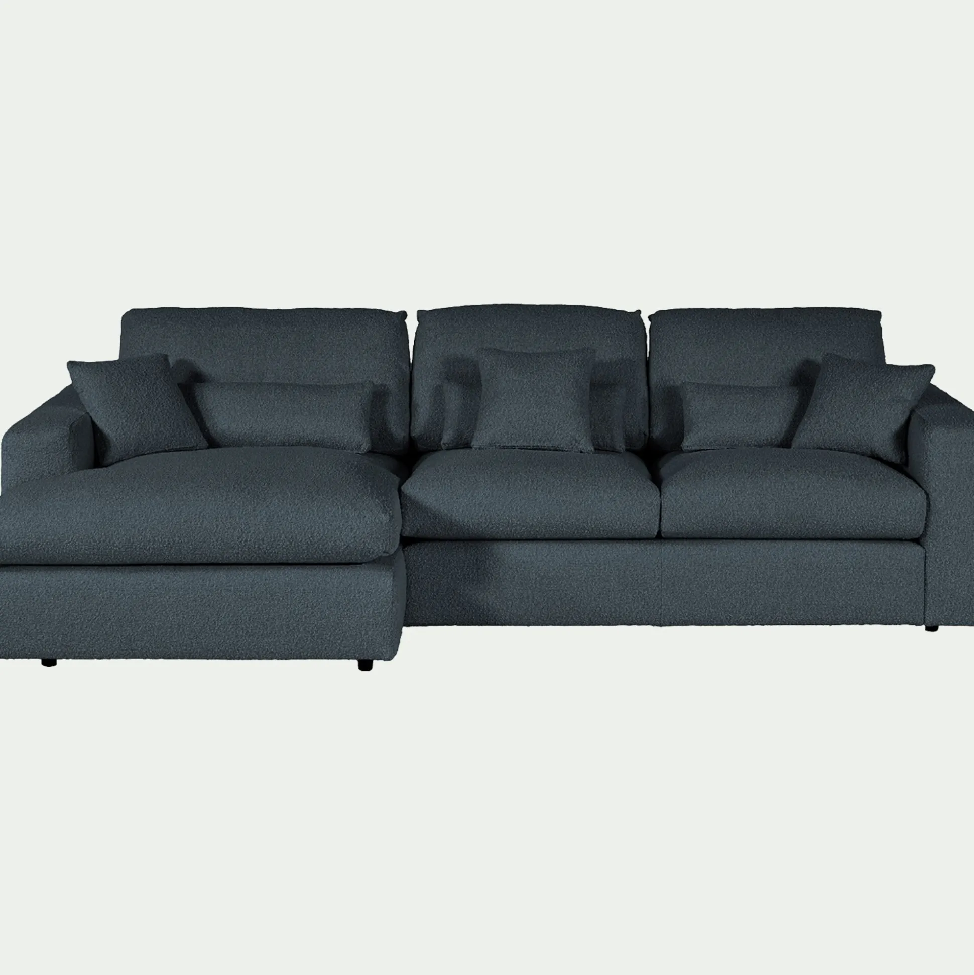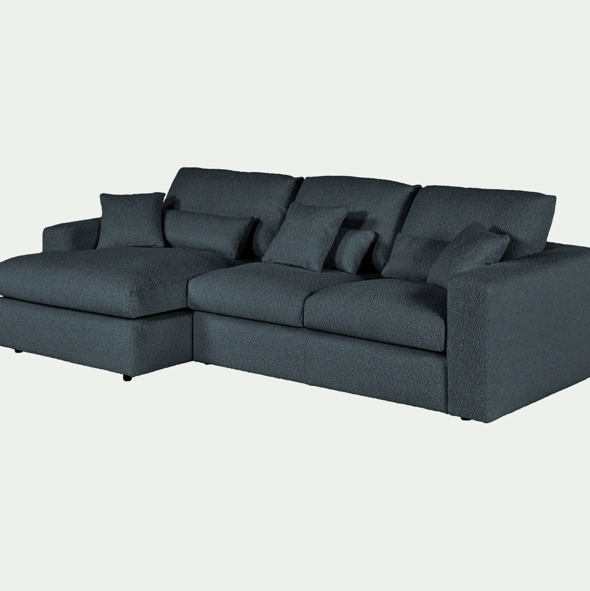 Avec son petit angle à gauche, ce canapé d’angle est une invitation aux moments partagés. Son revêtement en tissu bouclette, à la fois doux et résistant, enveloppe l’espace d’une chaleur réconfortante. Son coloris bleu, intemporel, s’harmonise avec tous les styles d’intérieur. Pensé pour le confort, ce canapé fixe se compose d’une assise spacieuse, d’un dossier accueillant et de coussins déhoussables pour un entretien facilité. Des coussins décoratifs viennent parfaire l’ensemble, ajoutant une touche cosy. Un canapé idéal pour des instants de détente en famille ou entre amis.