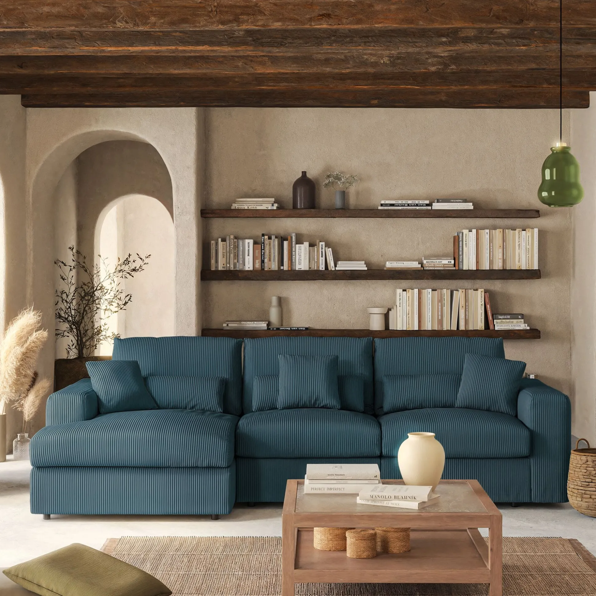 Avec son petit angle à gauche, ce canapé d’angle est une invitation aux moments partagés. Son revêtement en velours côtelé, à la fois doux et résistant, enveloppe l’espace d’une chaleur réconfortante. Son coloris bleu, élégant, s’harmonise avec tous les styles d’intérieur. Pensé pour le confort, ce canapé fixe se compose d’une assise spacieuse, d’un dossier accueillant et de coussins déhoussables pour un entretien facilité. Des coussins décoratifs viennent parfaire l’ensemble, ajoutant une touche cosy. Un canapé idéal pour des instants de détente en famille ou entre amis.