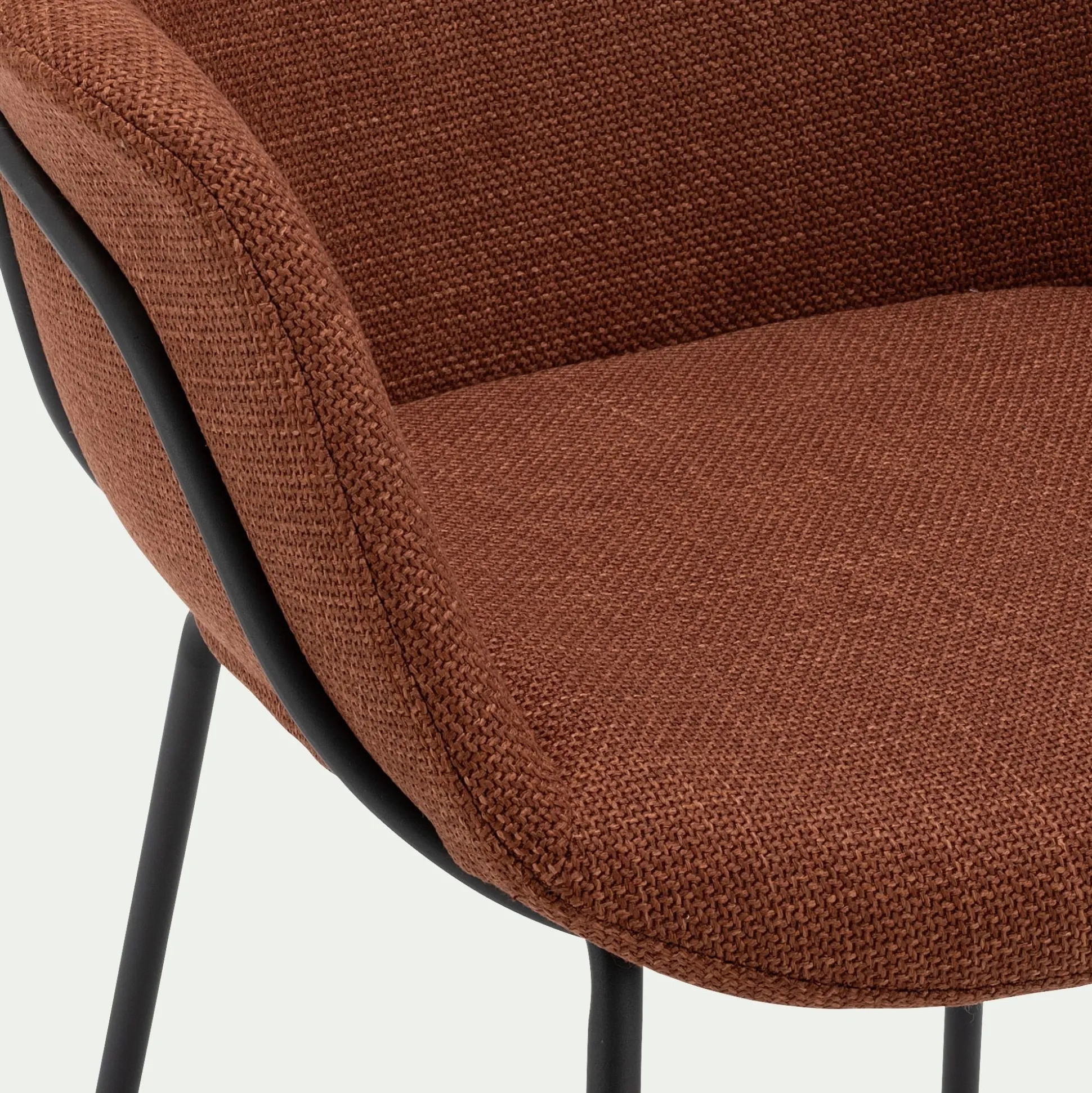 Chaleureux et profond, le coloris brun rustrel donne du caractère à la chaise Chloe. Cette nuance raffinée s’accorde parfaitement à une déco aux tons terreux ou naturels. Grâce à son tissu, ses accoudoirs intégrés et son piètement noir minimaliste, cette chaise de repas devient un vrai atout confort dans la salle à manger.