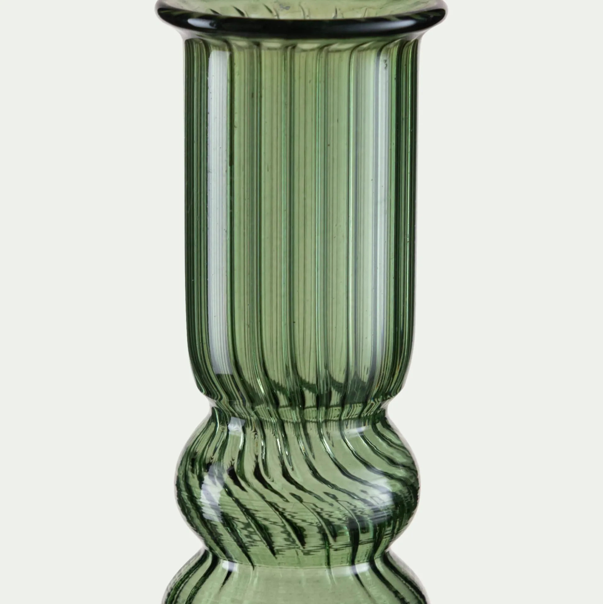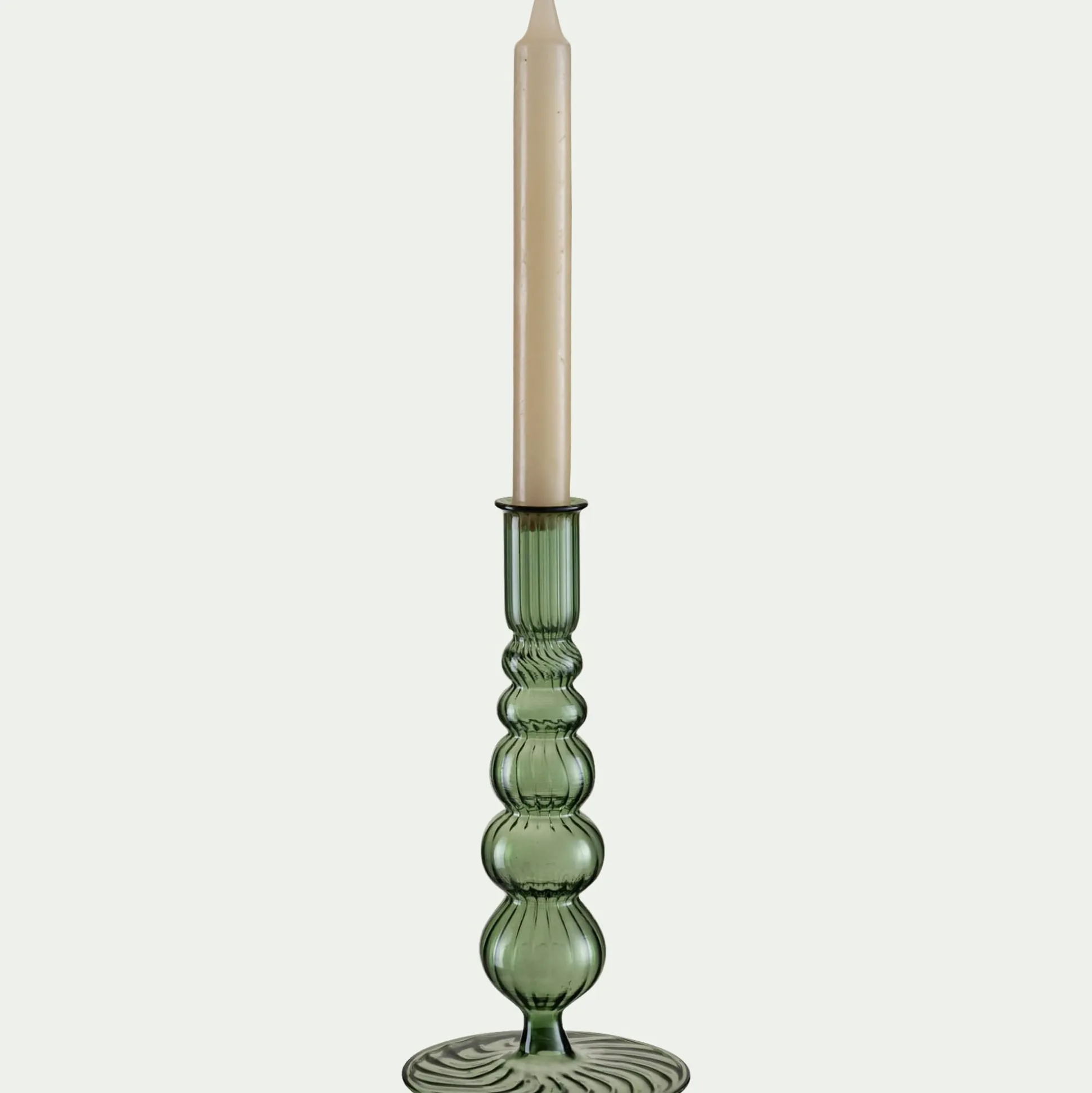 Ce chandelier en verre capte la lumière avec raffinement grâce à ses nombreux détails : stries délicates, courbes généreuses et reliefs travaillés. Pensé pour accueillir une bougie flambeau, ce chandelier vert apporte une note d’élégance à la décoration de Noël. Parfait sur une table de fête, il diffuse une atmosphère chaleureuse et scintillante.
