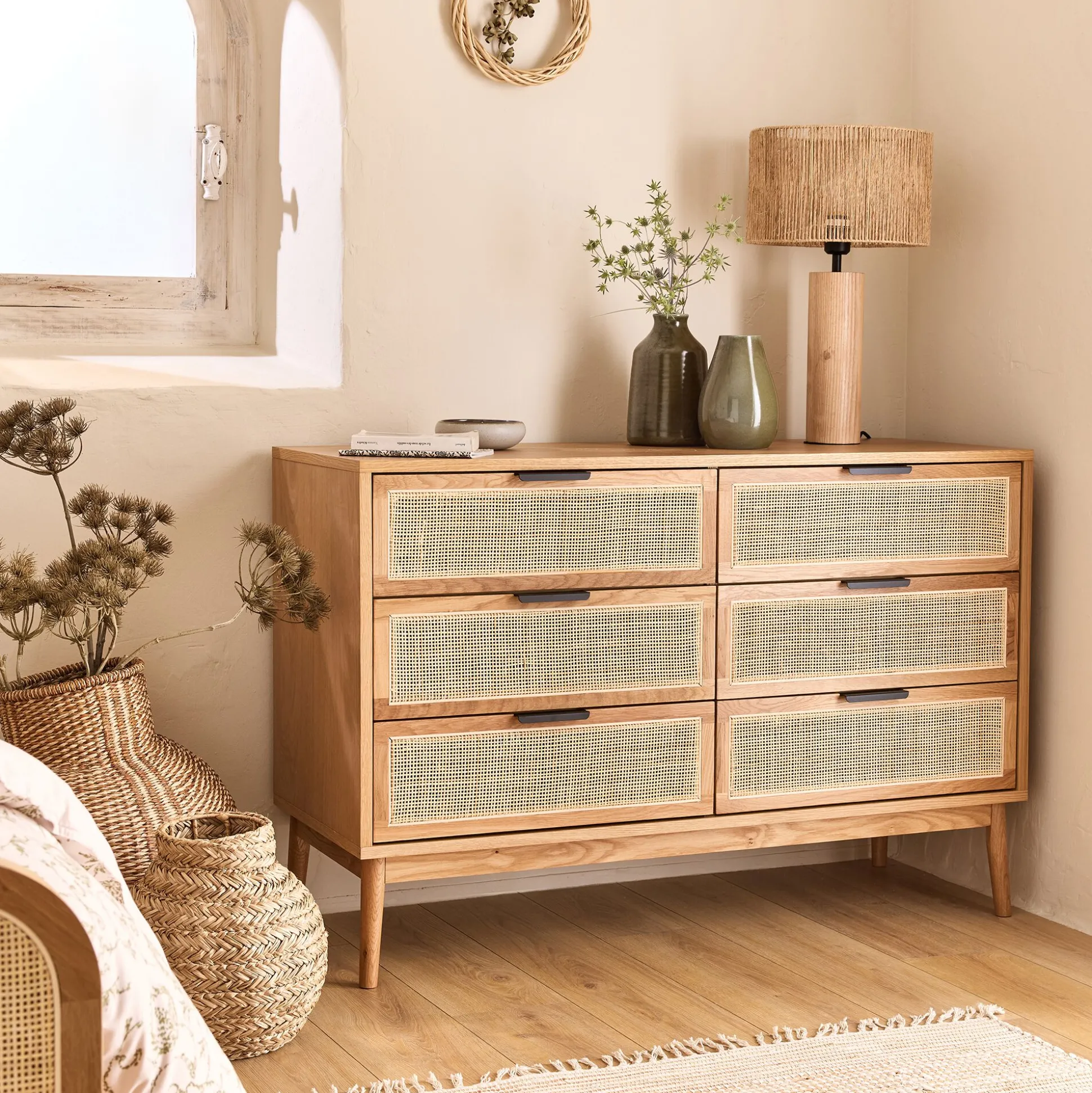 La commode est le mobilier idéal pour optimiser votre intérieur et créer un espace de rangement supplémentaire. Le modèle Callista propose 6 grands tiroirs, parfaits pour ranger vos affaires. Cette commode en bois présente un design intemporel et un coloris naturel, ainsi qu’une finition en cannage, ce qui en fait un véritable atout déco. Cette commode saura trouver sa place dans votre chambre à coucher.