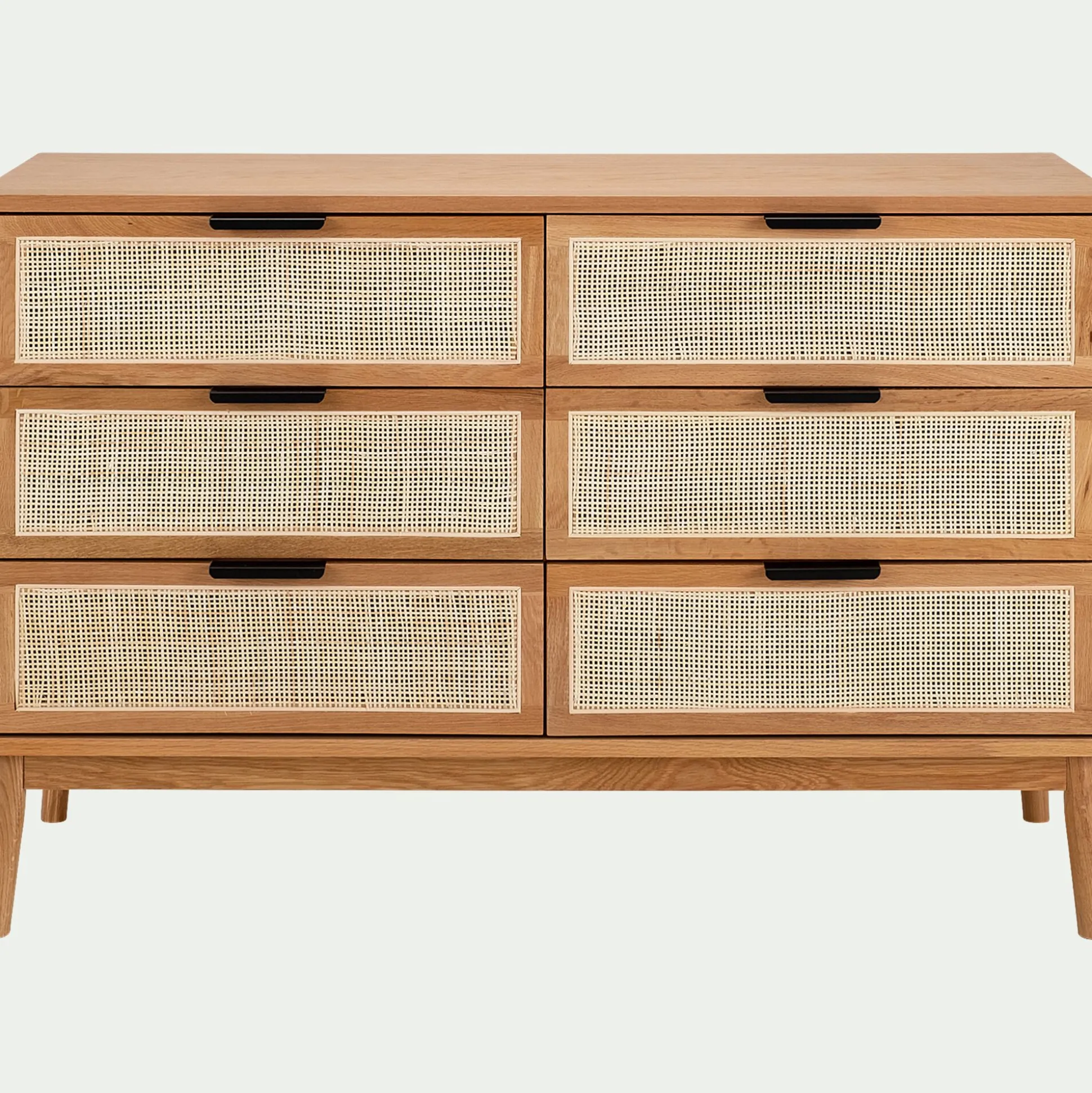 Chêne et MDF chêne plaqué, façade des tiroirs en canne naturelle.
