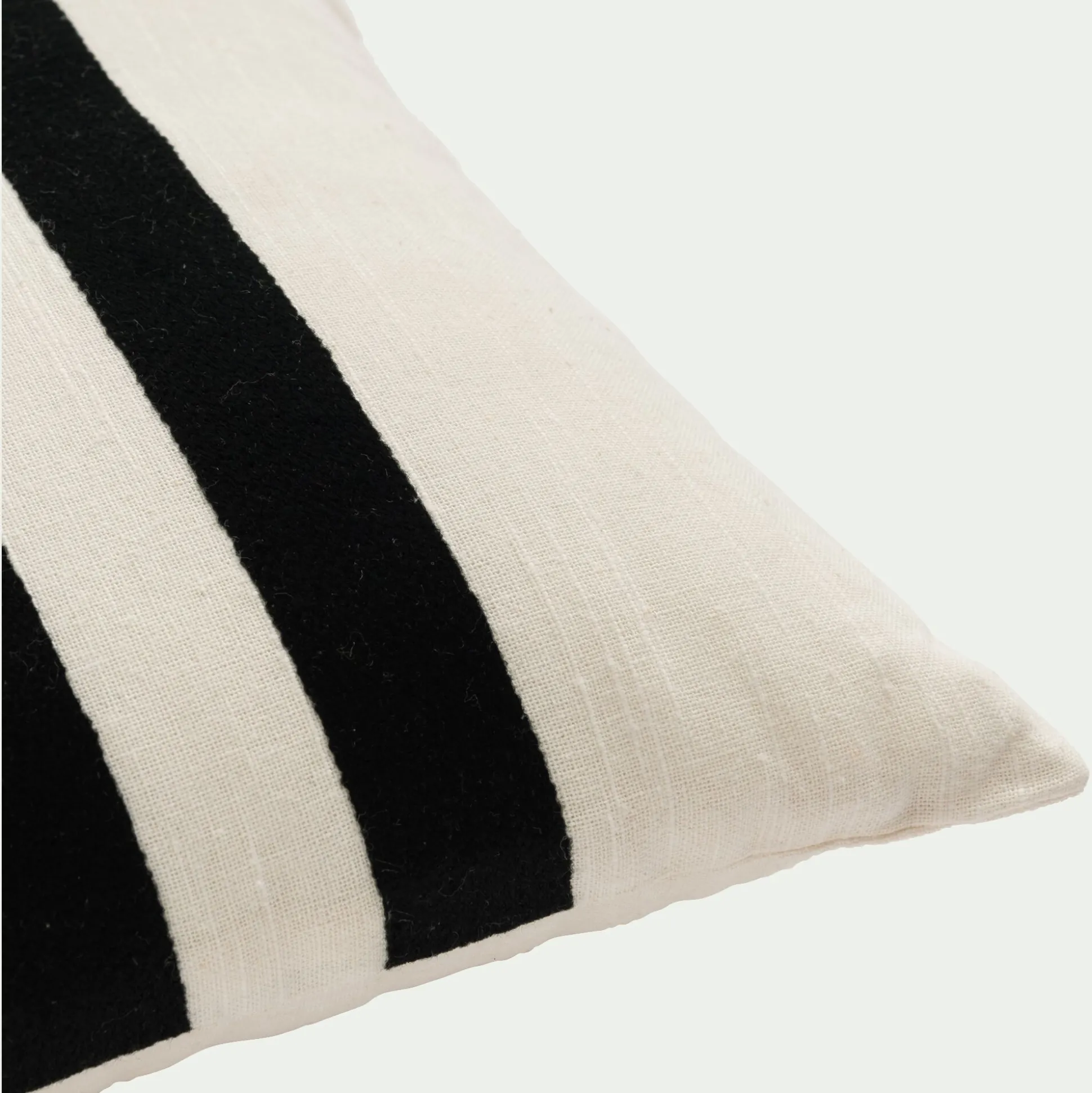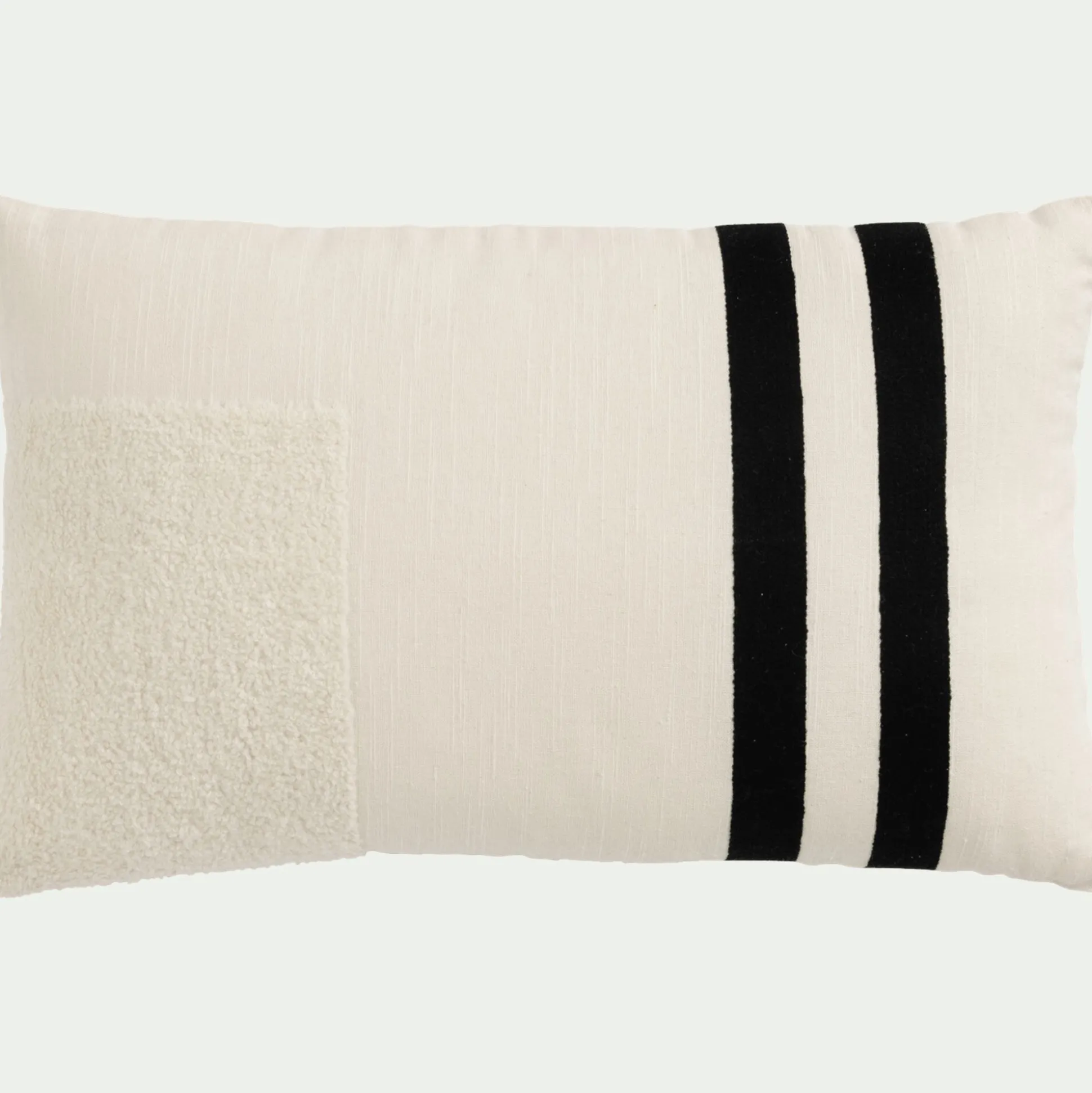A la fois confortable et décoratif, le coussin Tilva est parfait sur votre canapé. Ce coussin rectangulaire se compose d’une housse 100% coton et d’un garnissage épais adapté. Déhoussable, ce coussin déco se lave aisément en machine. Il arbore une couleur lumineuse et intemporelle : le blanc. Cette tonalité éclatante s’associe à tous les types de décoration. Cette belle housse est ponctuée de deux épaisses rayures noires, un détail simple qui permet de jouer le contraste. Ce coussin rayé présente une finition tuftée sur un angle, un effet moutonné qui apporte de la texture à l’ensemble. Ce coussin à motifs de 30×50 cm vous accompagne lors de vos moments de détente pour un plaisir décuplé.
