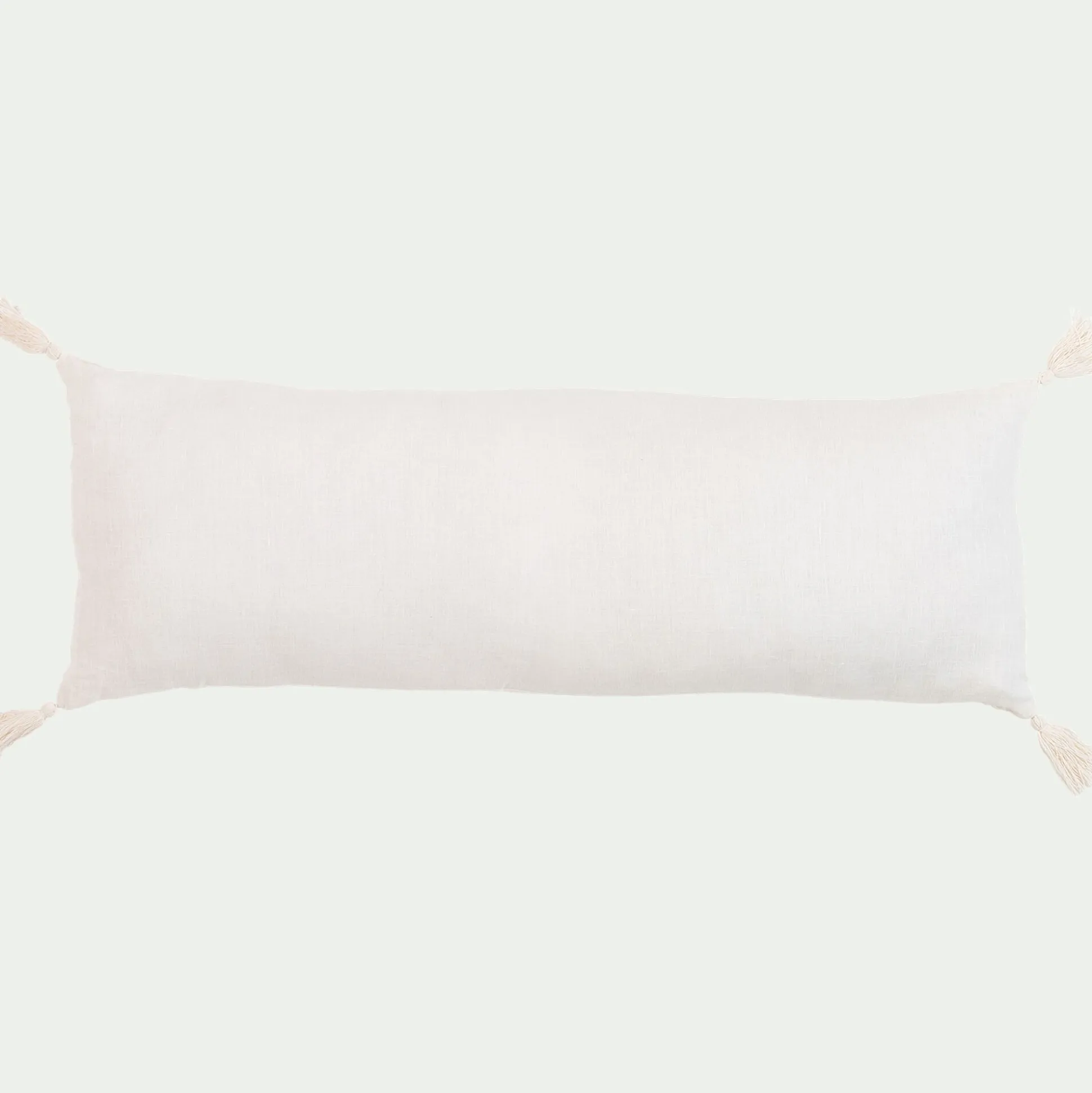 Ce joli coussin rectangulaire est doté d’une belle housse blanc ventoux en lin. Avec ses finitons en pompons aux extrmistés, il ajoute une touche décorative à votre intérieur. Disposé sur un canapé gris ou un canapé en cuir marron par exemple, ce coussin déco, en 30x80cm
