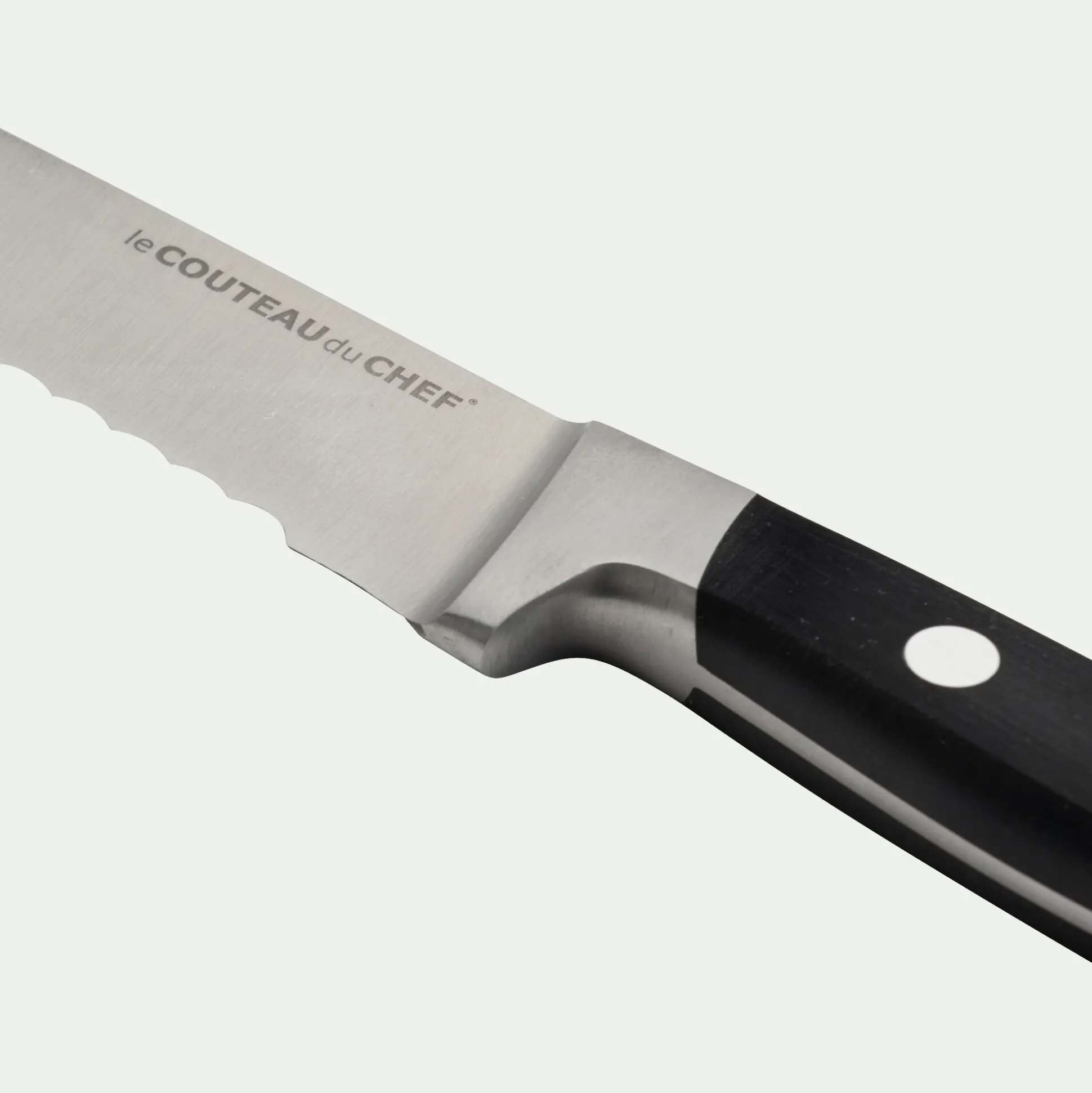 Pour équiper votre cuisine comme les plus grands, optez pour la ligne de couteaux Maite. Ce couteau à pain présente une lame forgée. Cette dernière offre un tranchant professionnel ainsi qu’une grande résistance au temps, aux chocs, à l’usure et à la corrosion. La lame en acier est régulièrement crantée pour vous permettre la meilleure coupe de votre pain. Ce couteau à pain professionnel est également dopé à l’azote, un procédé qui participe à sa performance et à sa solidité. Ce couteau à pain en métal s’accompagne d’un manche noir, ponctué de trois rivets en aluminium. Ces détails font de ce couteau un ustentile authentique, au design rustique.