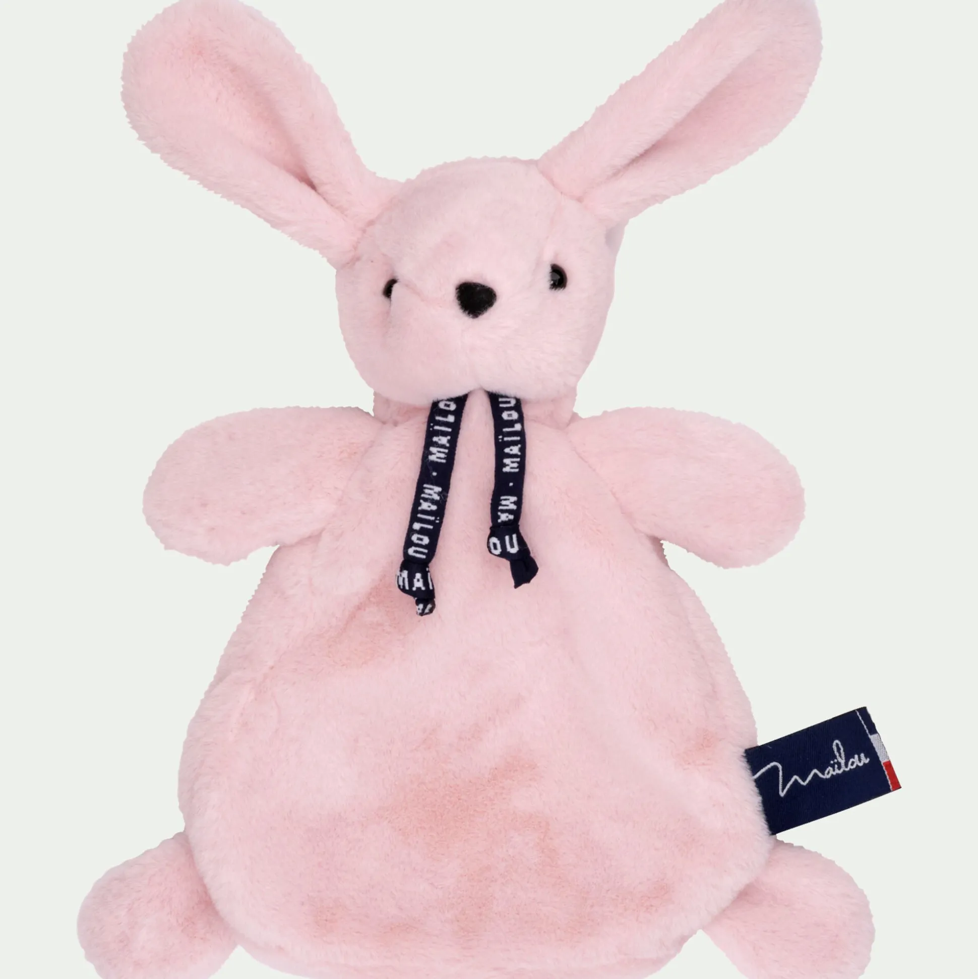 Ce doudou rose poudré représente un petit lapin, reconnaissable grâce à ses grandes oreilles. Ce doudou lapin est confectionnée avec une matière d’une infinie douceur, spécialement développée pour le confort des enfants. Il permet à votre minot de découvrir toute la richesse de la matière par le toucher. Fait à la main, ce doudou allie savoir-faire traditionnel de qualité, douceur et créativité. Votre bambin l’adoptera immédiatement. C’est aussi une belle idée de cadeau de naissance.