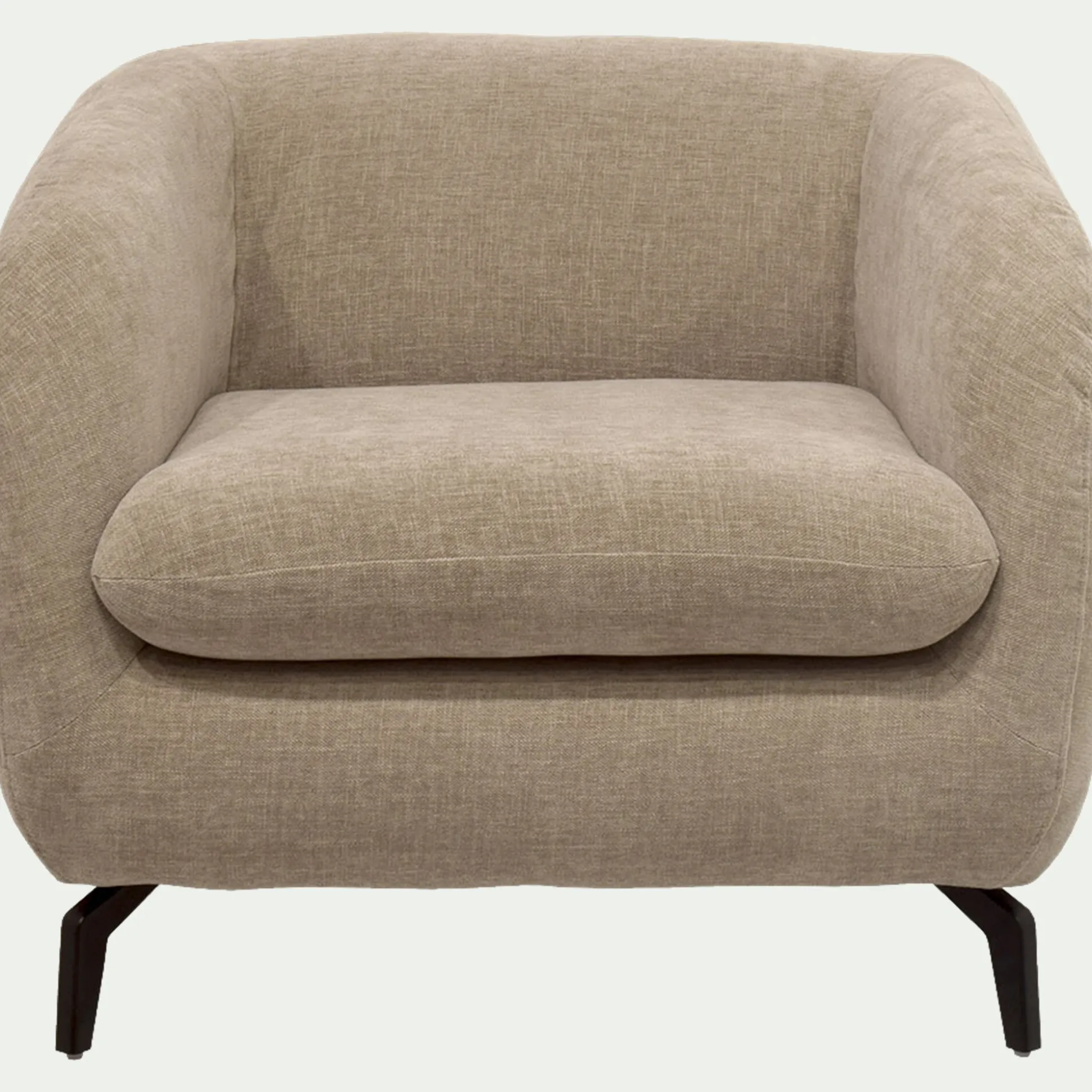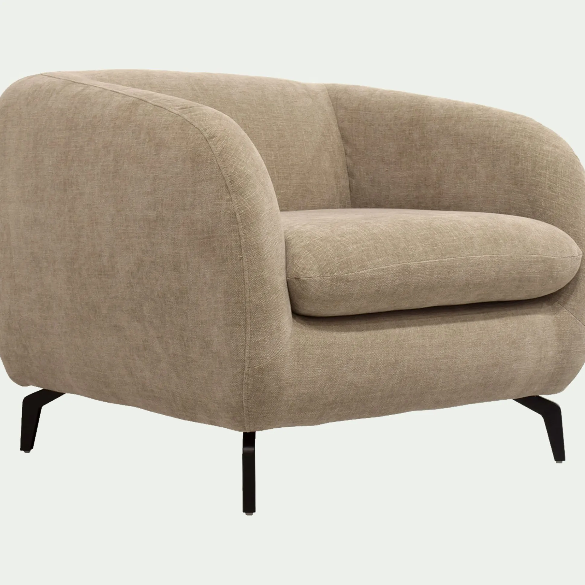 Un joli fauteuil en tissu doux pour profiter agréablement de votre salon. Un look contemporain et accueillant, sublimé par un piétement original en acier noir. Vous apprécierez la forme du dossier et des accoudoirs qui vous offrent un maintien optimal de votre dos pour un confort d’assise exceptionnel. Un fauteuil fabriqué en France, dans des ateliers proches de la ville de Bourge, qui incarne l’excellence du savoir-faire français. Un coloris gris beige qui apporte une note citadine et raffinée à votre déco de salon.