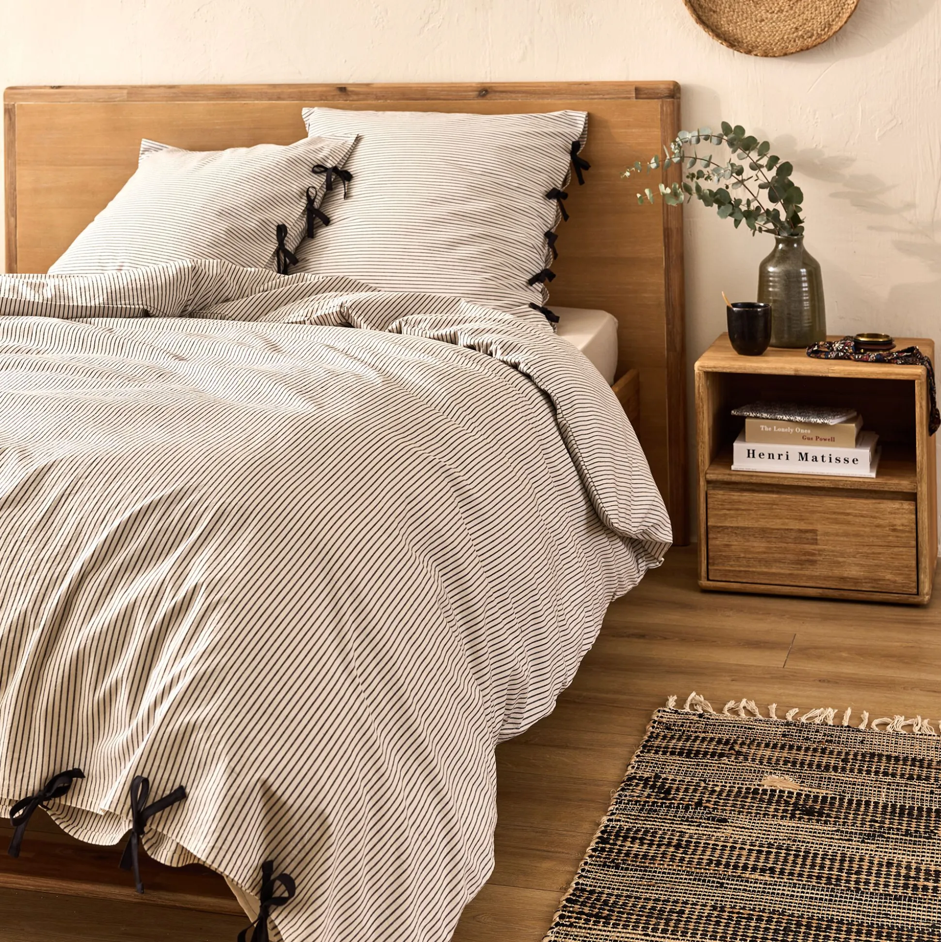 La housse de couette Maxine séduit par son allure à la fois simple et raffinée. Confectionnée en coton lavé certifié Oeko-Tex, elle offre une texture douce, souple et résistante. Son motif à fines rayures noires sur fond blanc incarne l’intemporalité et s’intègre aisément à tous les styles de chambre. La fermeture à nouettes, formée de jolis rubans épais, apporte une touche élégante et féminine à l’ensemble. Un linge de lit plein de charme, entre authenticité et modernité.