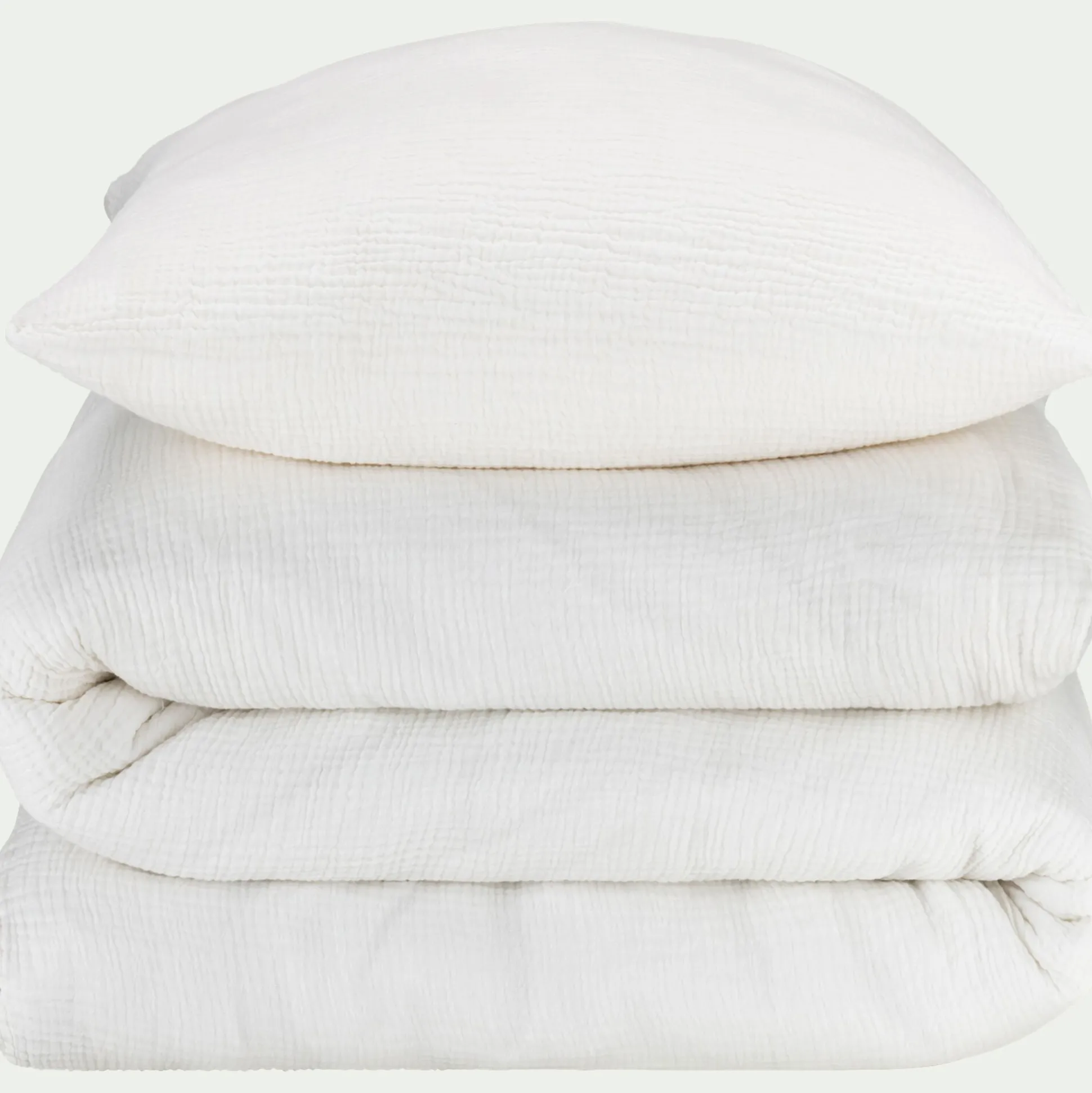 Faites de votre chambre un espace empreint de sérénité avec la parure de lit en double gaze de coton Baleti. D’un blanc immaculé, cette grande parure éclaire la pièce et lui confère un charme certain. Dans une texture naturellement aérienne et froissée, la double gaze de coton apporte du cachet à la déco. A la fois chic et bohème, c’est un tissu de grande qualité, très apprécié pour sa douceur. En effet, la double gaze glisse entre les doigts, tissu soyeux qui appelle à la détente. Cette parure unie se compose d’une grande housse de couette de 260×240 cm ainsi que de deux taies d’oreiller de 63×63 cm. Une belle harmonie dont la pureté berce doucement vos rêves.