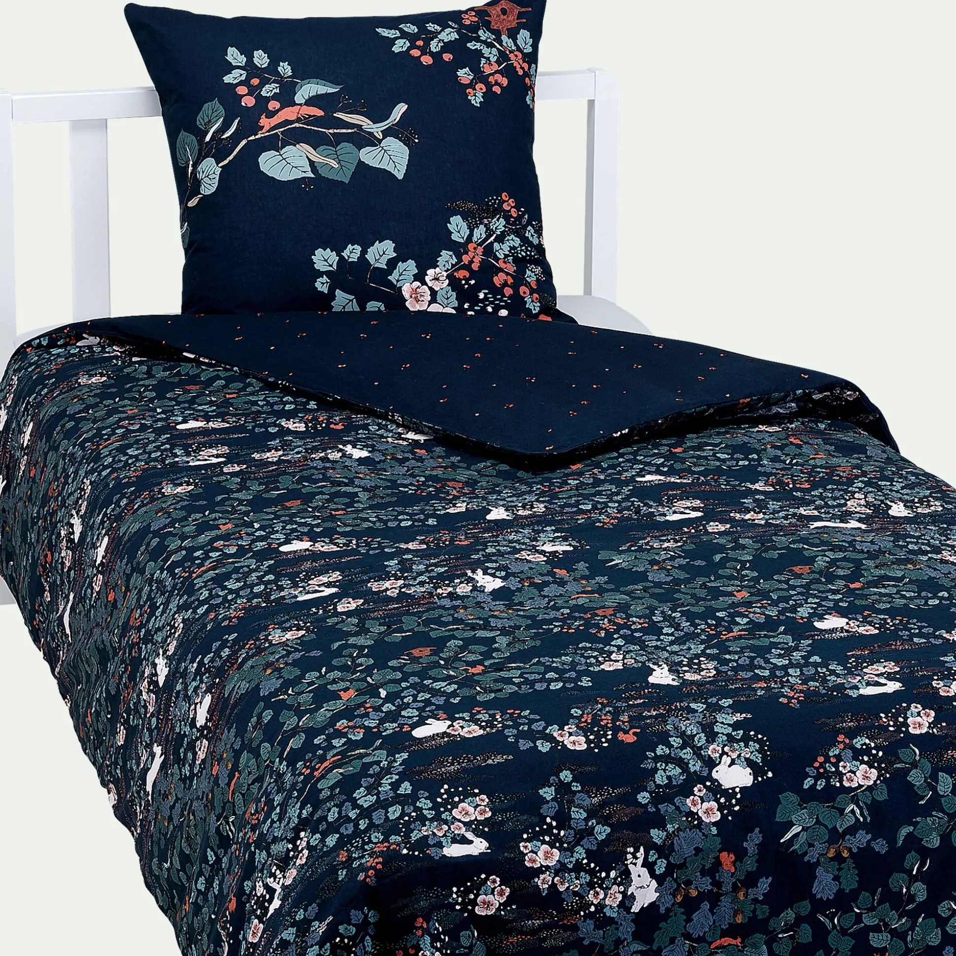 Cette parure de lit transportera votre enfant au coeur de la forêt au milieu d’êtres minuscules et d’animaux espiègles. Le motif de la housse de couette, inspiré d’une tapisserie des années 50, emmène dans le végétal pour rappeler les sous-bois à la lueur du soir. Réversible, l’histoire se poursuit au verso avec des motifs plus doux, plus léger. La décoration de chambre de votre marmot sera mise en valeur grâce à cette housse de couette et la taie d’oreiller pour une déco élégante.