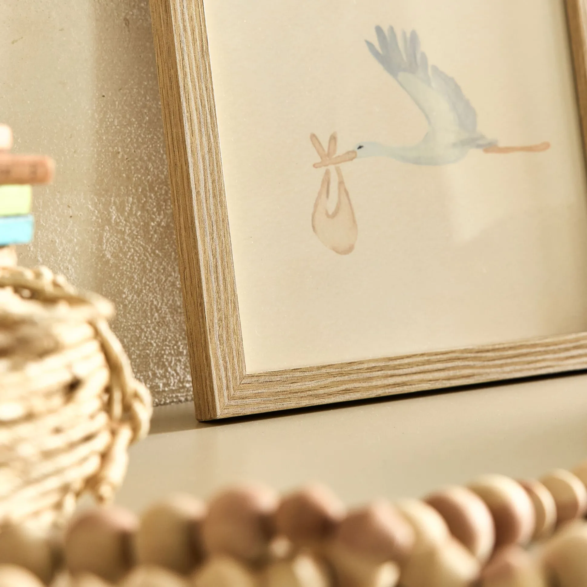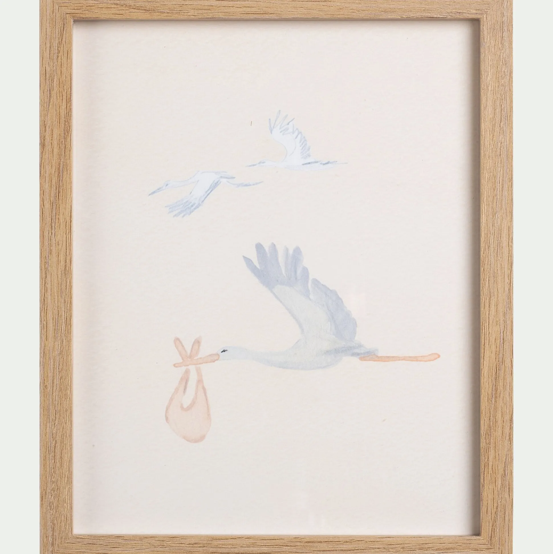 Dans un ciel tendre aux teintes pastel, trois cigognes graciles volent en formation, portant un bébé emmailloté avec délicatesse. Cette illustration pleine de poésie évoque la magie des premiers jours avec douceur. Dans un cadre en bois de 22×27 cm, cette image trouve naturellement sa place au mur d’une chambre bébé, pour une touche décorative à la fois légère et émouvante.
